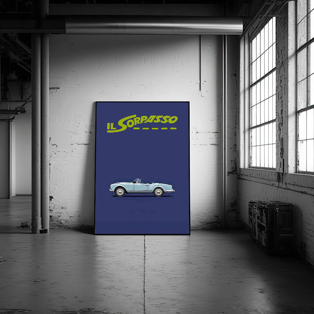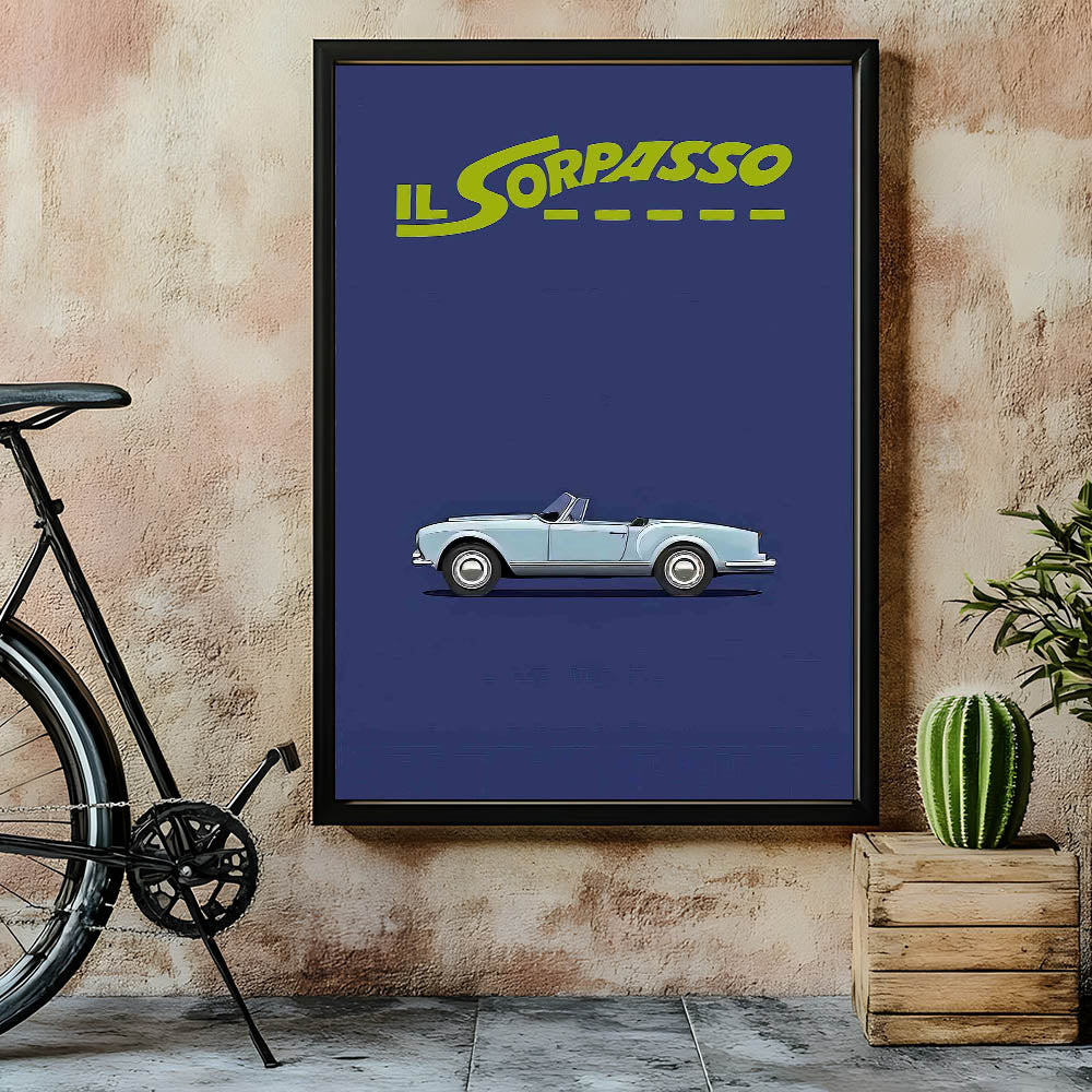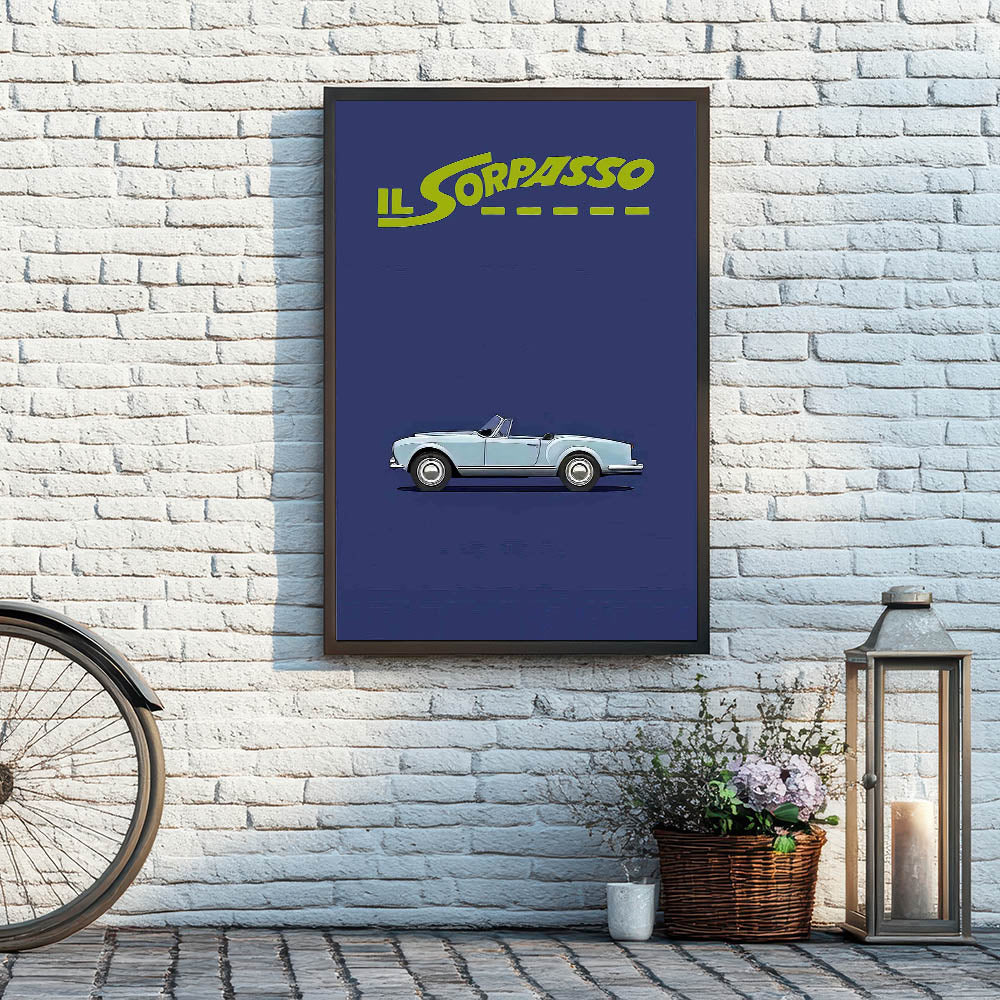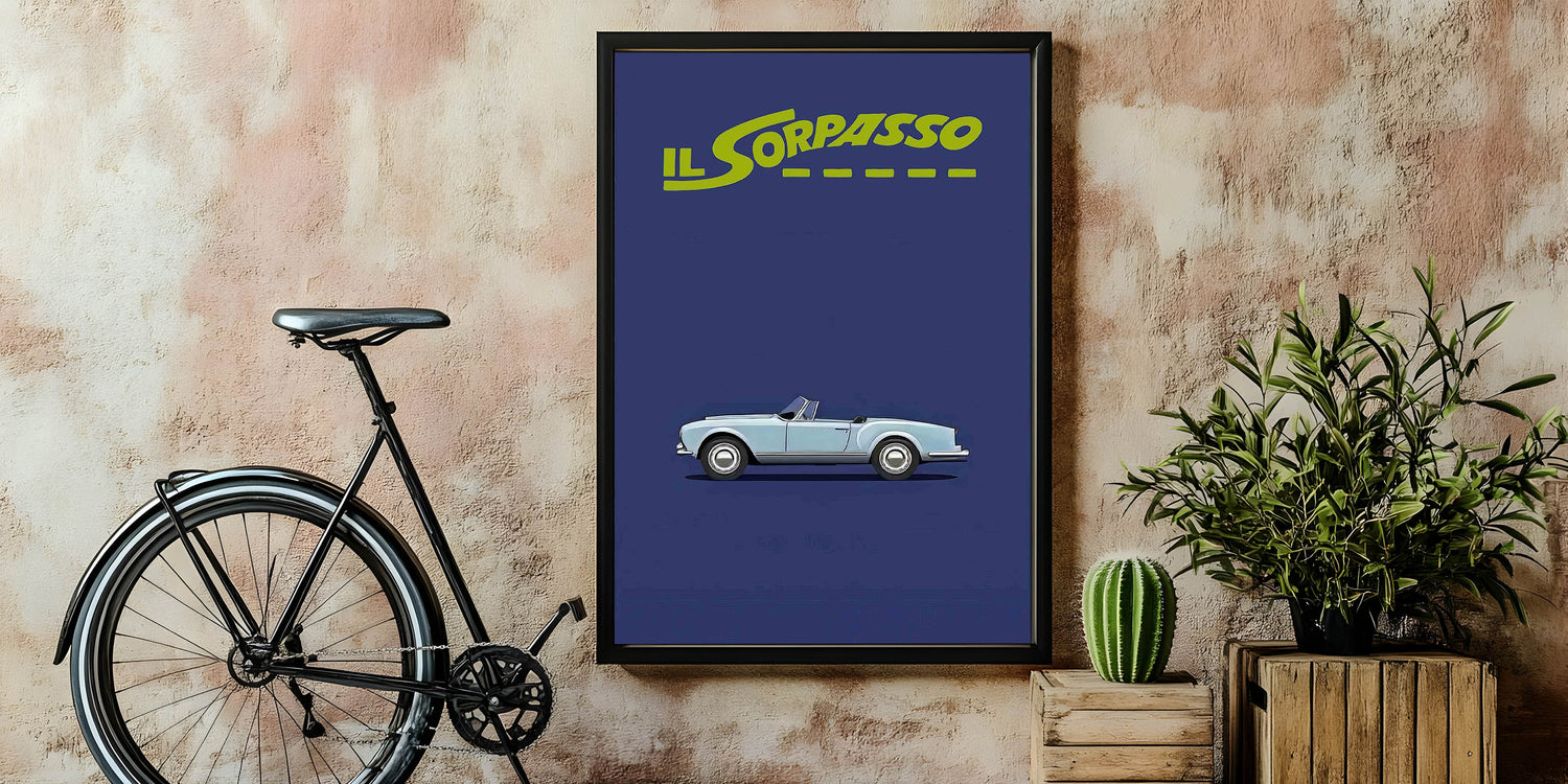 This timeless art piece is a perfect tribute to classic Italian road movies and vintage style. Own a piece of cinematic history with this Il Sorpasso movie poster.