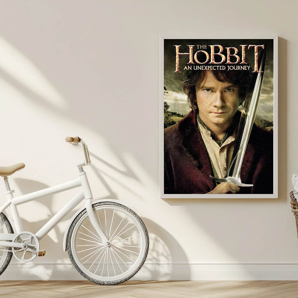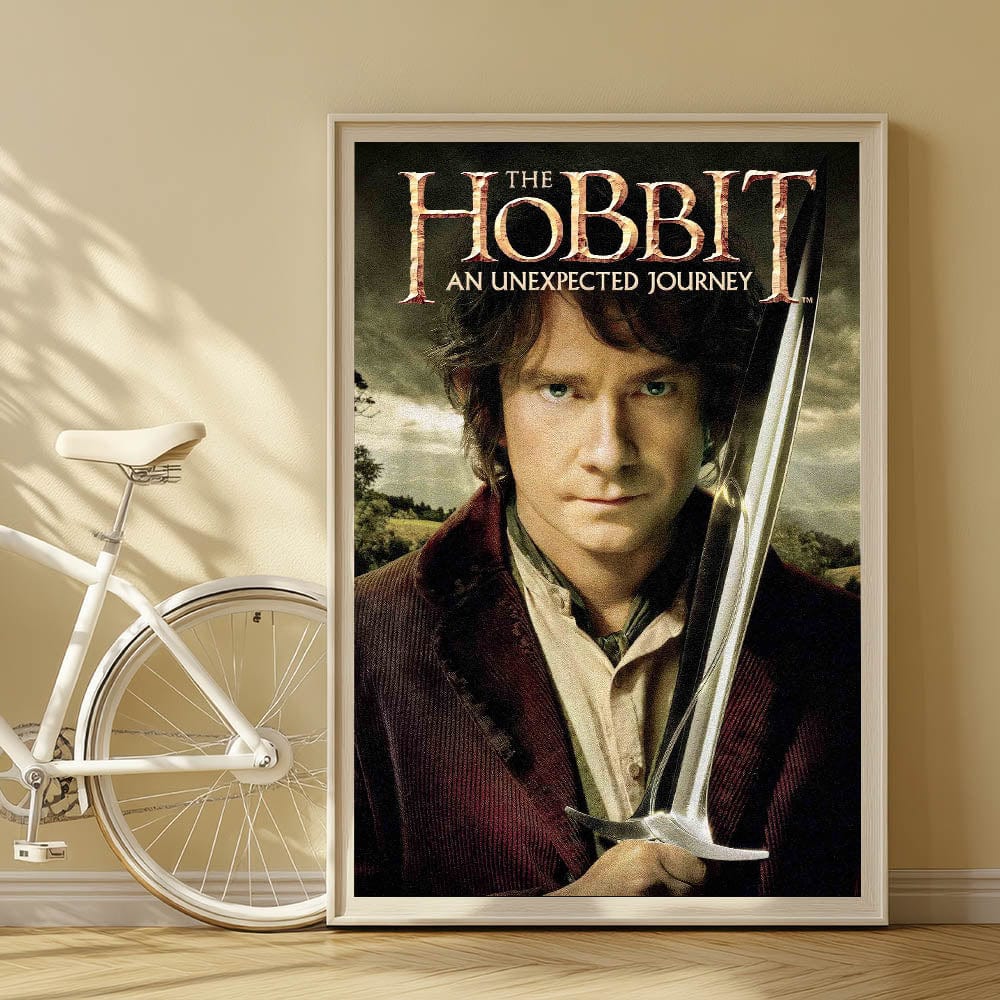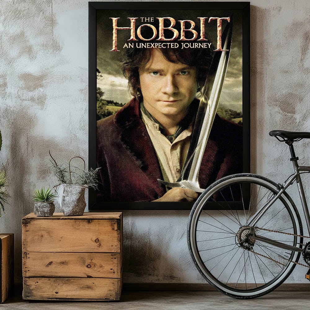 Step into the world of Middle-earth with this vintage 2010s movie poster from The Hobbit: An Unexpected Journey. This iconic 2010s cinema art showcases Bilbo Baggins gripping his sword, Sting, as he embarks on an unforgettable adventure. With its rich textures and classic movie poster print style, this piece is a must-have for fans of retro cinema wall art.