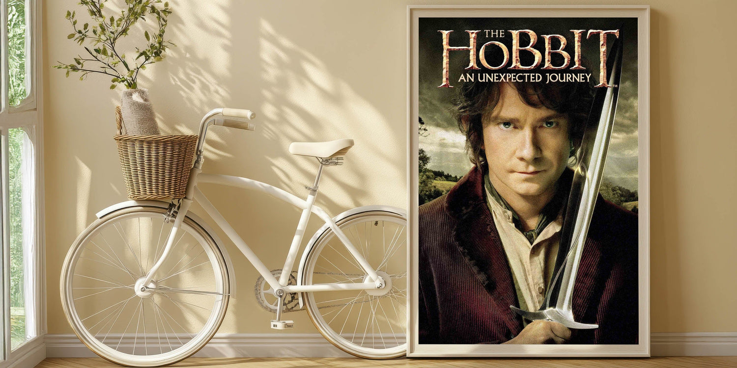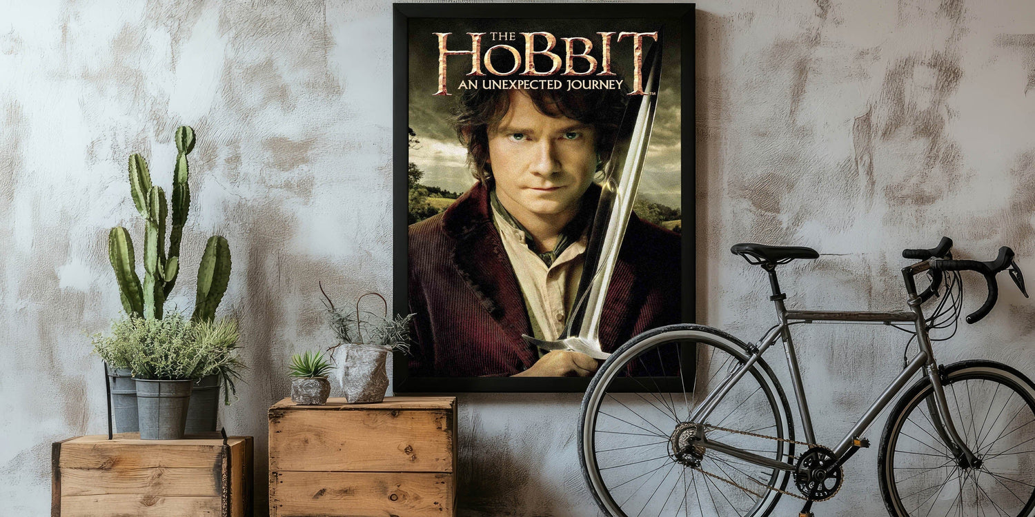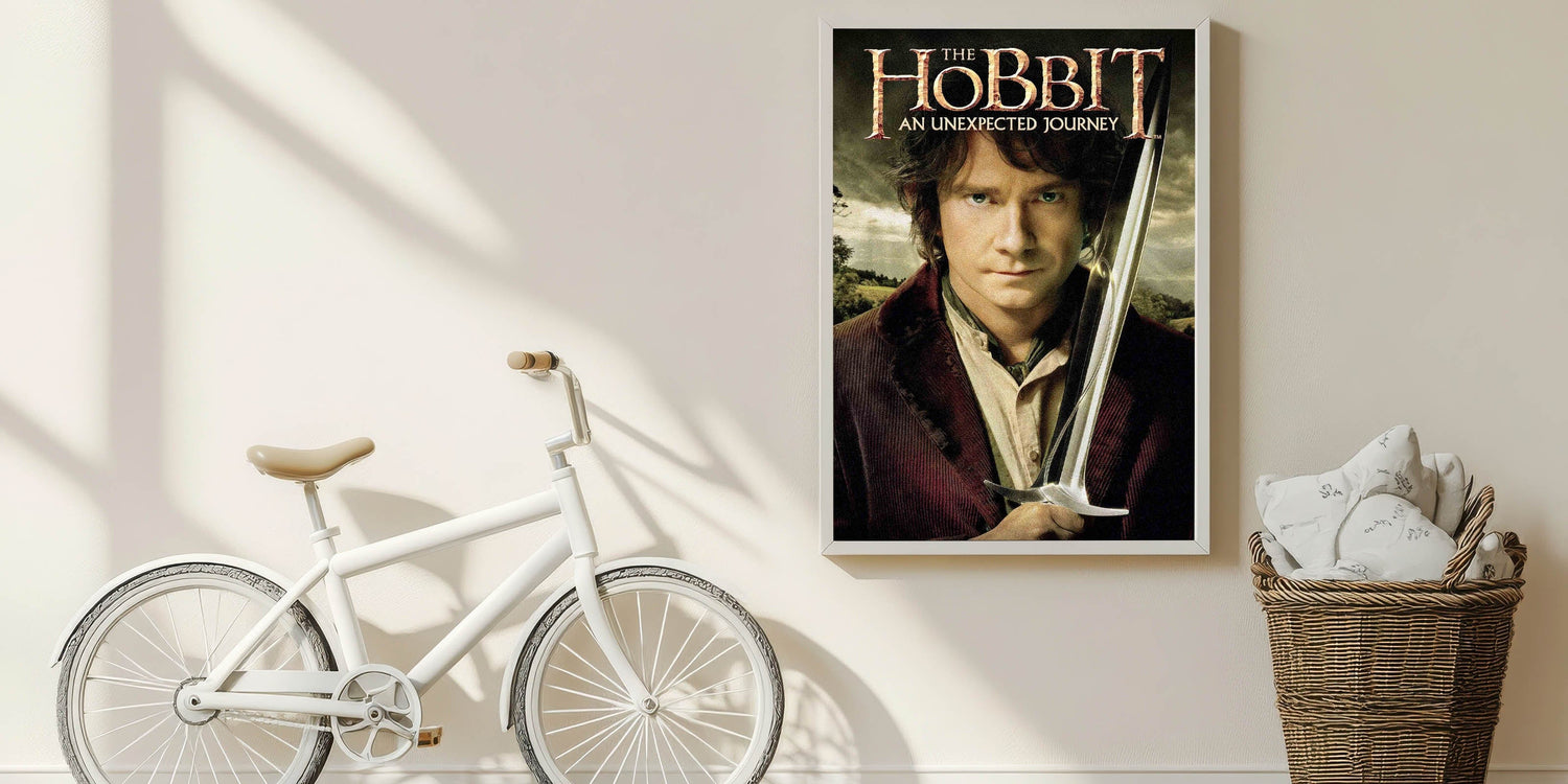 Step into the world of Middle-earth with this vintage 2010s movie poster from The Hobbit: An Unexpected Journey. This iconic 2010s cinema art showcases Bilbo Baggins gripping his sword, Sting, as he embarks on an unforgettable adventure. With its rich textures and classic movie poster print style, this piece is a must-have for fans of retro cinema wall art.