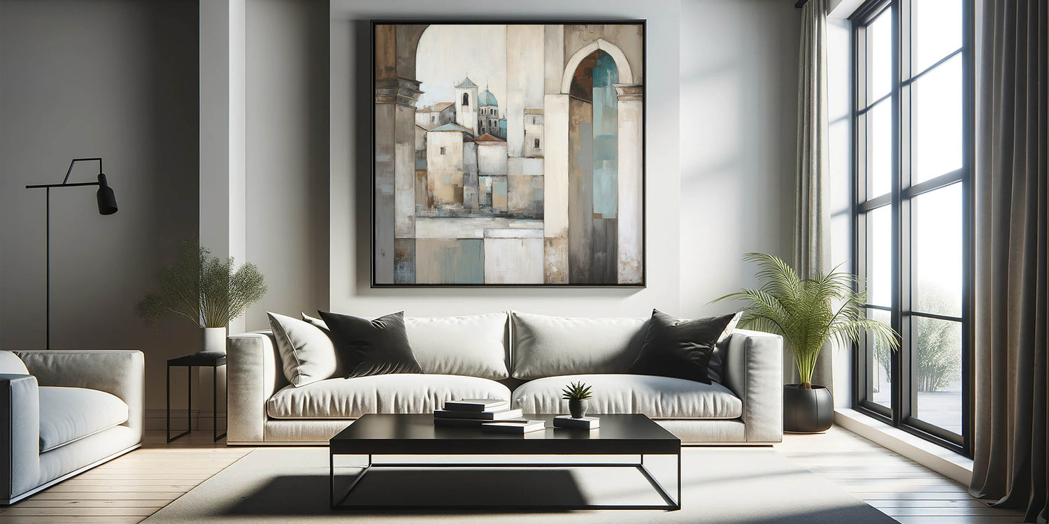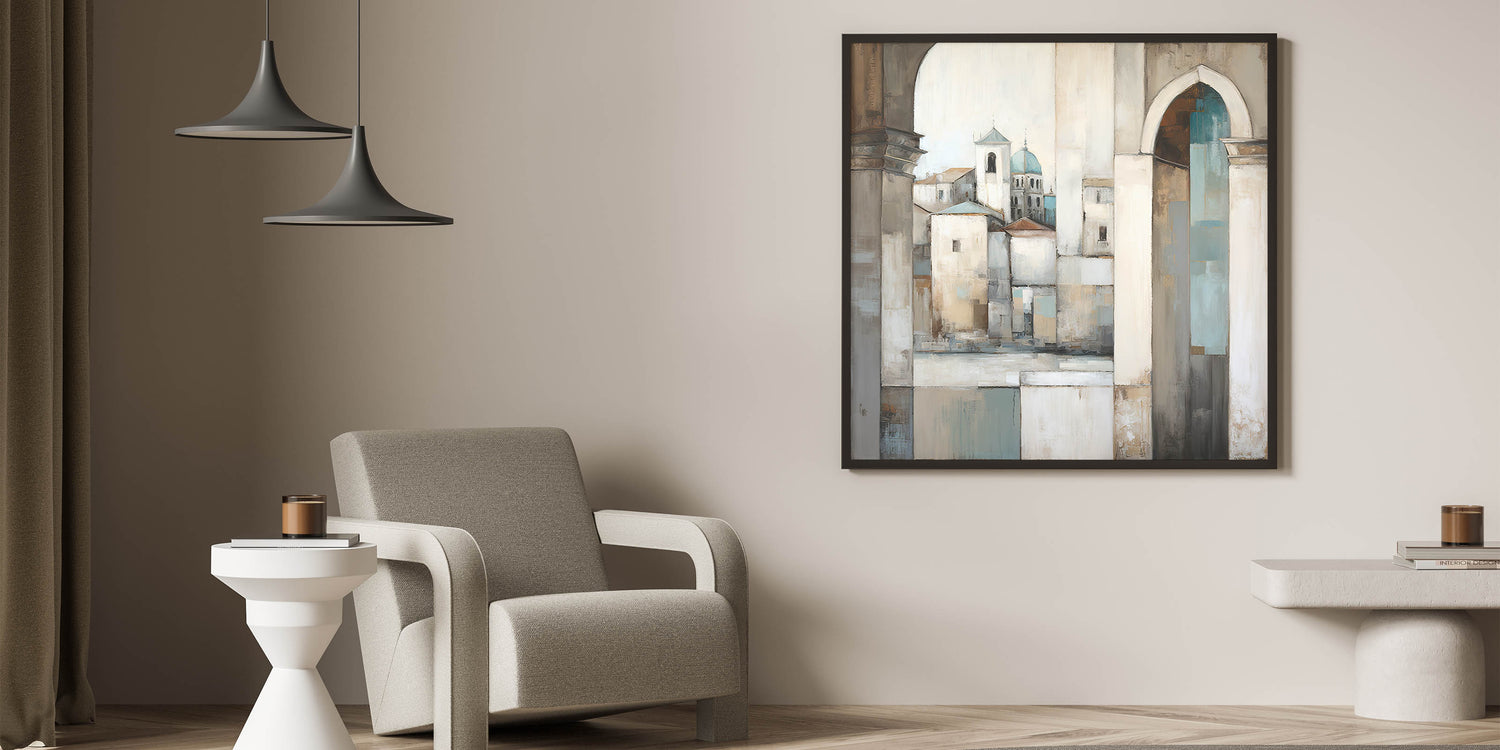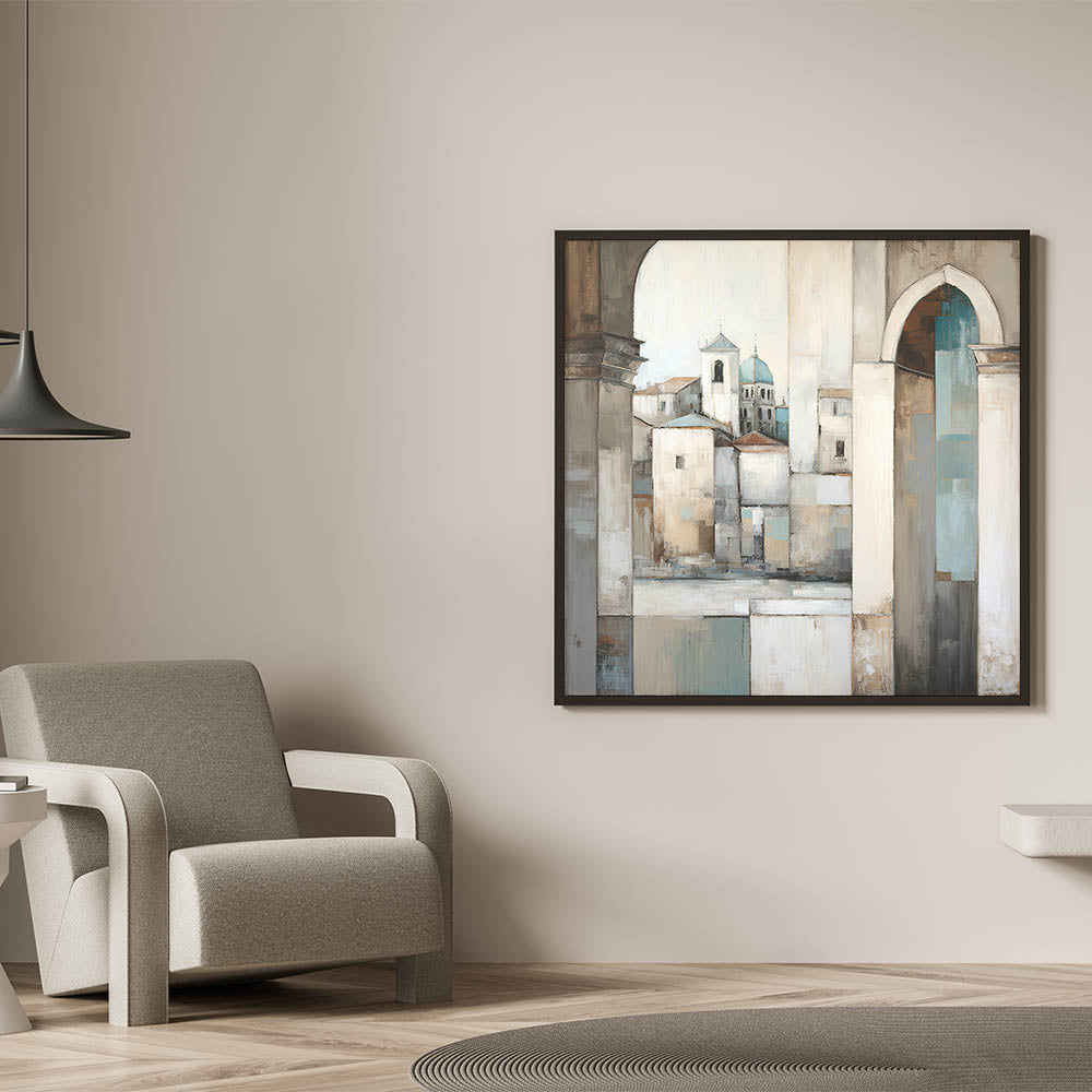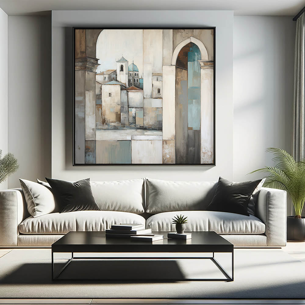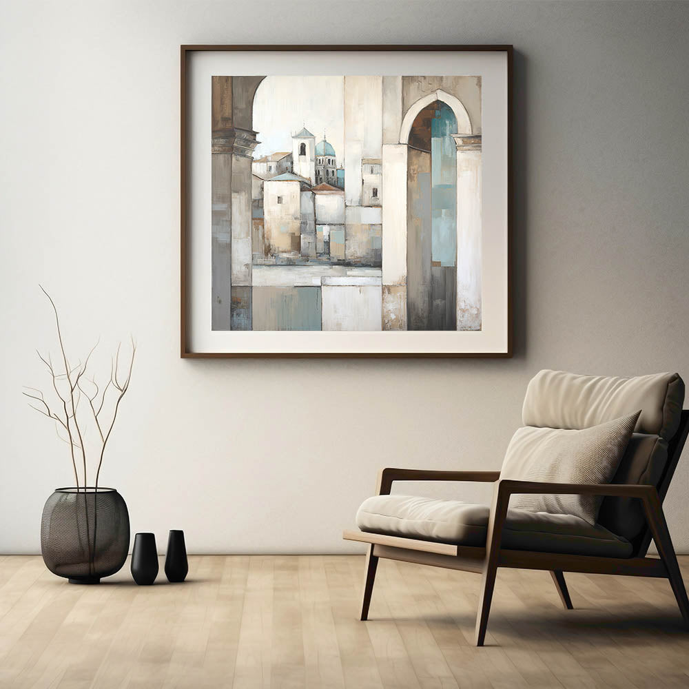 This architectural abstract artwork brings a timeless beauty to your home, blending classic Mediterranean charm with a modern aesthetic. Its serene color scheme and intricate details make it a versatile piece, ideal for enhancing both modern and traditional interiors.