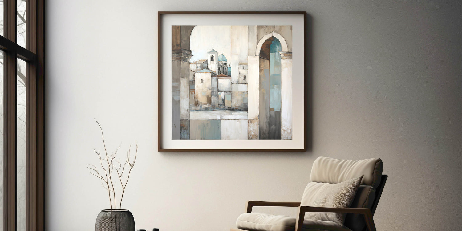 Capture the essence of Mediterranean architecture with this stunning abstract cityscape wall art. Featuring soft tones of blue, beige, and earthy neutrals, this artwork beautifully combines traditional and modern architectural elements. The arches, domes, and textured facades evoke a sense of history and charm, making this piece ideal for those who appreciate architectural beauty with a contemporary twist. Perfect for adding character and sophistication to any space.
