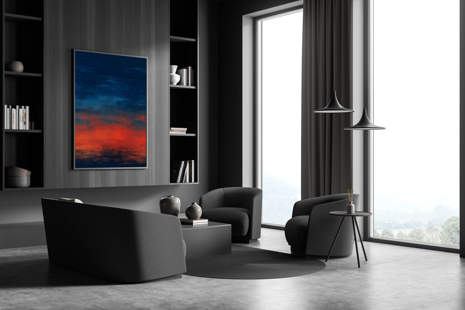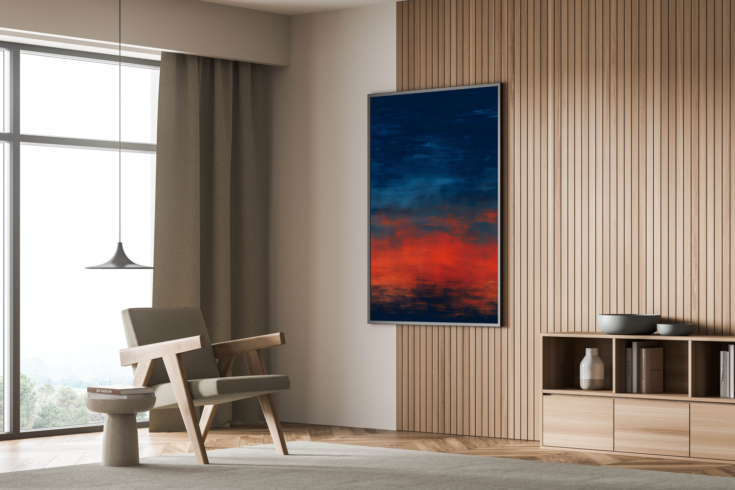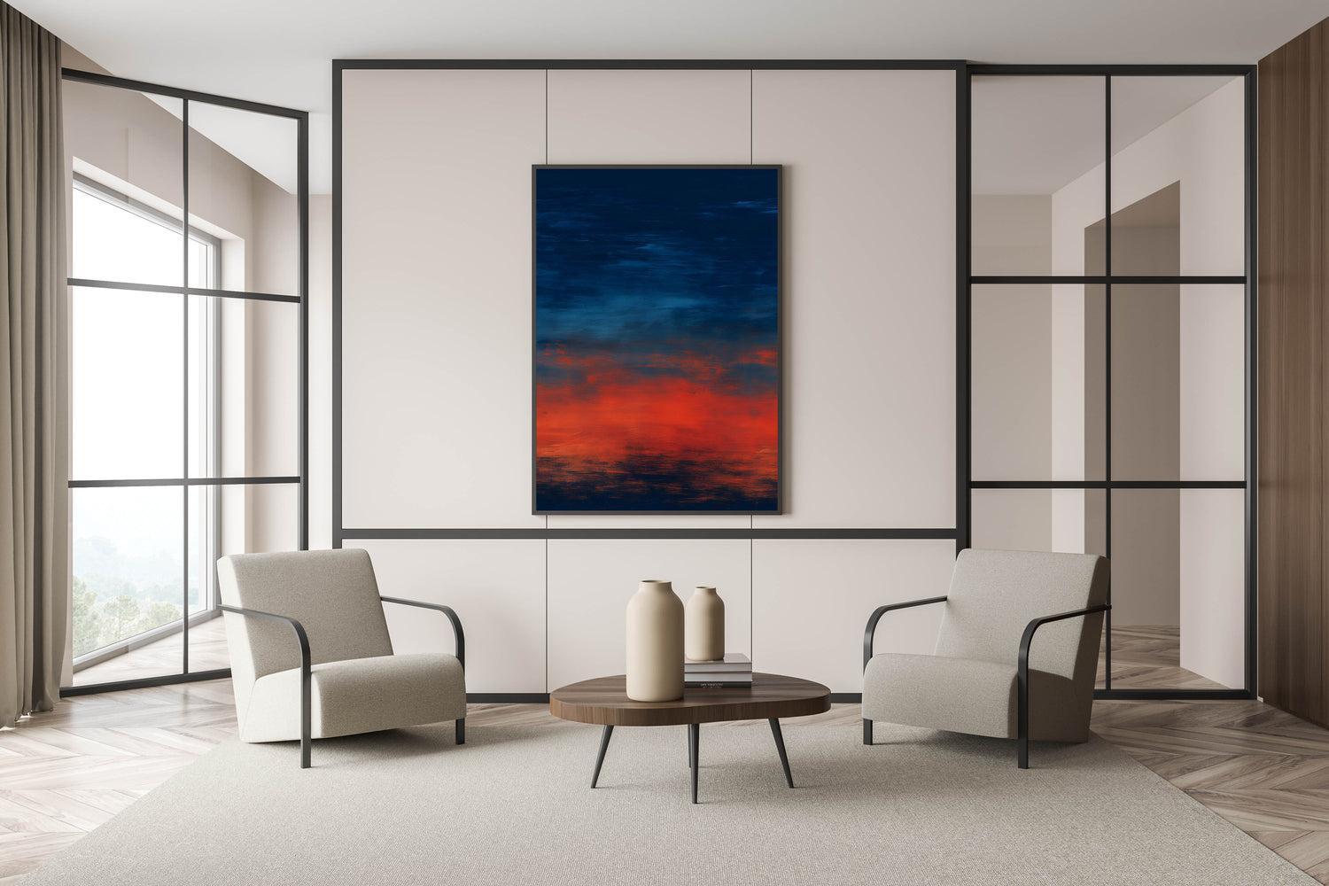 Immerse yourself in the beauty of the ocean with this abstract strokes wall art featuring deep blue and fiery red hues. This artwork captures the essence of a sunset over water, with vibrant brush strokes that create a dramatic yet calming effect. Ideal for contemporary and coastal decor, this piece adds warmth and depth to any room, making it a stunning focal point for living spaces or offices.