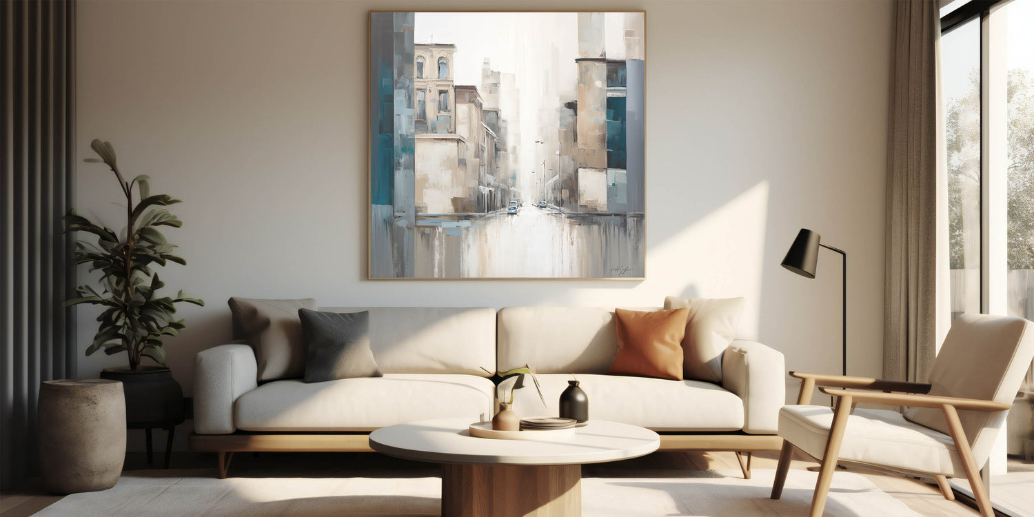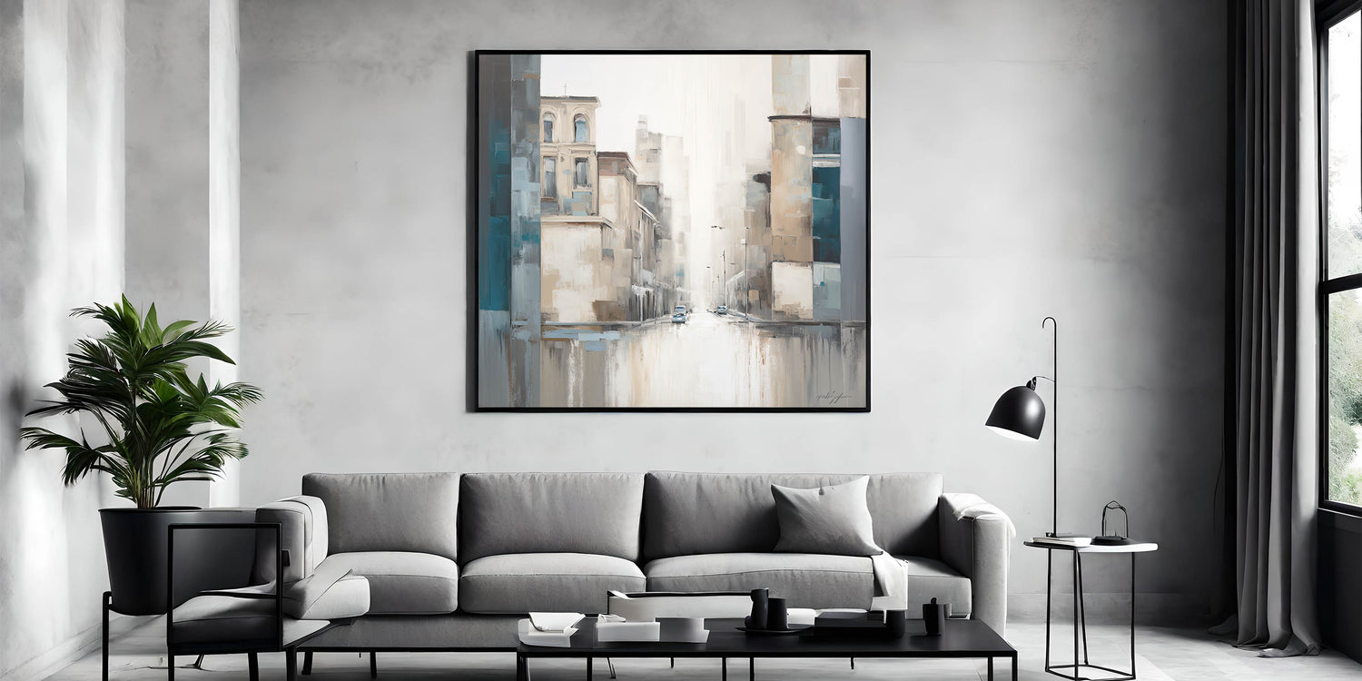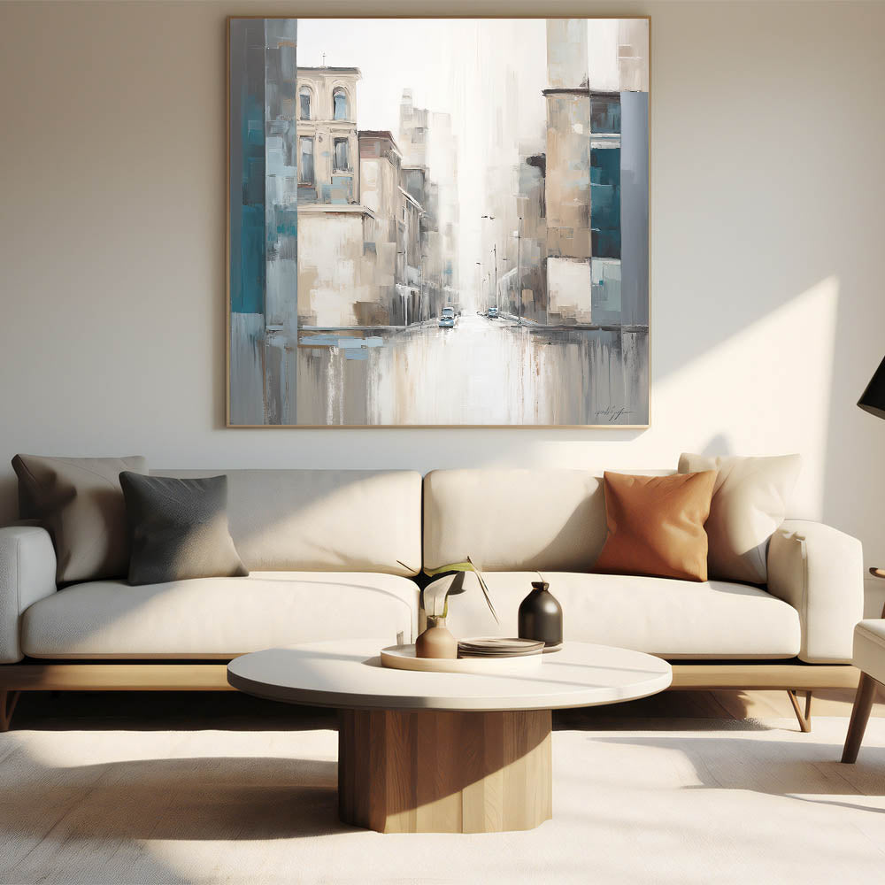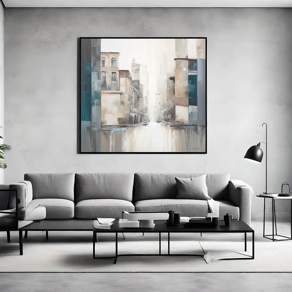This architectural wall art piece showcases a serene urban landscape, perfect for those who appreciate contemporary architectural wall art with a minimalist touch. The harmonious blend of soft grays and beiges creates a peaceful yet impactful visual statement, making it suitable as a standalone piece or as part of a gallery wall.
