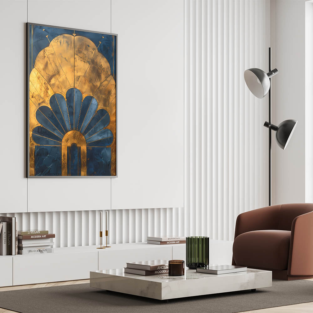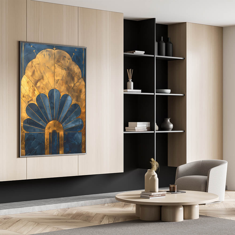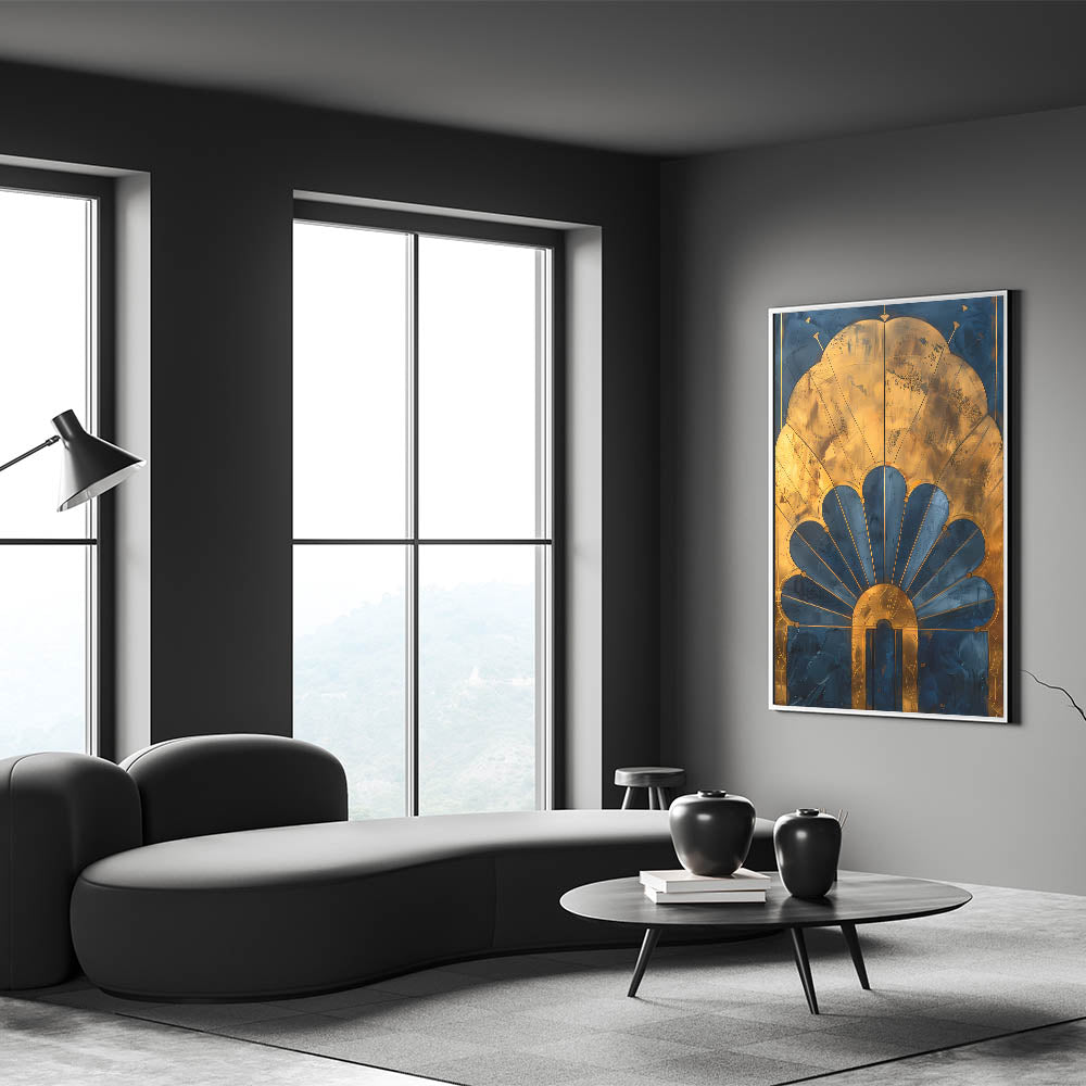 Add a touch of luxury and sophistication to your decor with this Art Deco-inspired minimalist illustration. Featuring a rich palette of deep navy and radiant gold, this design captures the timeless elegance of Art Deco patterns. The intricate gold detailing set against the dark background brings a sense of grandeur, making this piece a striking focal point in any room.