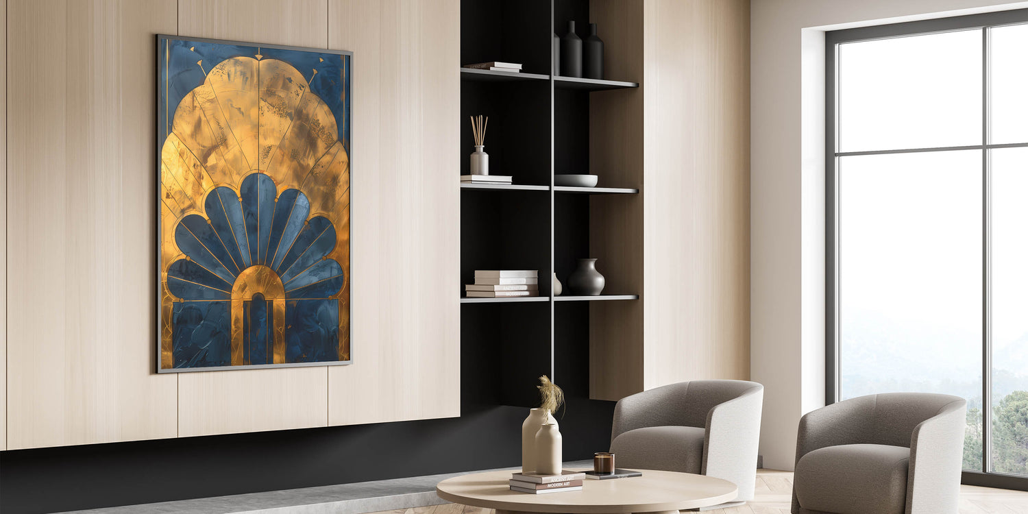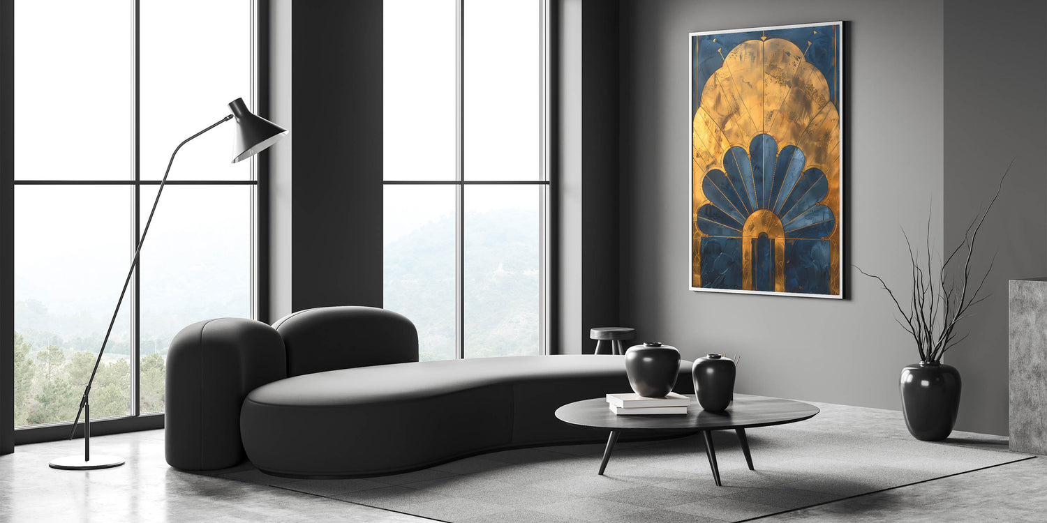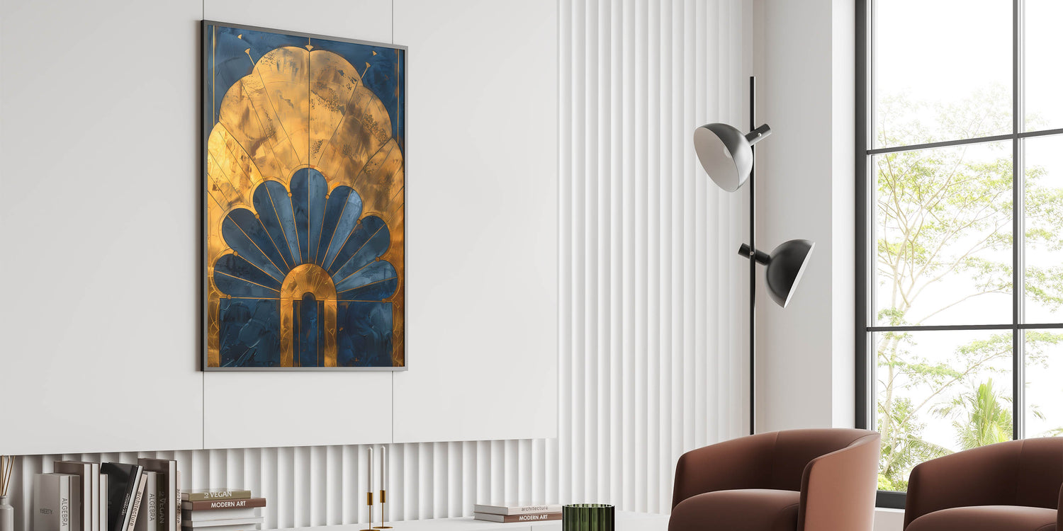 Add a touch of luxury and sophistication to your decor with this Art Deco-inspired minimalist illustration. Featuring a rich palette of deep navy and radiant gold, this design captures the timeless elegance of Art Deco patterns. The intricate gold detailing set against the dark background brings a sense of grandeur, making this piece a striking focal point in any room.