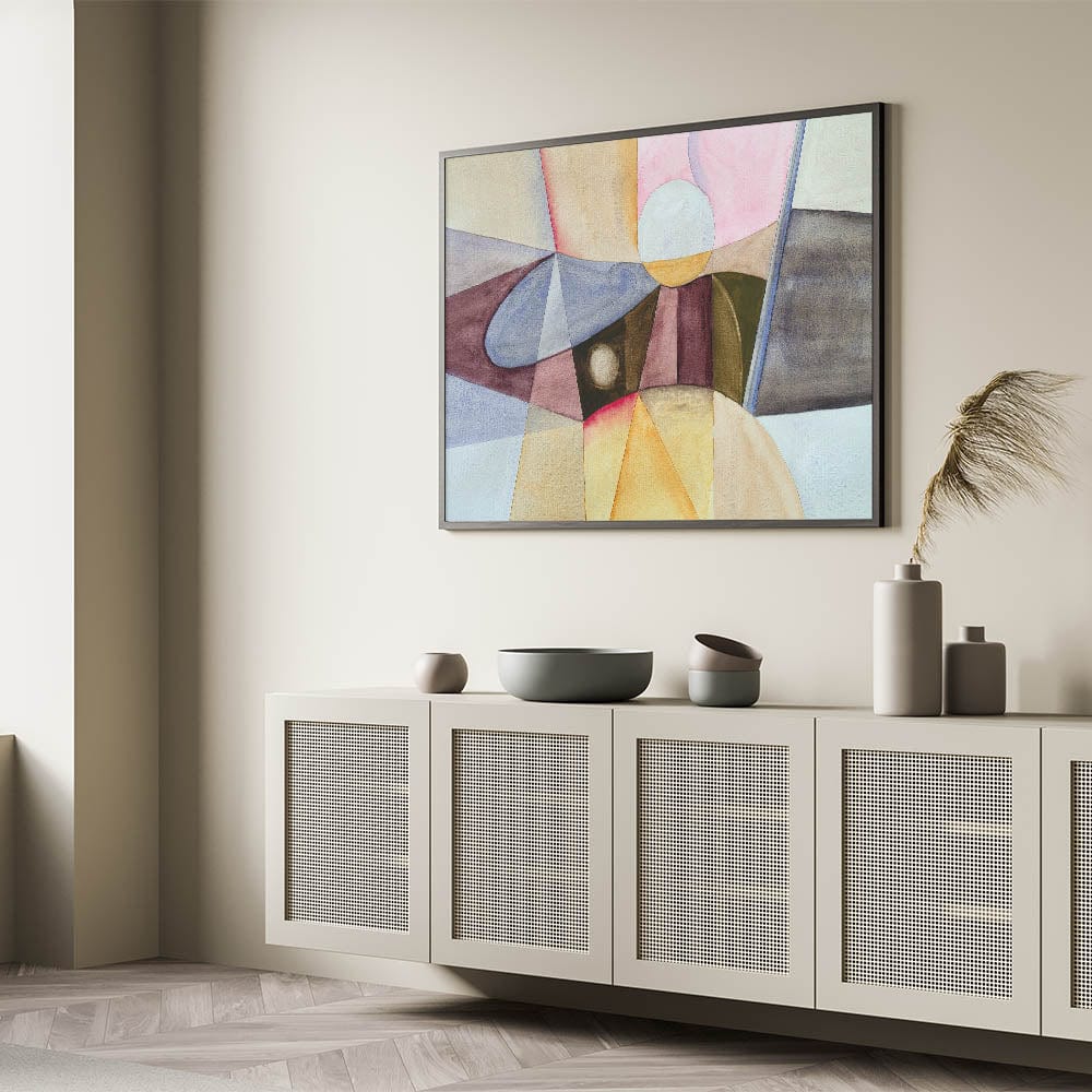 Bring a touch of modern elegance to your space with this contemporary abstract art, featuring a delicate mix of pastel pink, lavender, mustard yellow, and earthy brown. The geometric shapes and soft watercolor textures create a visually harmonious design, making this modern abstract painting a stunning focal point for any interior.