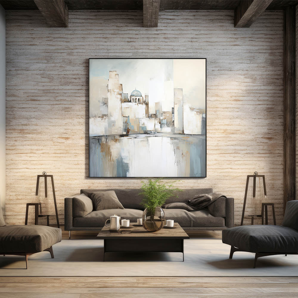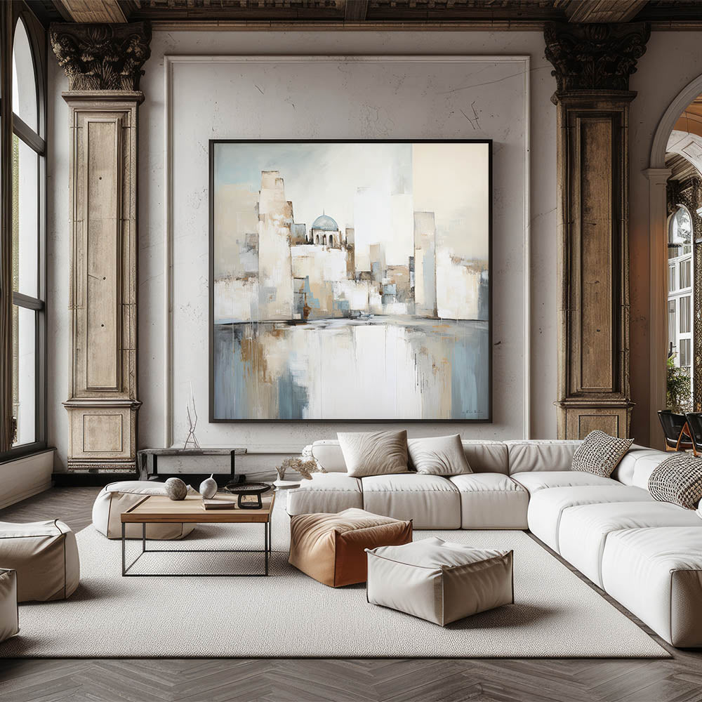 Introduce elegance and sophistication to your space with this Contemporary Architectural Wall Art. This piece depicts a serene cityscape with muted tones of beige, gray, and soft blue, creating a harmonious blend that suits any modern or minimalist interior. The design captures an urban ambiance with a refined architectural touch, making it perfect for enhancing living rooms, offices, or bedrooms.