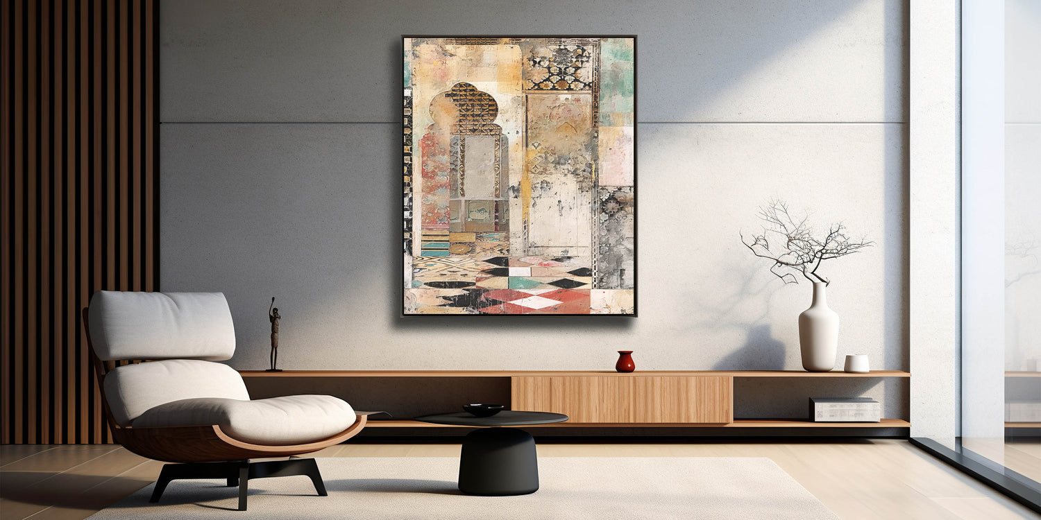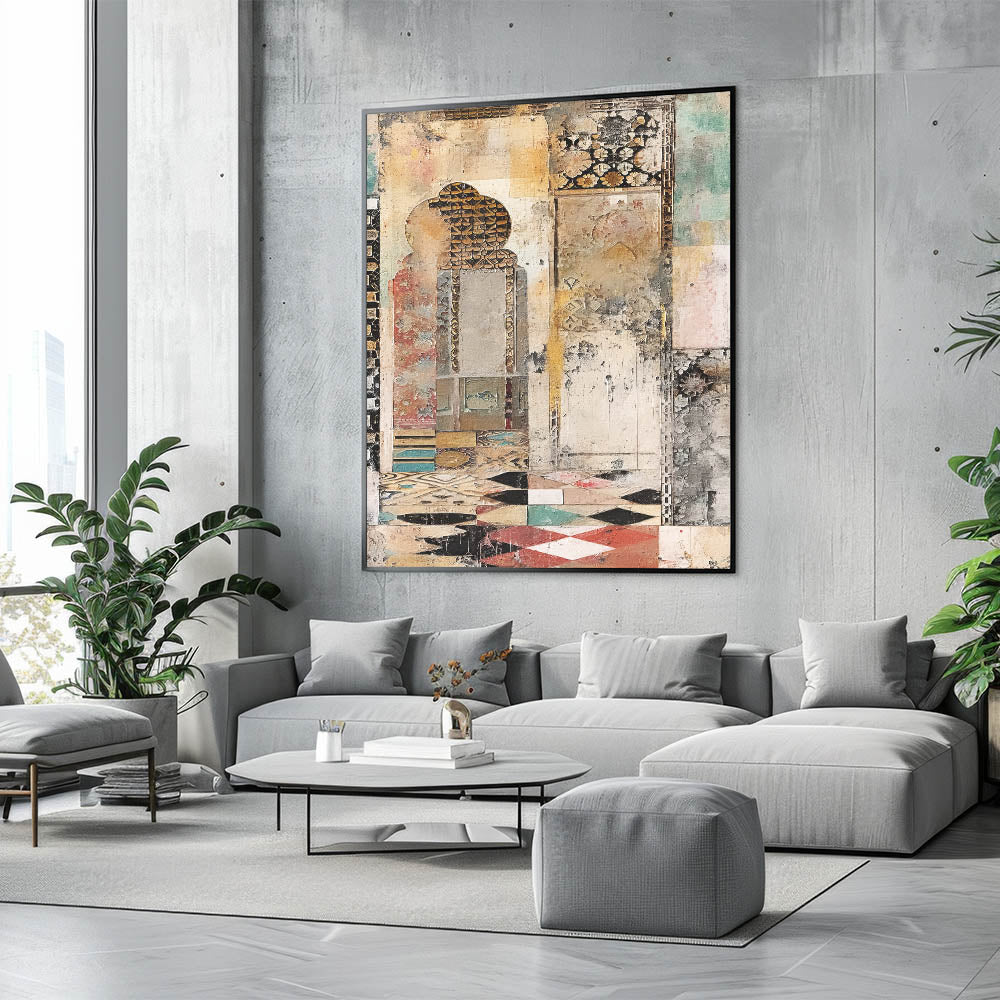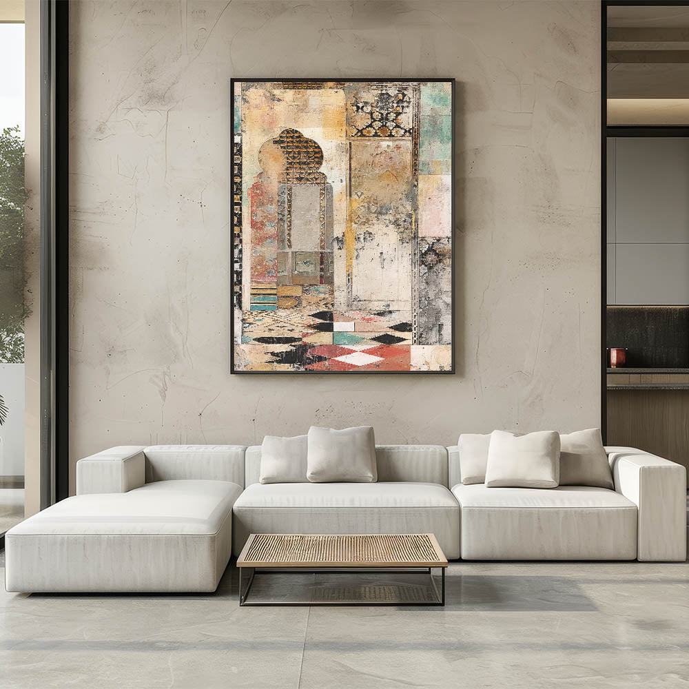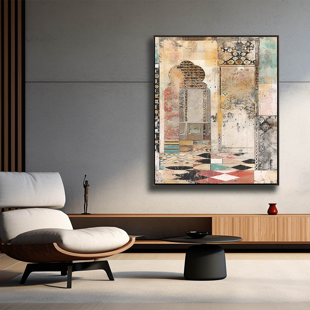 Enhance your décor with this eclectic abstract architecture canvas, blending intricate patterns and rich textures in shades of beige, gold, and teal. This artwork captures the essence of vintage architectural charm, making it an ideal piece for those who appreciate unique and artistic wall décor. Its warm, earthy tones and bold geometric details create a captivating focal point in any room.