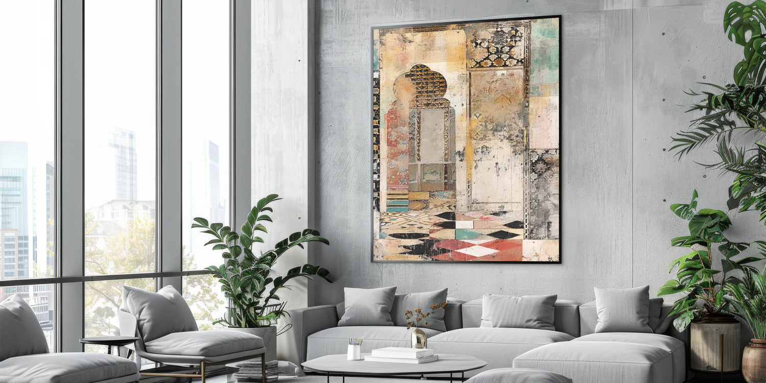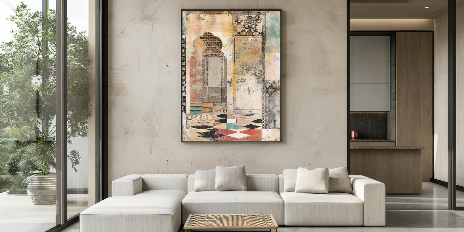 This abstract architectural print is perfect for adding character and depth to your living room, study, or hallway. Its blend of textures and harmonious colors invites warmth and sophistication, making it a beautiful addition to any wall.