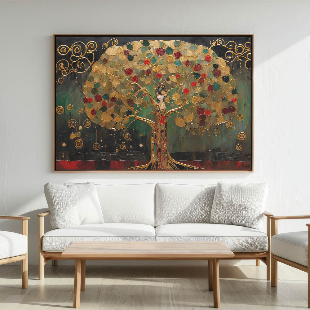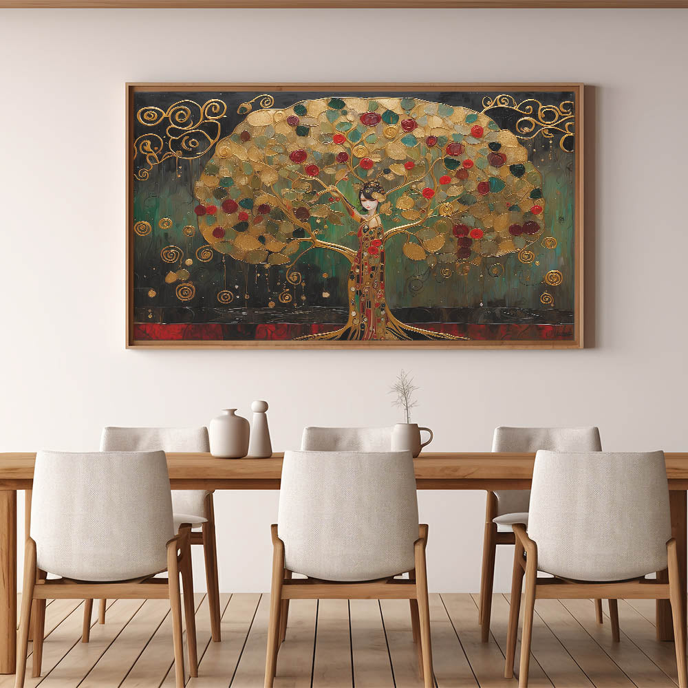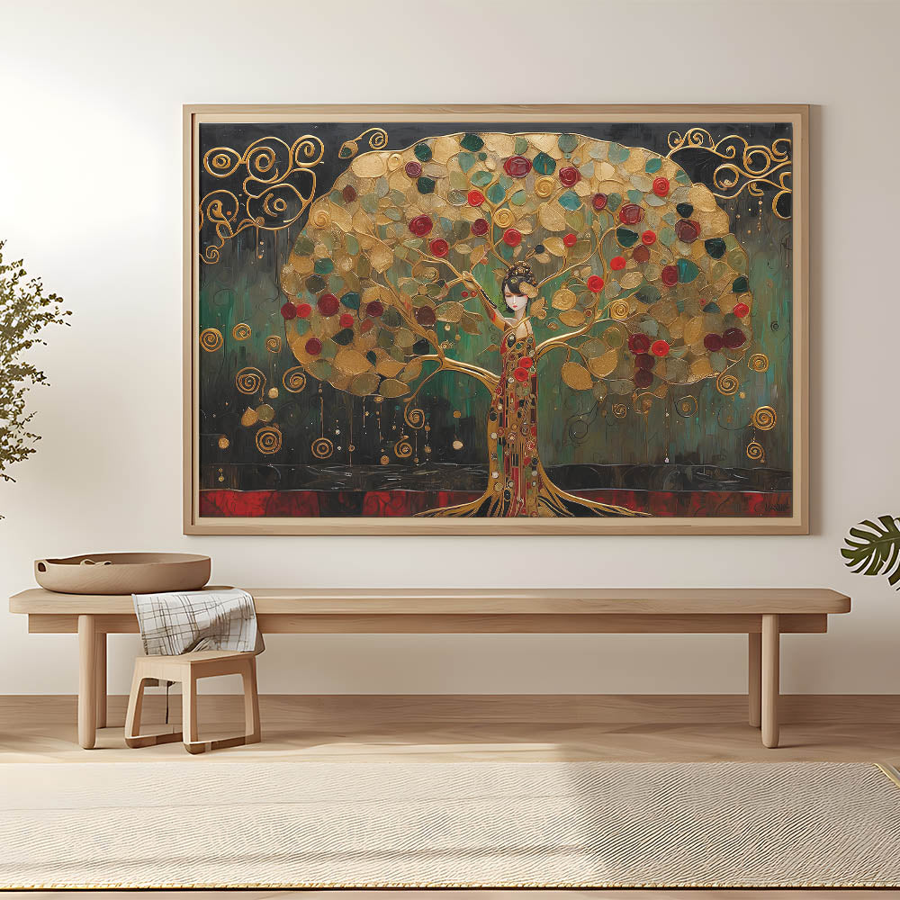 Add a touch of elegance and mystique to your space with this unique abstract Tree of Life artwork, featuring an enchanting figure gracefully woven into the tree. With intricate gold swirls, earthy greens, and accents of red and burgundy, this artwork combines elements of nature and human form, symbolizing harmony and growth. This piece is perfect for eclectic, bohemian, and nature-inspired interiors, infusing any space with a warm, luxurious feel.