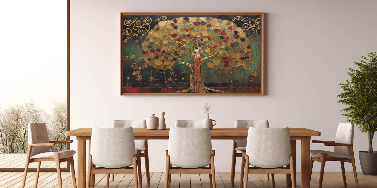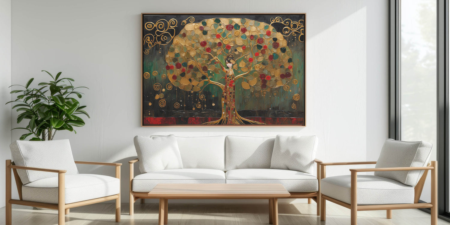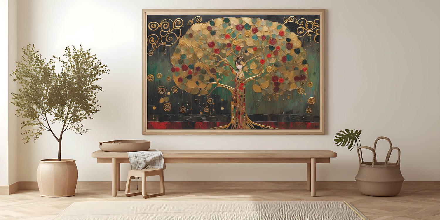 Add a touch of elegance and mystique to your space with this unique abstract Tree of Life artwork, featuring an enchanting figure gracefully woven into the tree. With intricate gold swirls, earthy greens, and accents of red and burgundy, this artwork combines elements of nature and human form, symbolizing harmony and growth. This piece is perfect for eclectic, bohemian, and nature-inspired interiors, infusing any space with a warm, luxurious feel.