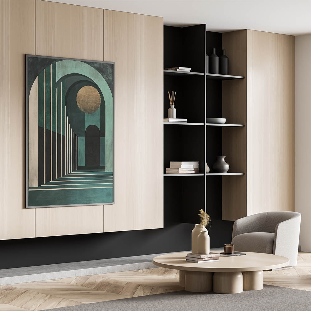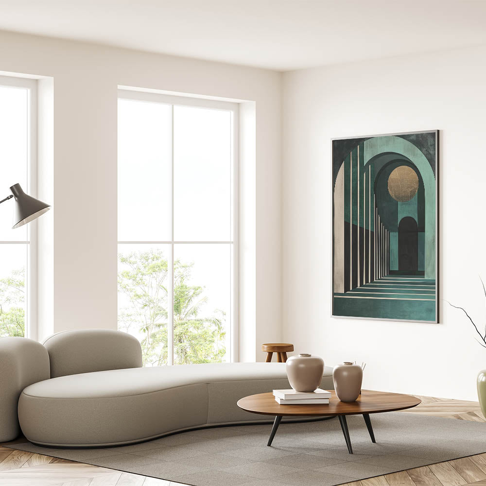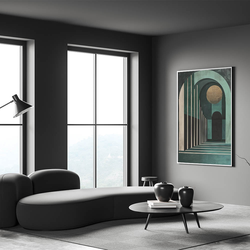 Bring depth and elegance to your space with this geometric abstract wall art featuring layered archways in deep green tones with a touch of gold. The symmetrical arches create a sense of mystery and dimension, drawing the eye into the artwork. Perfect for modern and minimalist interiors, this piece exudes a calming yet luxurious vibe that adds sophistication to any space.