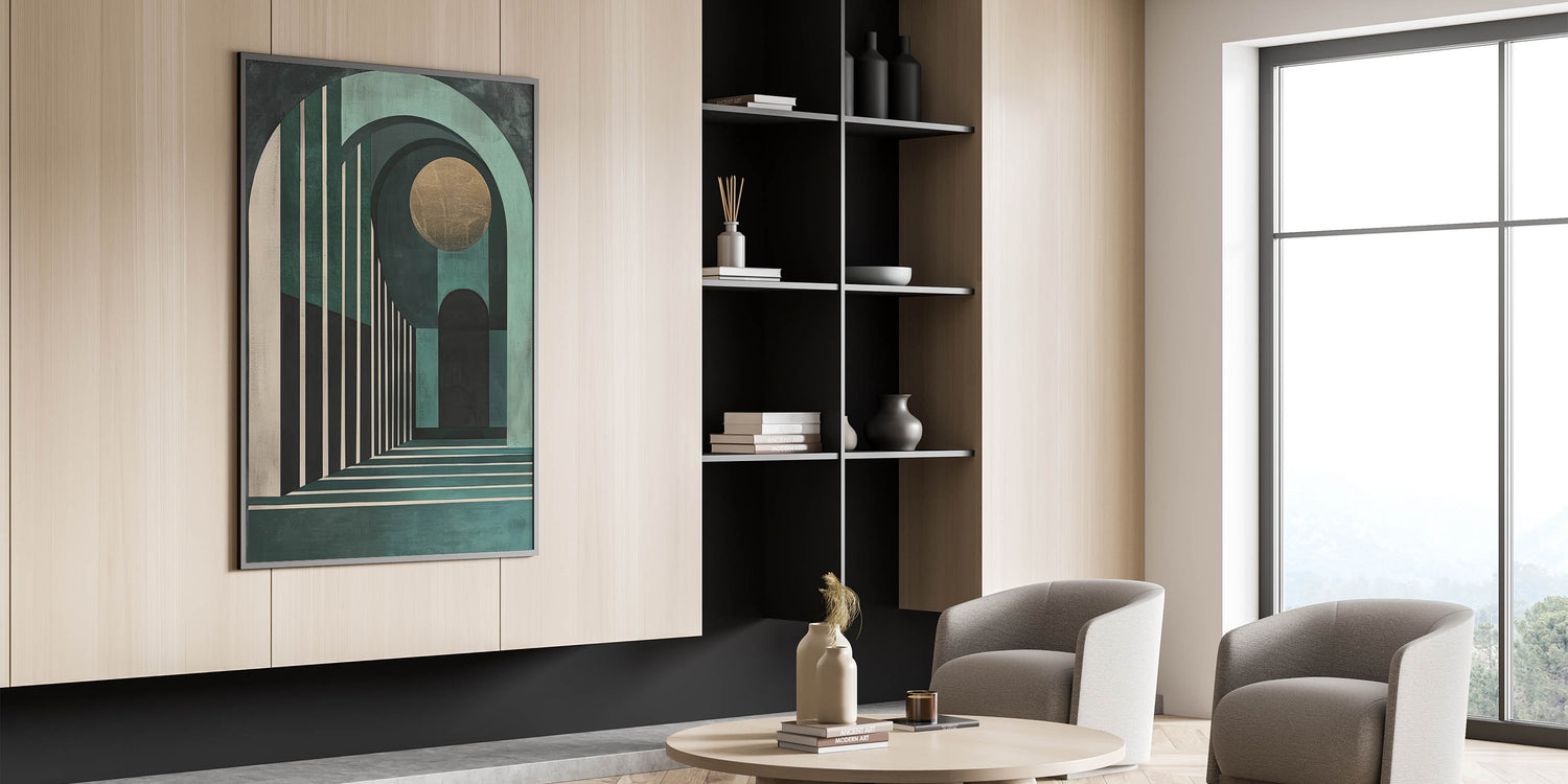 This geometric abstract art piece is ideal for those who appreciate structured forms with a hint of opulence. The deep green and gold palette, combined with the symmetrical arches, brings both serenity and sophistication to your surroundings.
