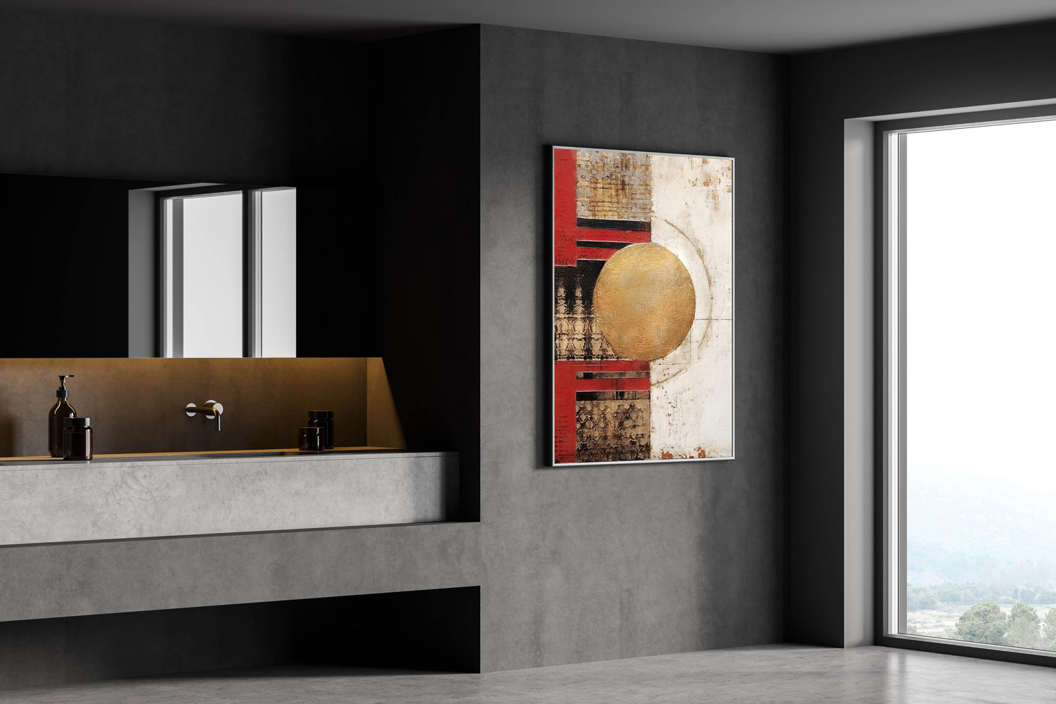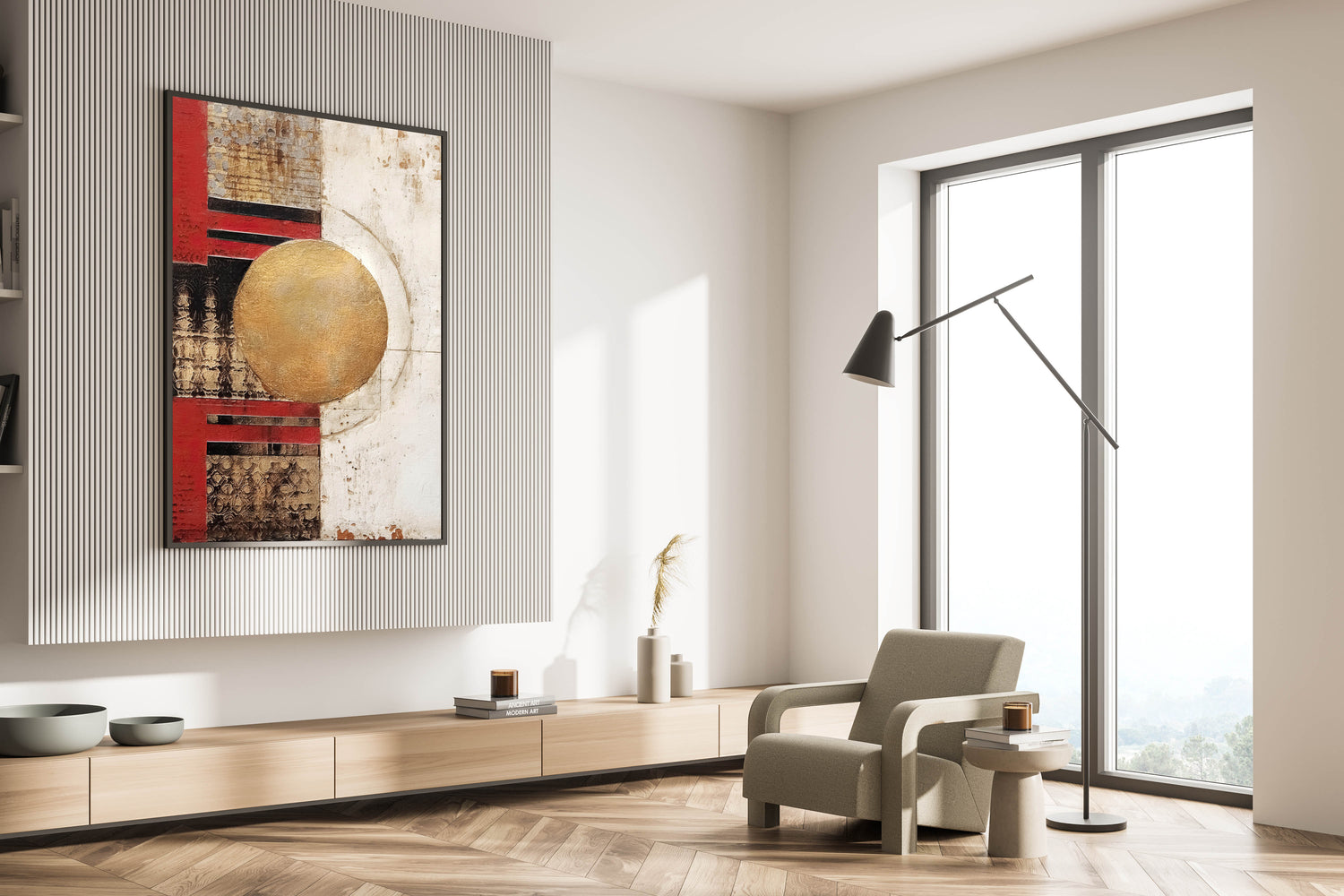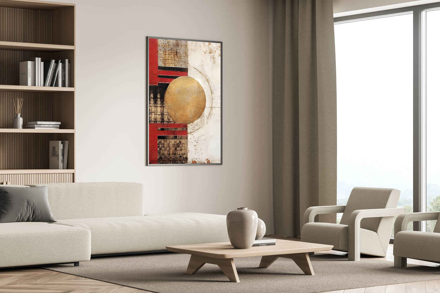 Elevate your space with this captivating Geometric Line Art canvas, showcasing dynamic strokes and a striking central gold circle. This stunning abstract line design blends bold, earthy tones of red, black, and gold, with delicate brush strokes creating a textured and sophisticated composition. The artwork’s contemporary style, featuring intricate line details and unique patterns, makes it a perfect choice for modern and minimalist decor.