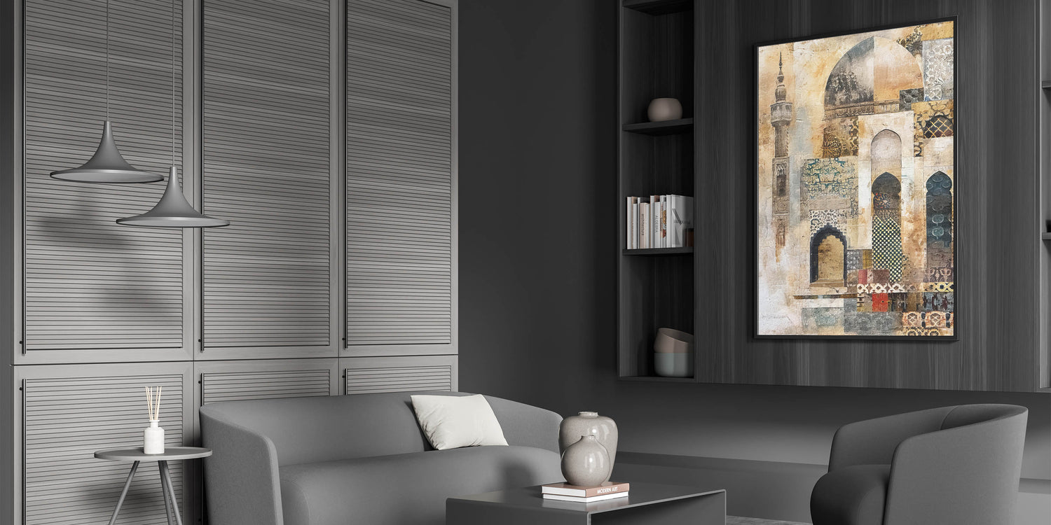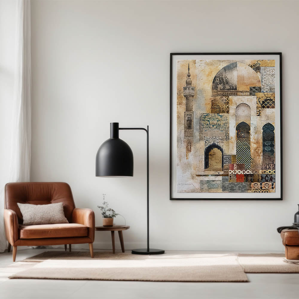 This abstract architectural print offers a harmonious blend of historic charm and contemporary design, making it a statement piece for living rooms, offices, or hallways. Its unique blend of colors and textures creates a calming, sophisticated ambiance.