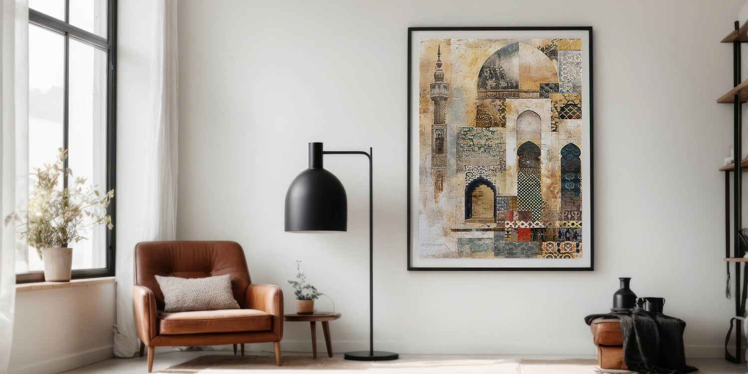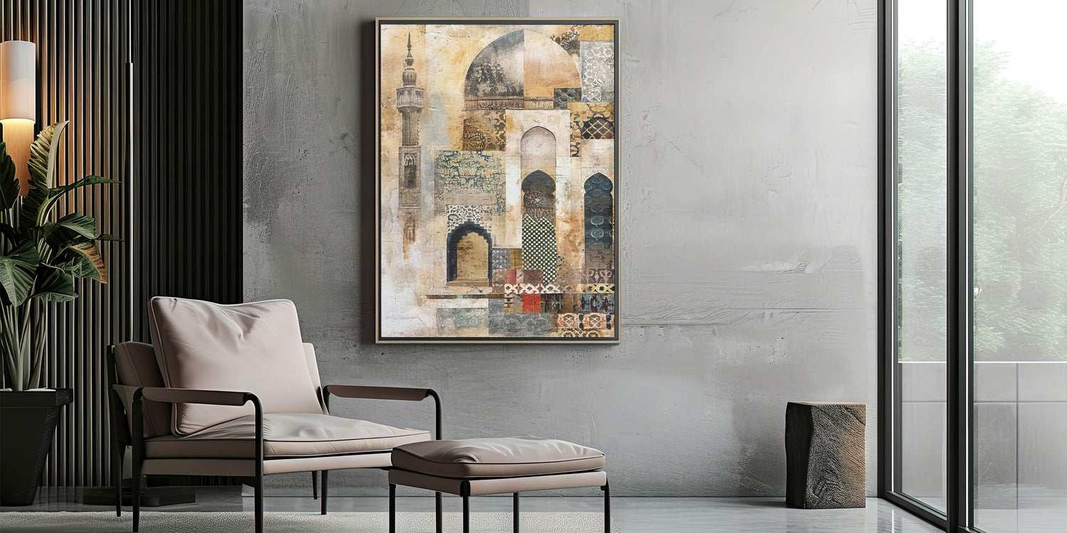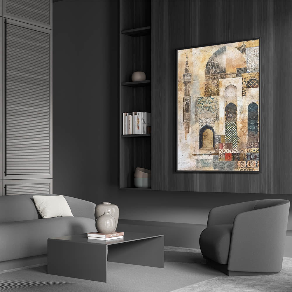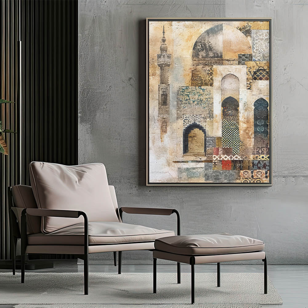Transform your space with this stunning golden minaret abstract architecture canvas, featuring intricate domes and arches in rich shades of beige, blue, and gold. This artwork captures the beauty of Islamic architecture with a modern, abstract touch, making it an ideal piece for those who appreciate cultural artistry. Its textured design and warm tones bring depth and elegance to any room.