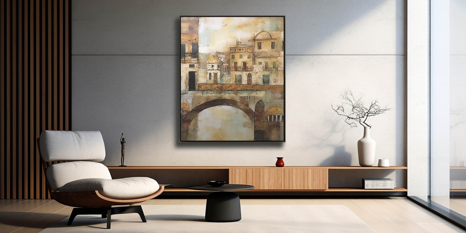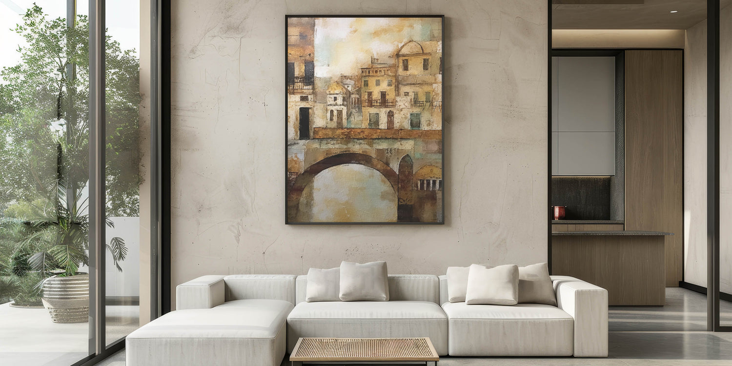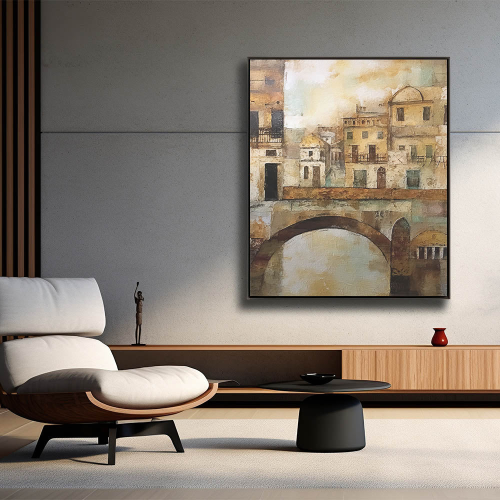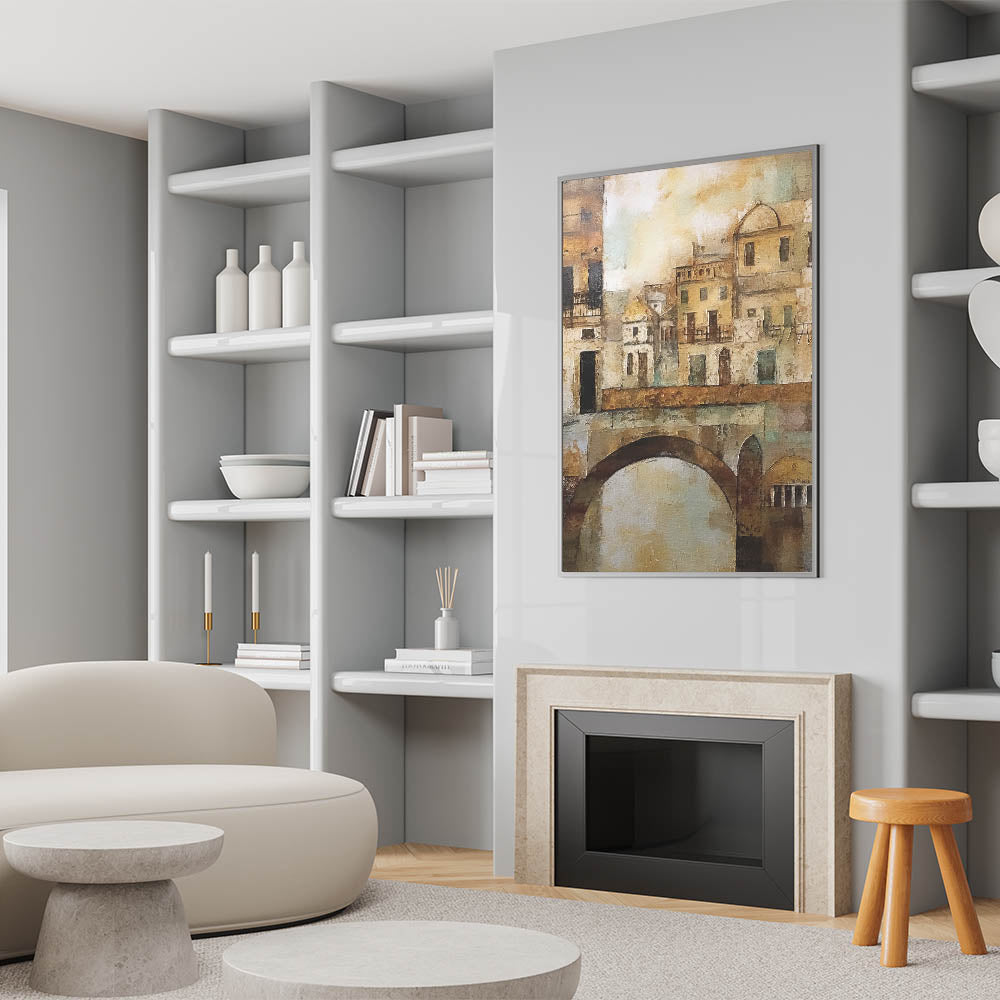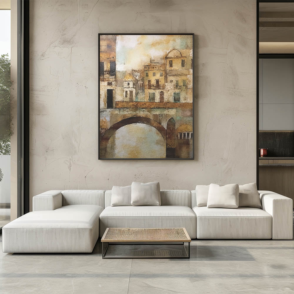 Add a touch of historic charm to your decor with this Historic Abstract Architecture art print. This artwork captures a scenic view of old-world architecture, with rustic textures and earthy hues that bring a timeless appeal to any space. The warm color palette, combined with the intricate details of arches, balconies, and weathered facades, creates a captivating scene reminiscent of classic European towns.