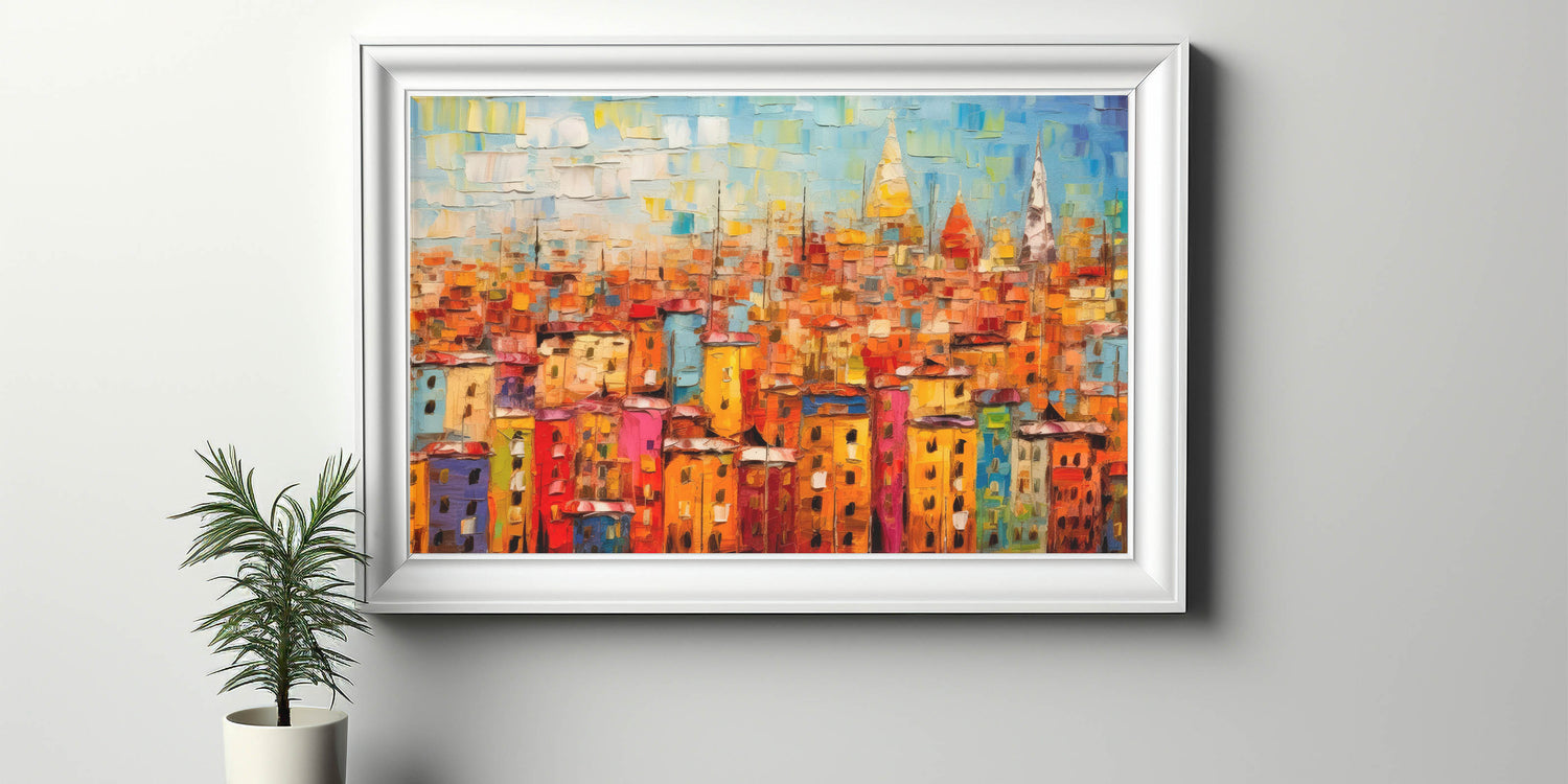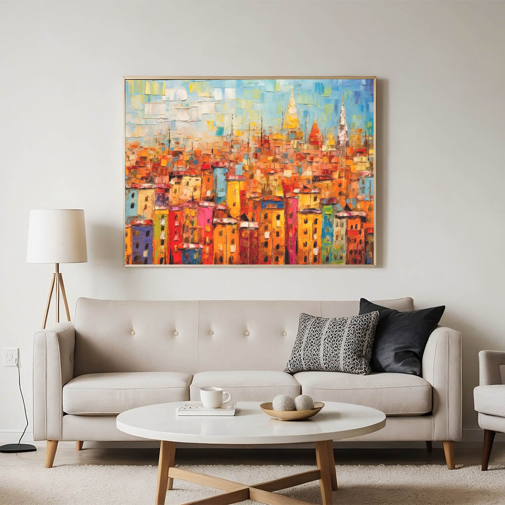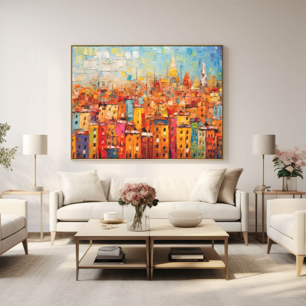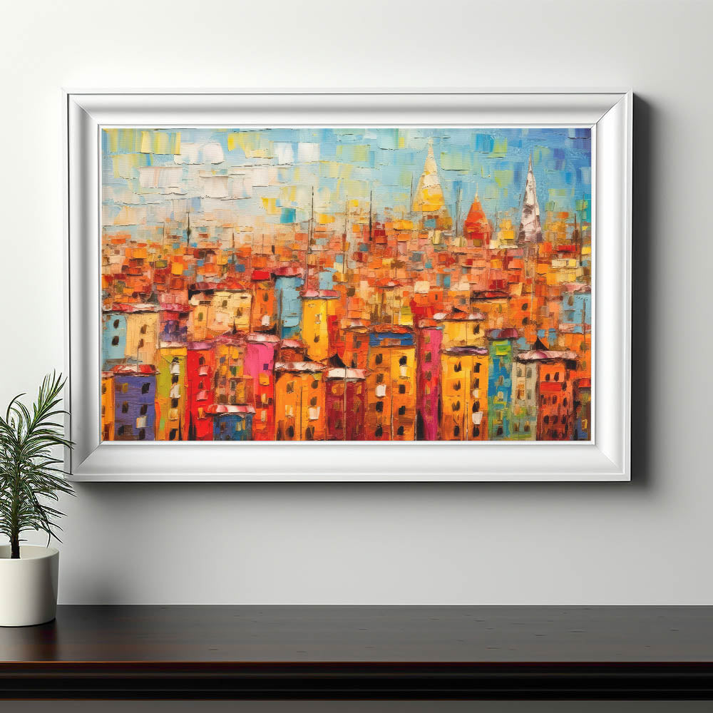 Transform your space with this bright urban village art, featuring a lively array of colorful buildings and a textured, abstract style. This artwork brings a sense of joy and vibrancy, perfect for adding a dynamic touch to any room.