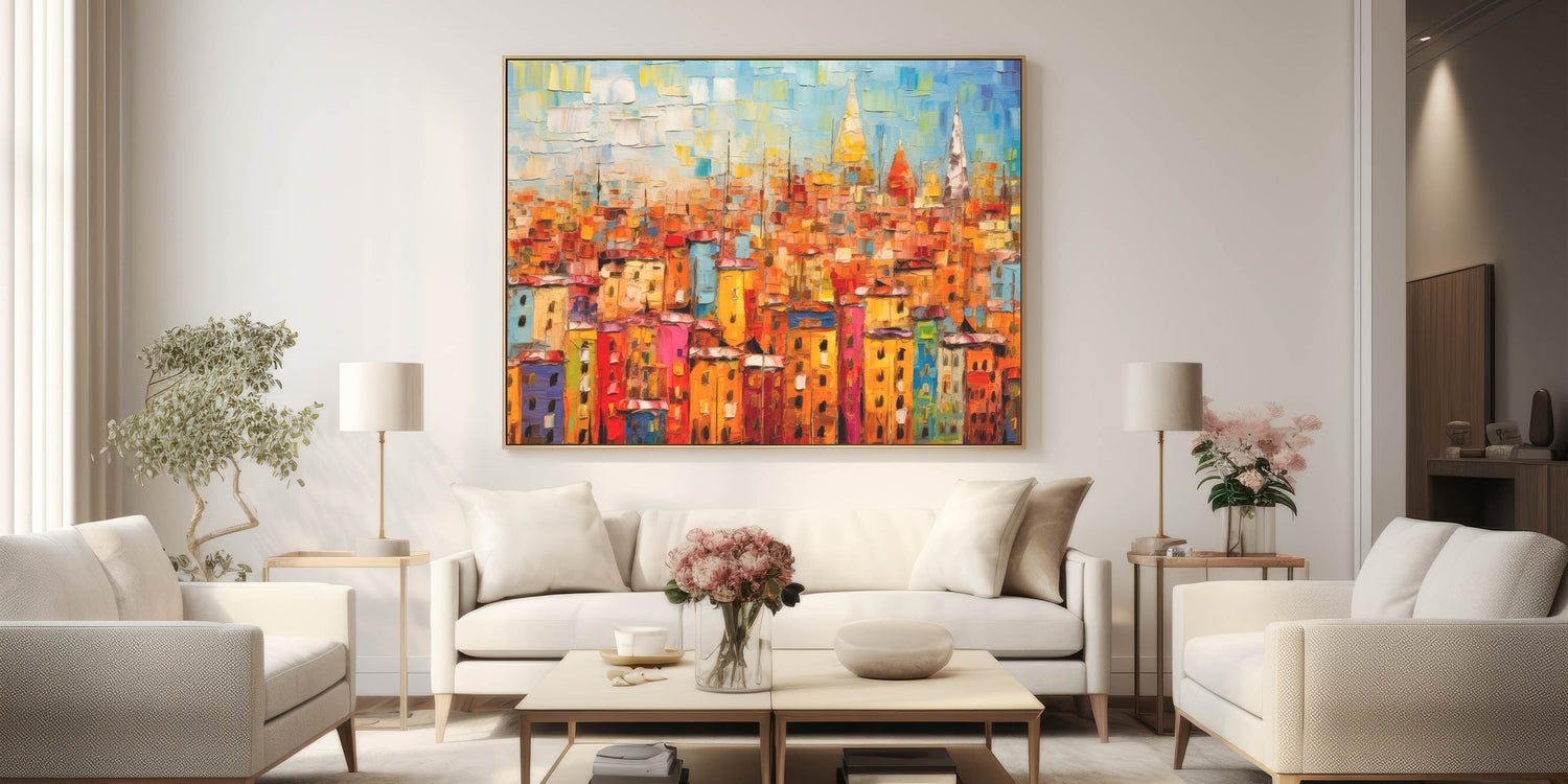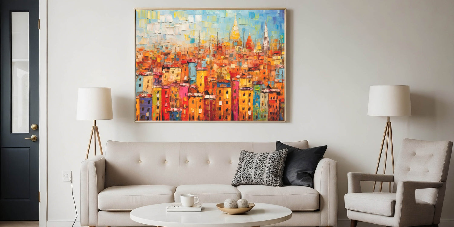 ��This colorful abstract urban village art adds a burst of energy and creativity to your decor. Its bold palette and playful design make it a versatile piece that complements a wide range of interior styles, making it an excellent choice for brightening up any space.