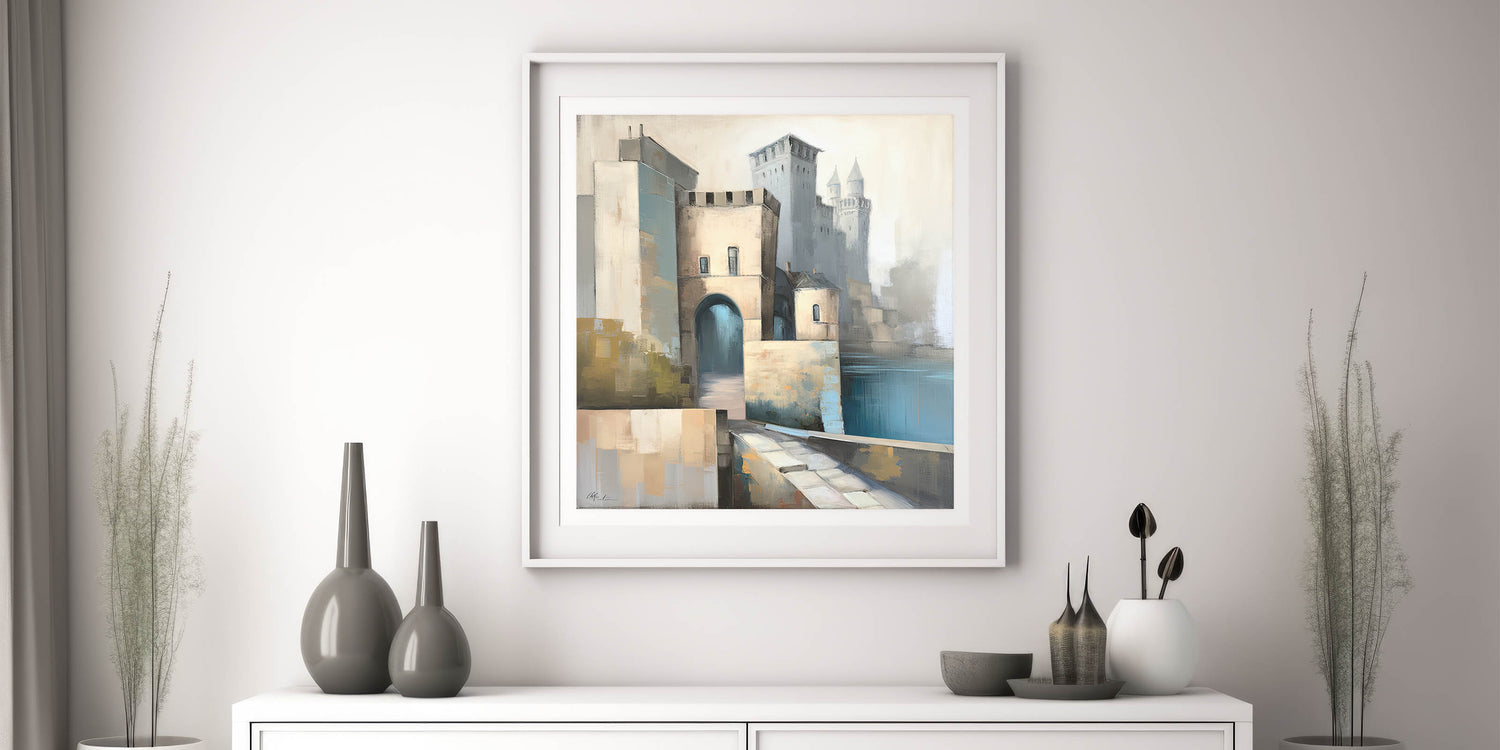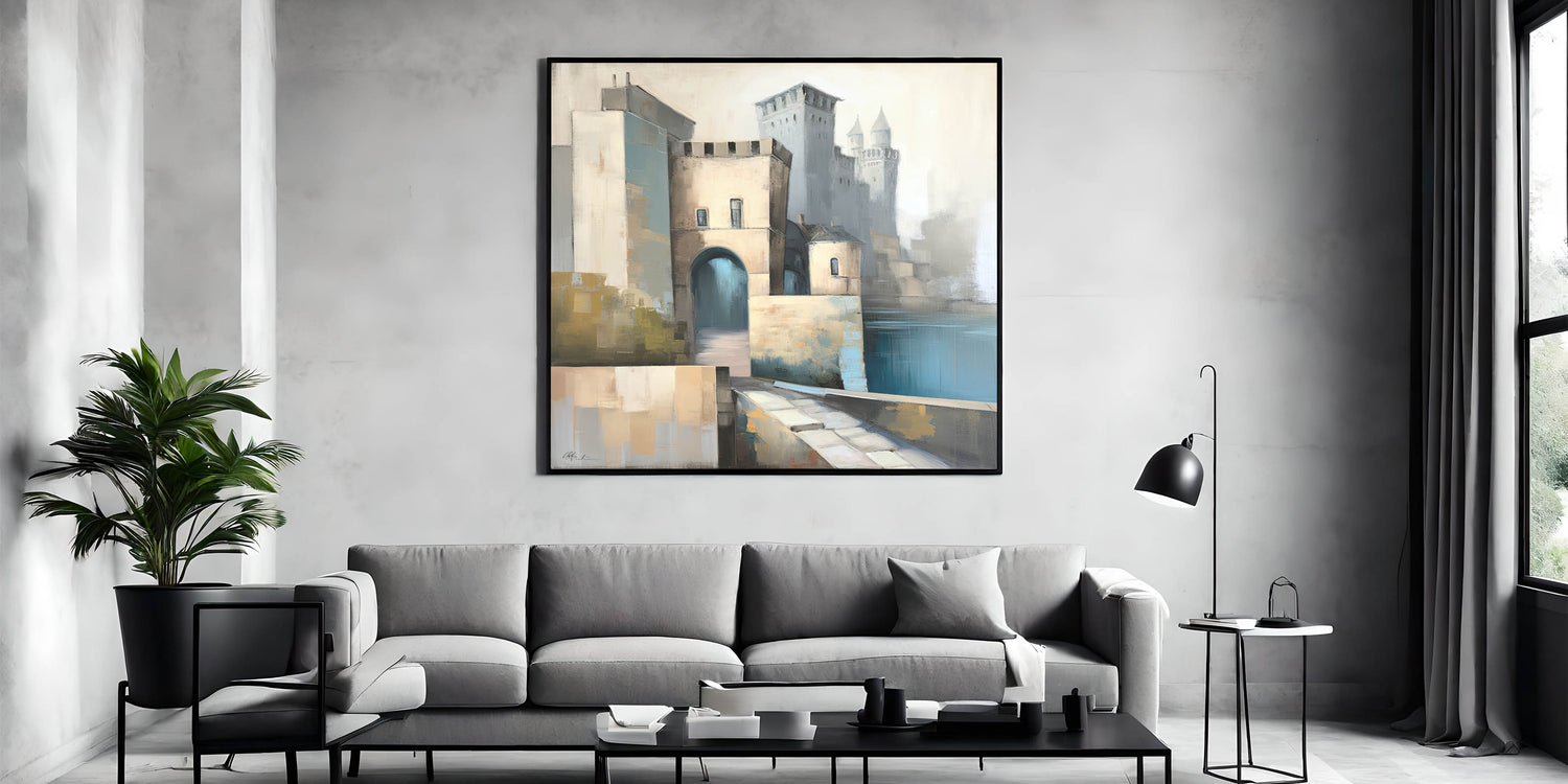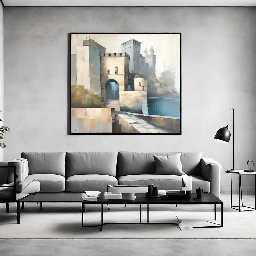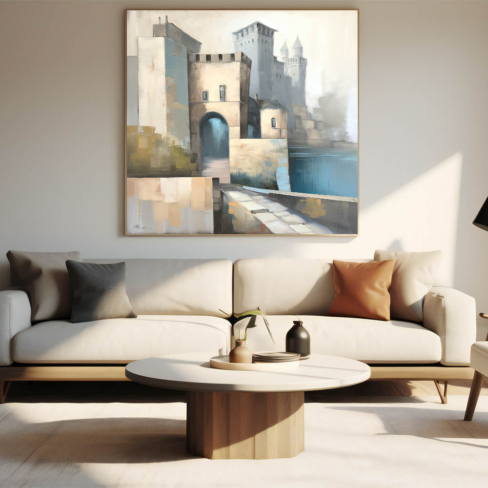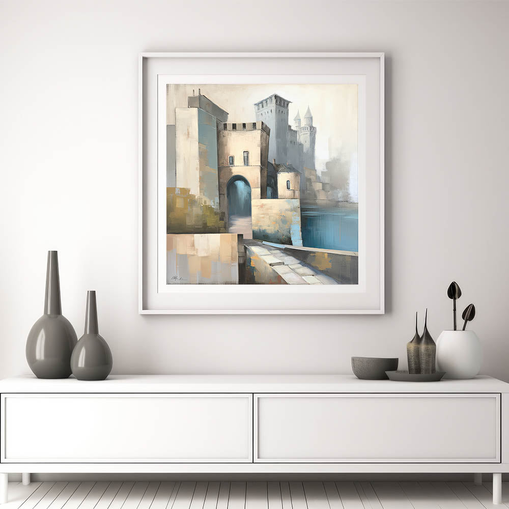 Step into a world of historical intrigue with this medieval fortress architecture art, reimagined in an abstract style. Featuring towering castle walls and arched gateways, this artwork captures the grandeur and mystery of ancient structures. The muted palette of beige, blue, and earthy tones adds a sense of depth and timeless elegance, making it an excellent choice for eclectic, vintage, or modern interiors.