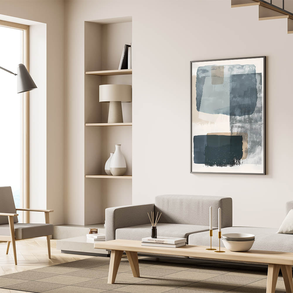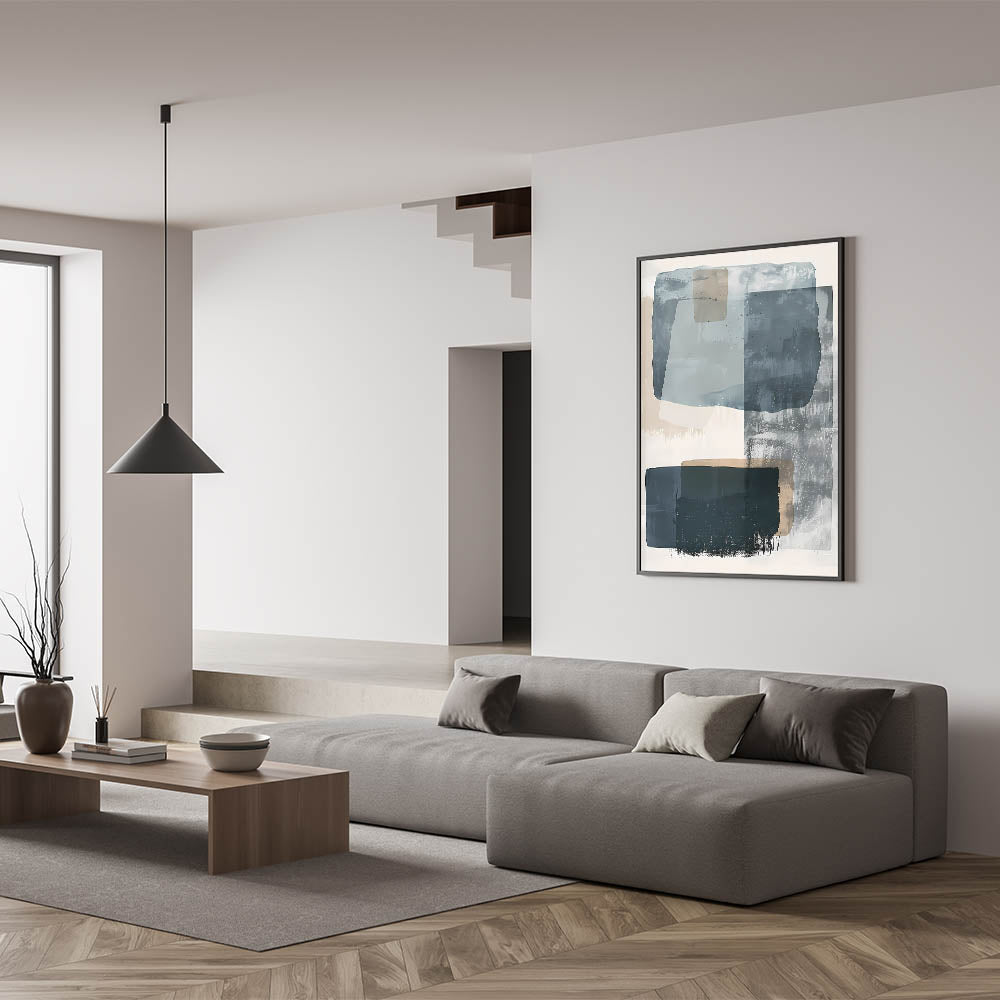 Introduce tranquility to your space with this minimalist abstract artwork in cool blue and gray tones. The design features layered, textured rectangles that create a soothing, harmonious composition. Ideal for contemporary and minimalist interiors, this piece brings a calm and refined aesthetic to any room. Its subtle color palette makes it a versatile choice, perfect for creating a peaceful atmosphere in any setting.