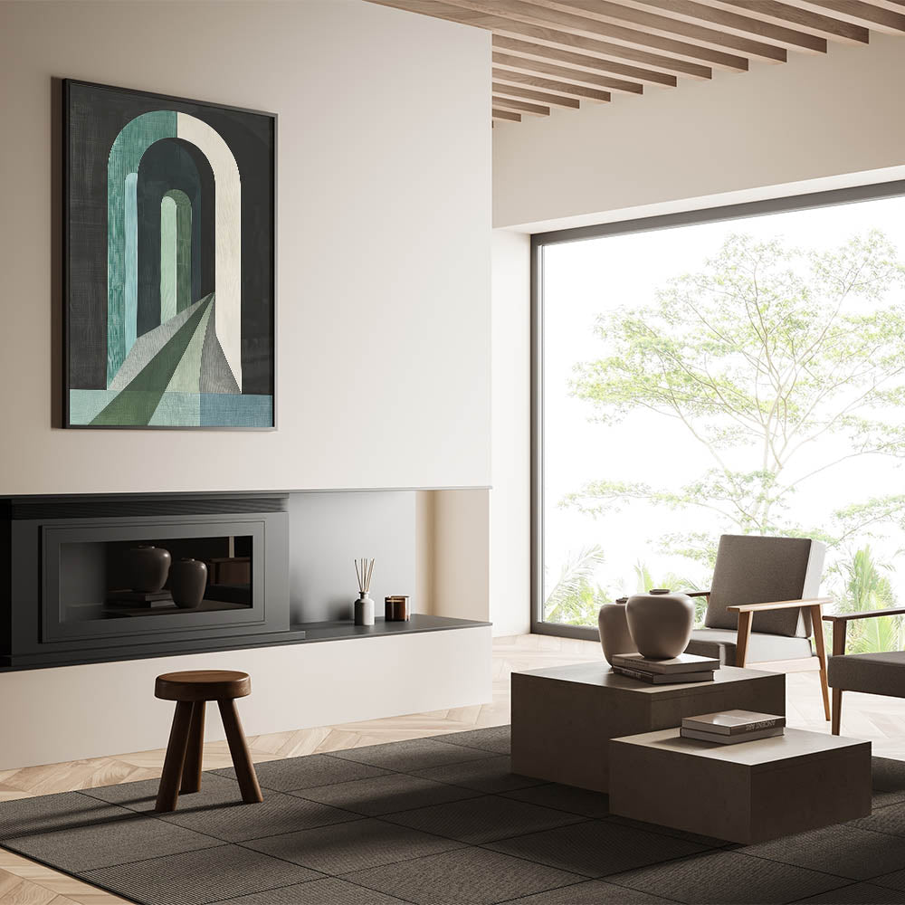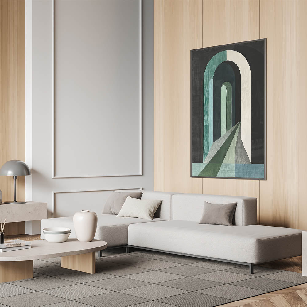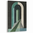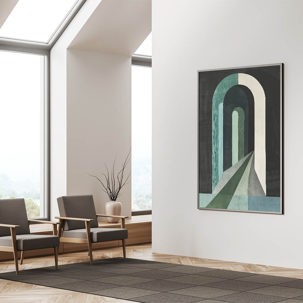 Transform your space with this minimalist geometric arch art print, featuring layered arches in shades of green, teal, and black. The composition evokes depth and perspective, creating a pathway effect that draws the viewer in. This modern design adds a dynamic, architectural element to any room, making it ideal for contemporary and minimalist interiors.