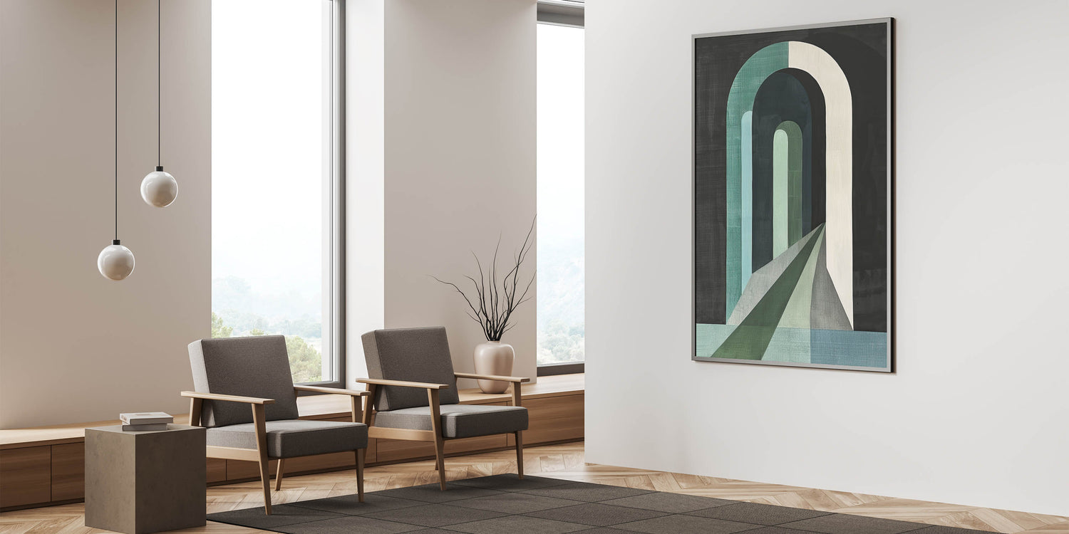 This minimalist art print is perfect for those who value structured design with a sophisticated edge. The arches and depth of color create a balanced yet impactful aesthetic, making it a versatile addition to any personal or professional space.