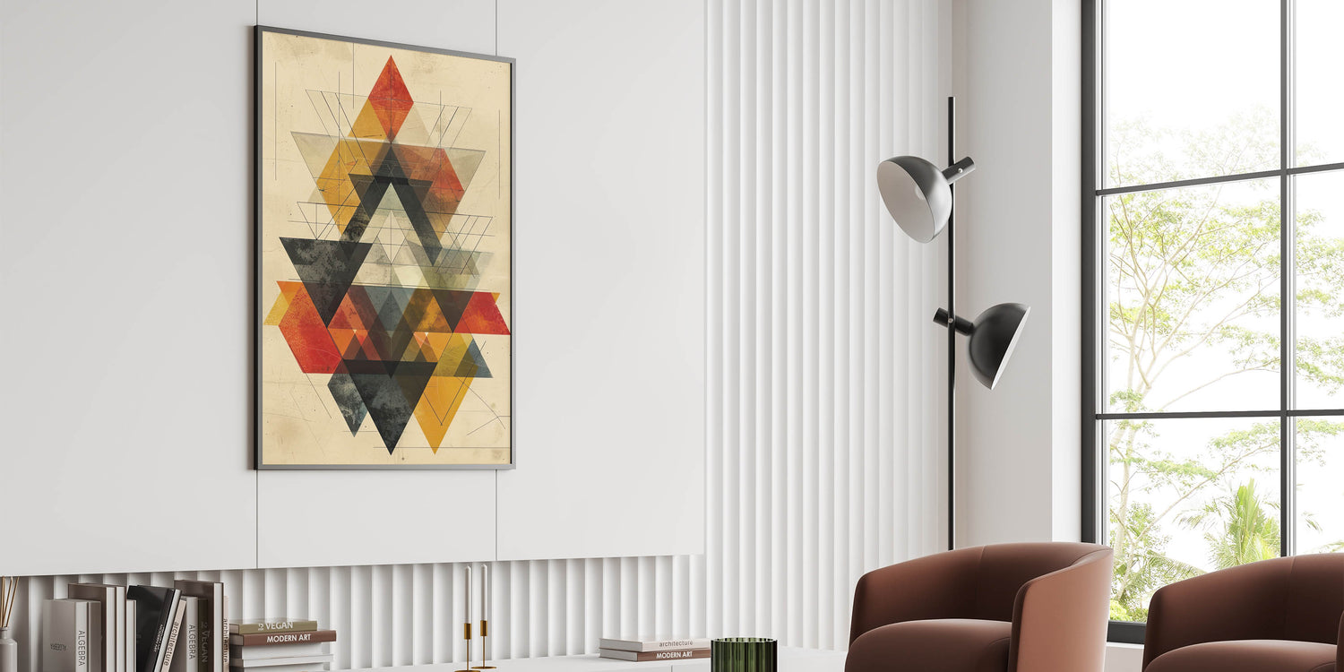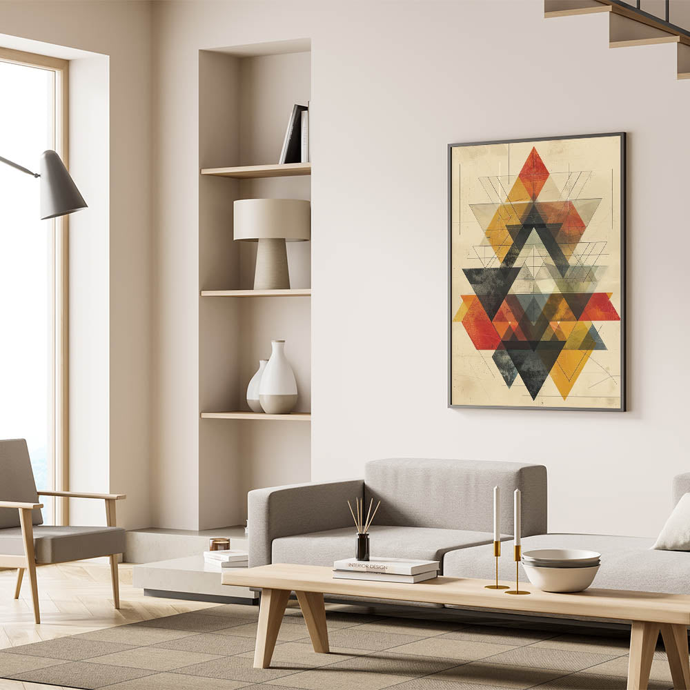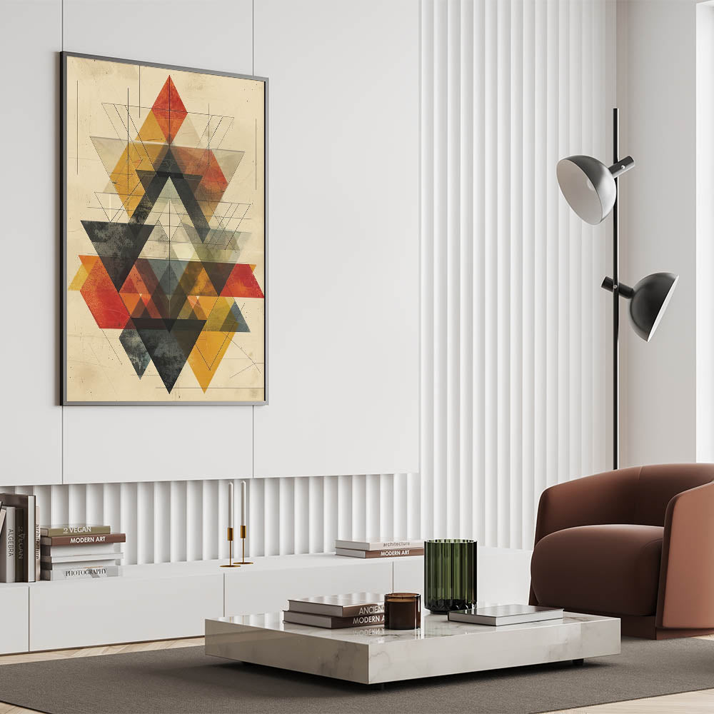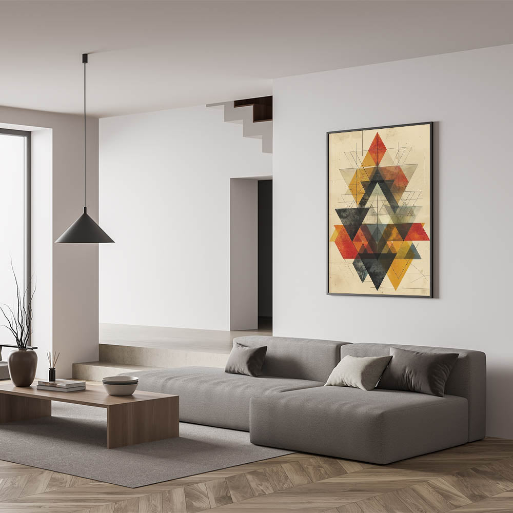 Introduce dynamic energy into your decor with this minimalist geometric wall art featuring a bold, layered design in warm earth tones. The intricate arrangement of triangles and lines creates depth and movement, making it an eye-catching centerpiece for contemporary interiors. This piece’s blend of red, orange, yellow, and black hues brings warmth and sophistication, perfect for adding character to any modern space.