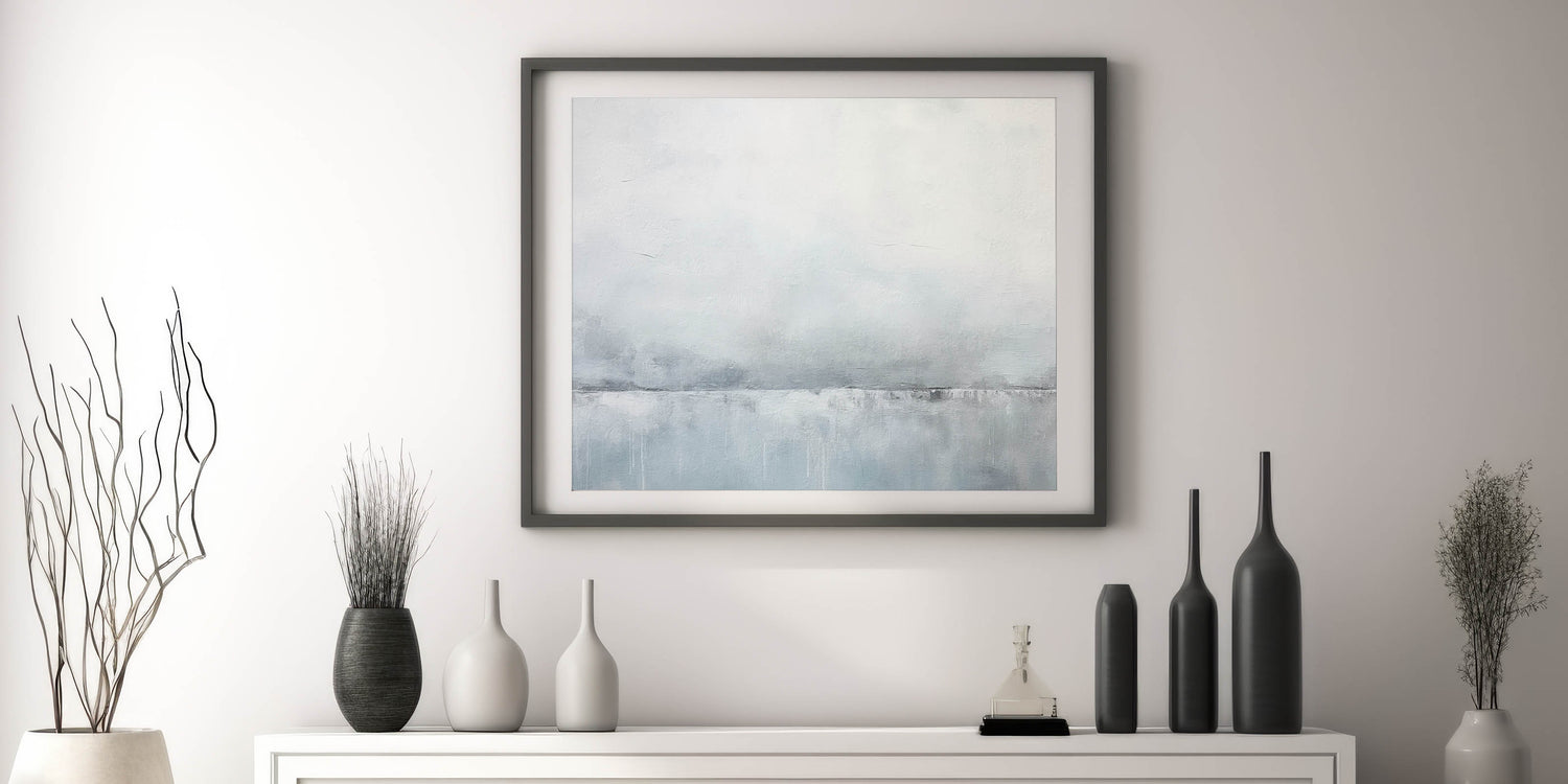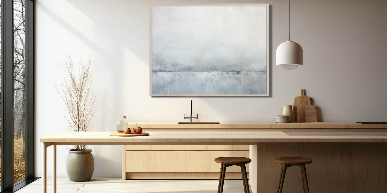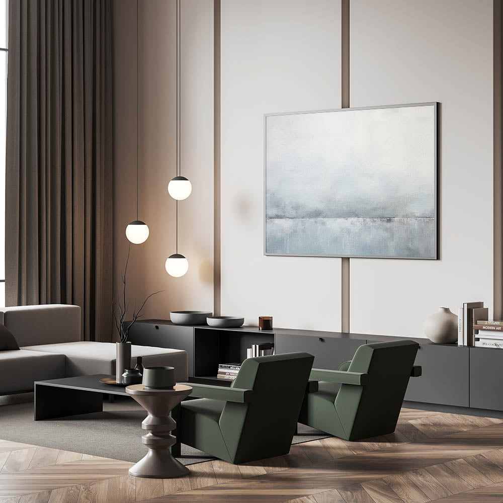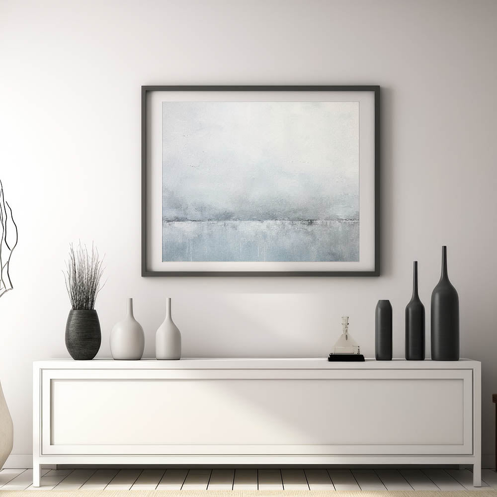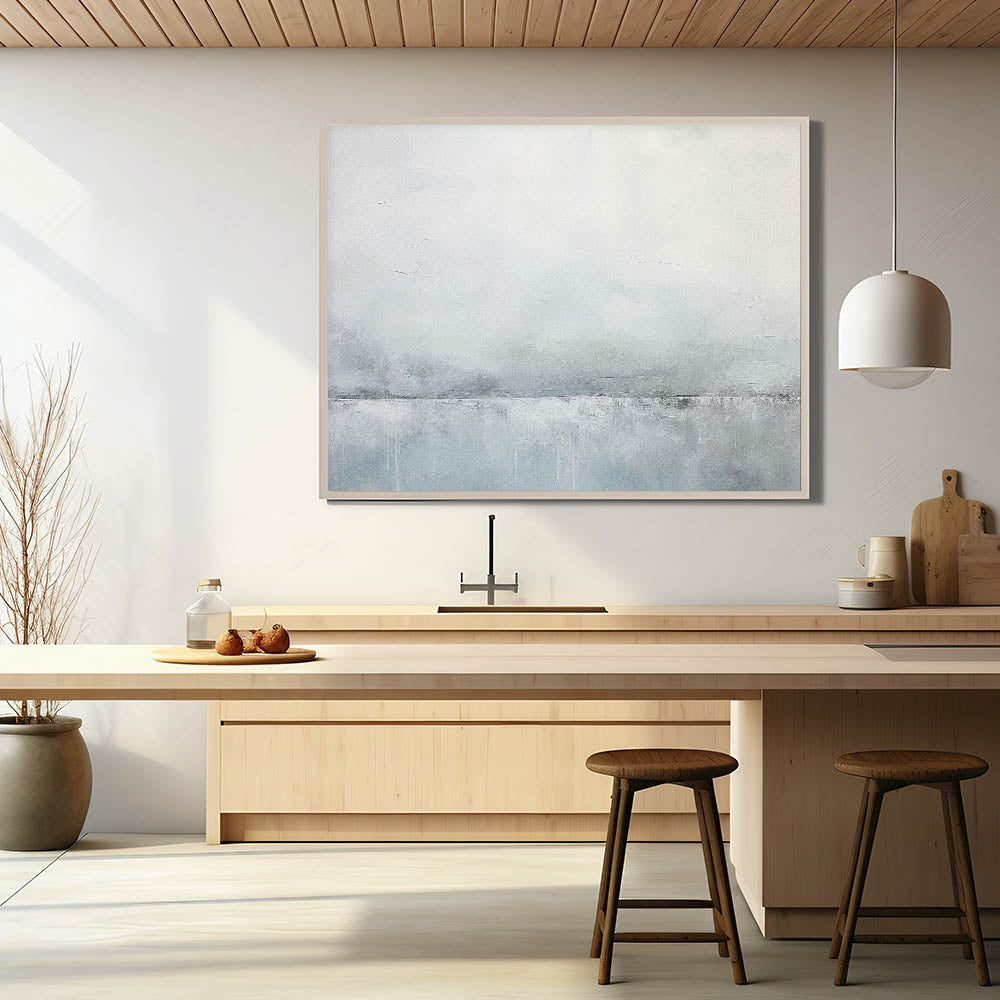 Bring a sense of calm and tranquility to your space with this minimalist line art canvas. The artwork features abstract brush strokes in a soothing palette of pale blue, light gray, and white, evoking the serene imagery of a misty seascape. The subtle gradient and delicate textures create a peaceful, airy atmosphere, making it an ideal choice for modern and coastal-inspired interiors.