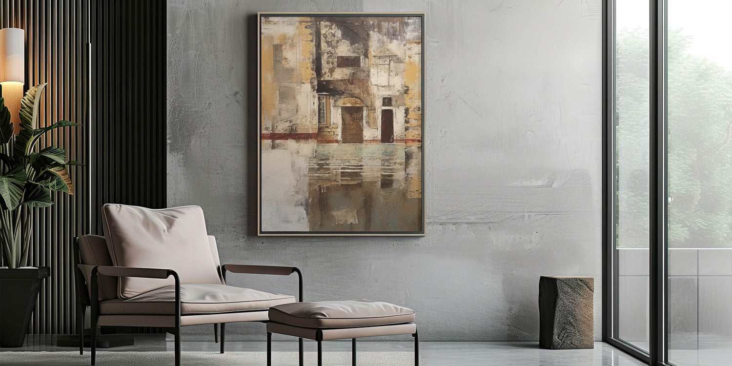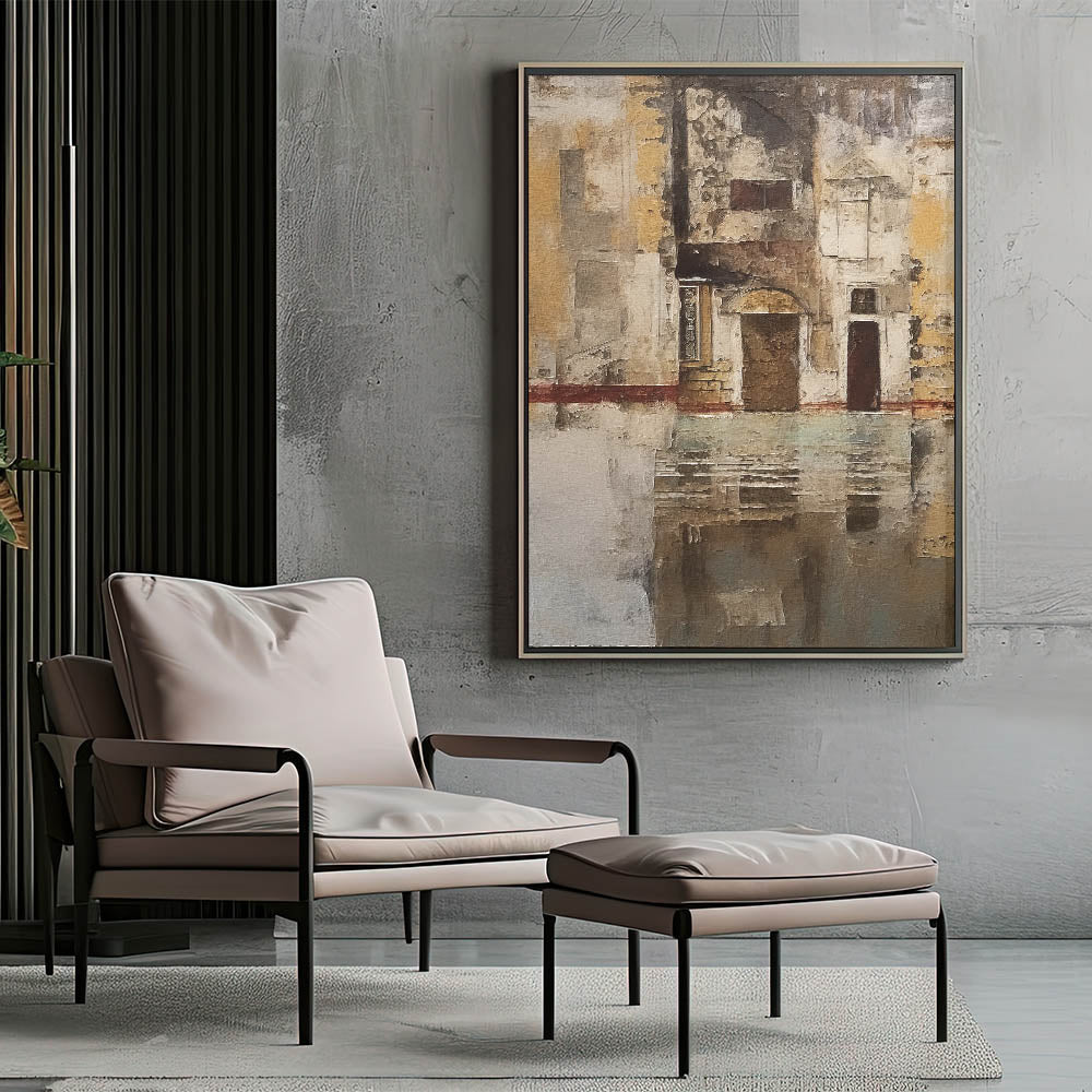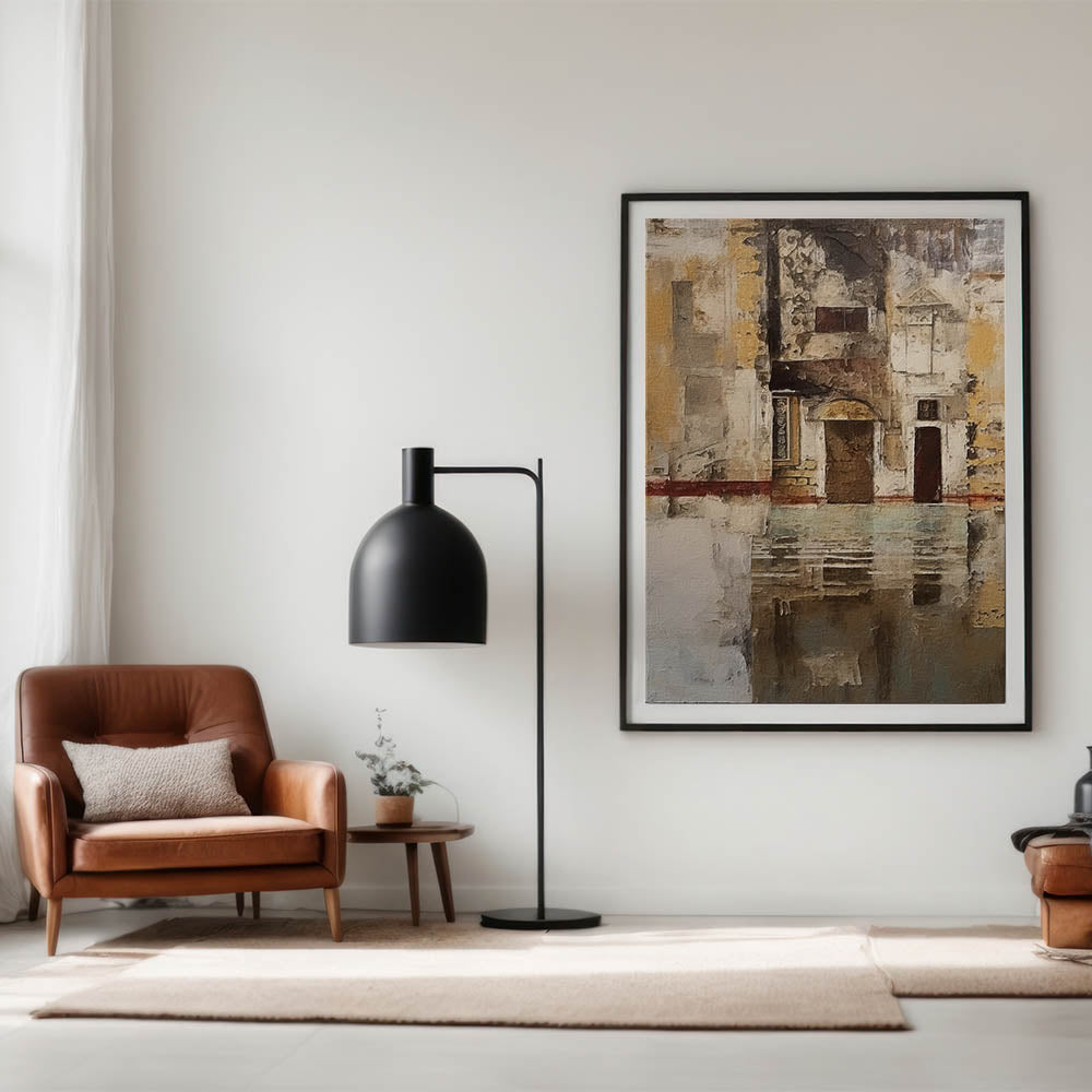 Enhance your decor with this Rustic Abstract Architecture art print, an evocative piece that captures the charm of historic structures through layered textures and muted earthy tones. With intricate architectural details, weathered walls, and a subtle reflection effect, this artwork brings a timeless, vintage feel to any room. Its subdued palette and rustic appeal make it ideal for those who appreciate understated elegance and historical character in their decor.