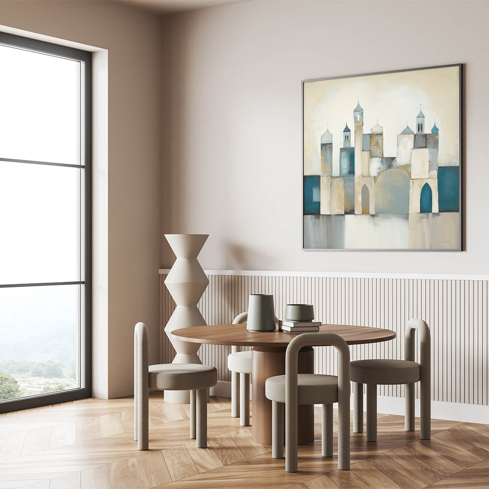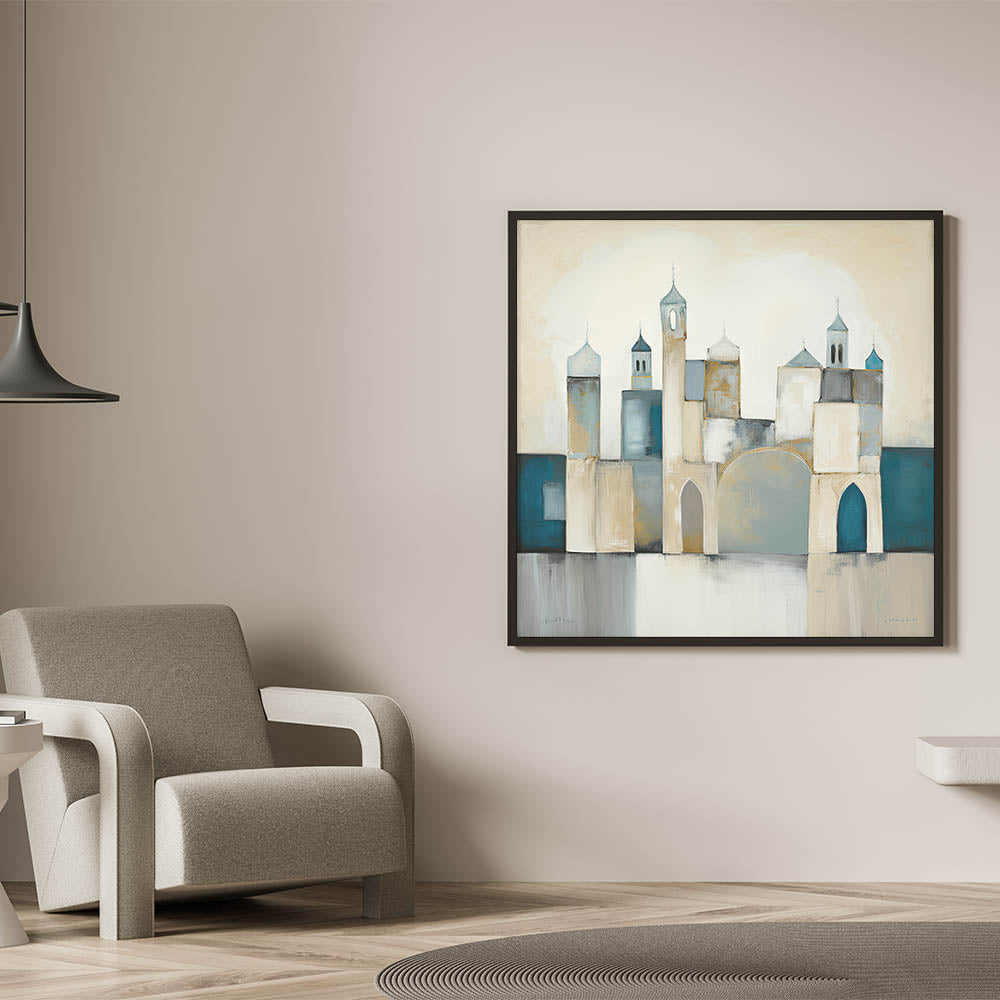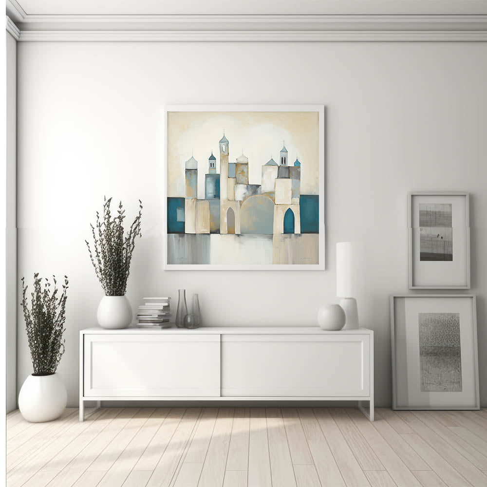 Transform your space with this modern architecture art, showcasing an abstract urban skyline in soft, muted colors. The design combines geometric shapes with architectural elements, creating a harmonious blend of contemporary and classic styles. The subtle tones of teal, beige, and gray give the piece a calming effect, making it perfect for any room that embraces a minimalist or modern aesthetic.
