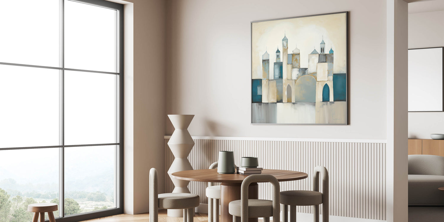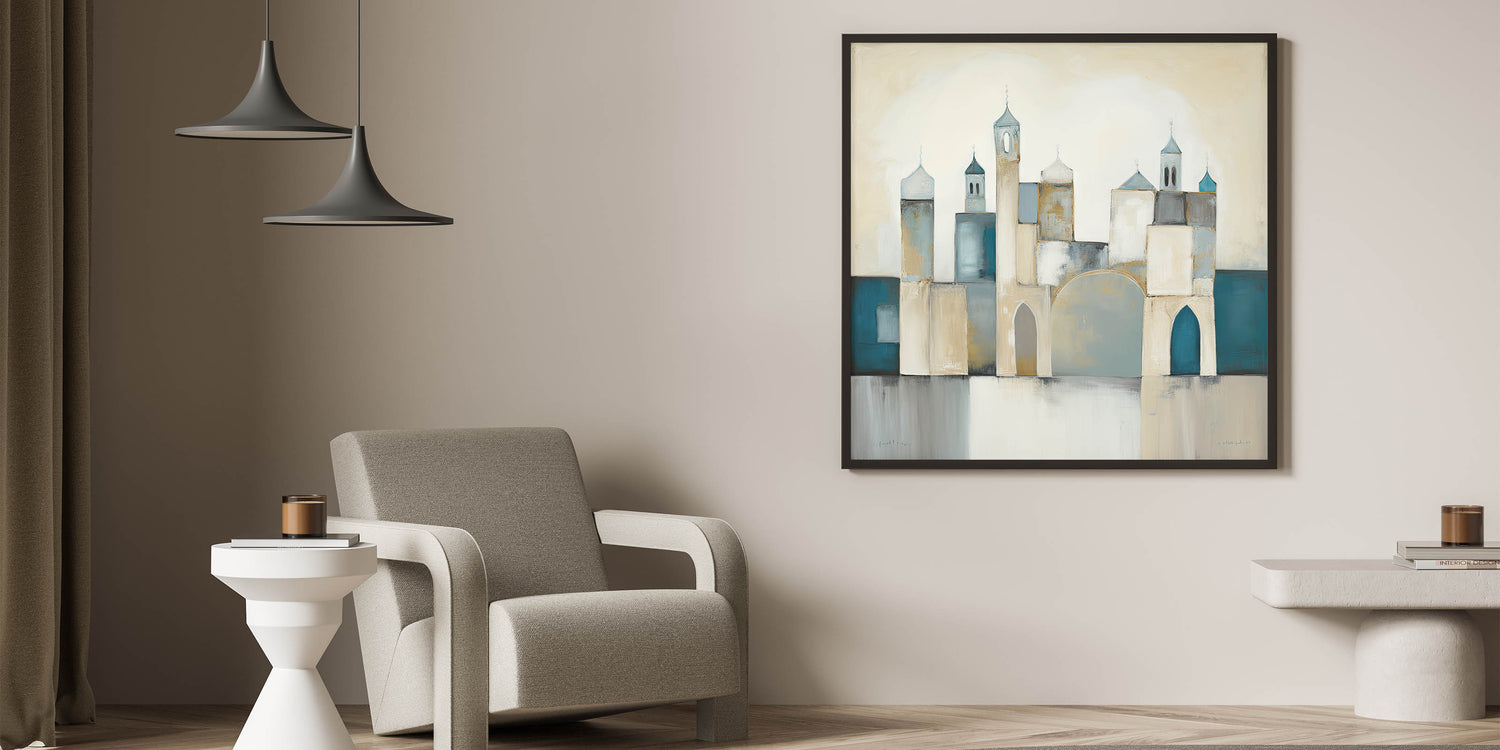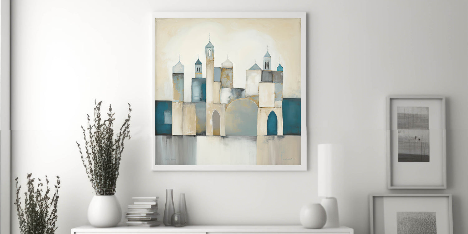 Transform your space with this modern architecture art, showcasing an abstract urban skyline in soft, muted colors. The design combines geometric shapes with architectural elements, creating a harmonious blend of contemporary and classic styles. The subtle tones of teal, beige, and gray give the piece a calming effect, making it perfect for any room that embraces a minimalist or modern aesthetic.