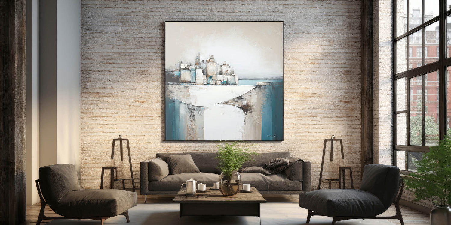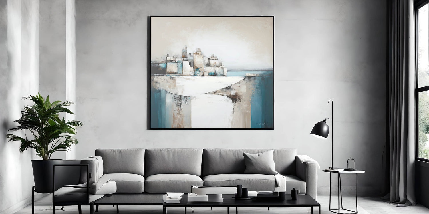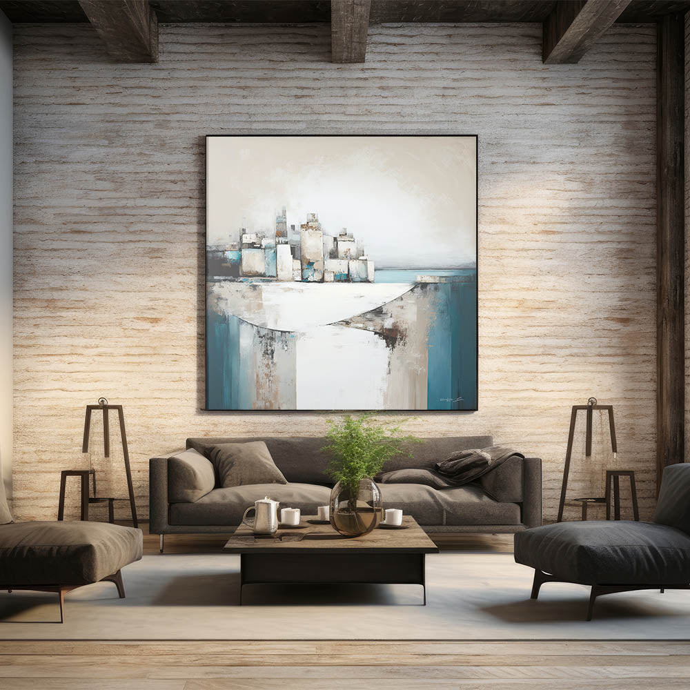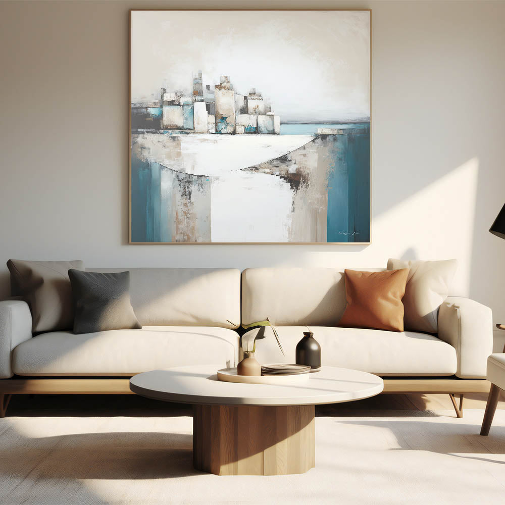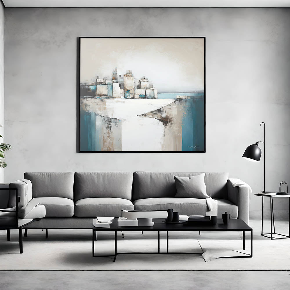 Infuse your space with the serene beauty of coastal architecture with this modern abstract art piece. Featuring a blend of geometric forms and textured colors in shades of teal, beige, and white, this artwork captures the essence of a coastal cityscape. The dynamic composition, with layered structures set against a calming sea, creates a sense of movement and tranquility, perfect for contemporary interiors.
