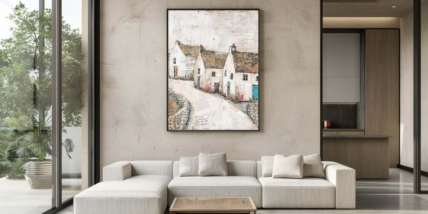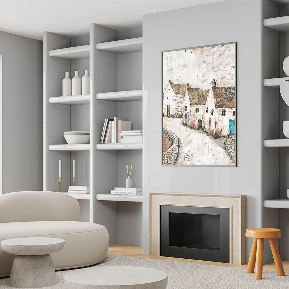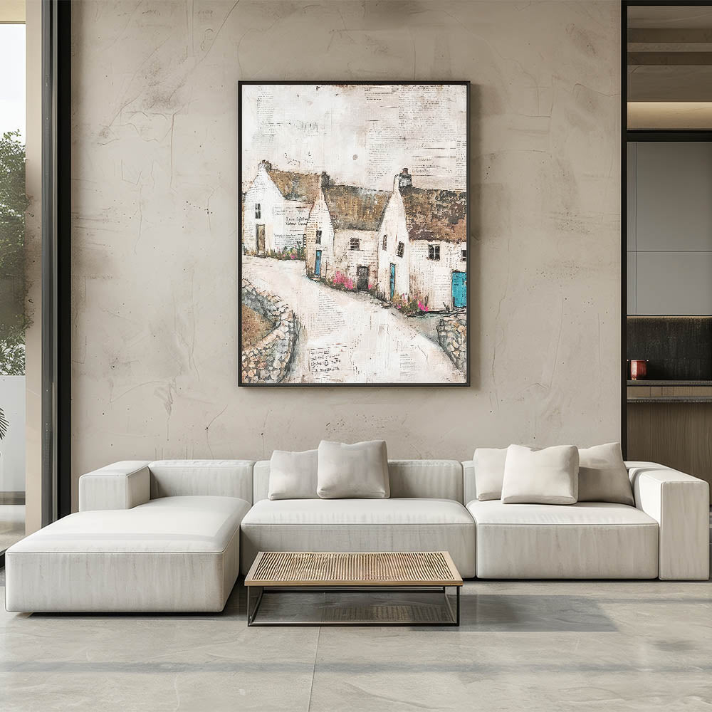 Capture the rustic charm of village architecture with this urban abstract canvas print. Featuring cozy, whitewashed cottages with textured stone pathways, this artwork highlights the simplicity and beauty of rural life. The earthy brown tones paired with subtle pops of color from the doors and flowers bring warmth and character, making this piece perfect for farmhouse and rustic decor themes.