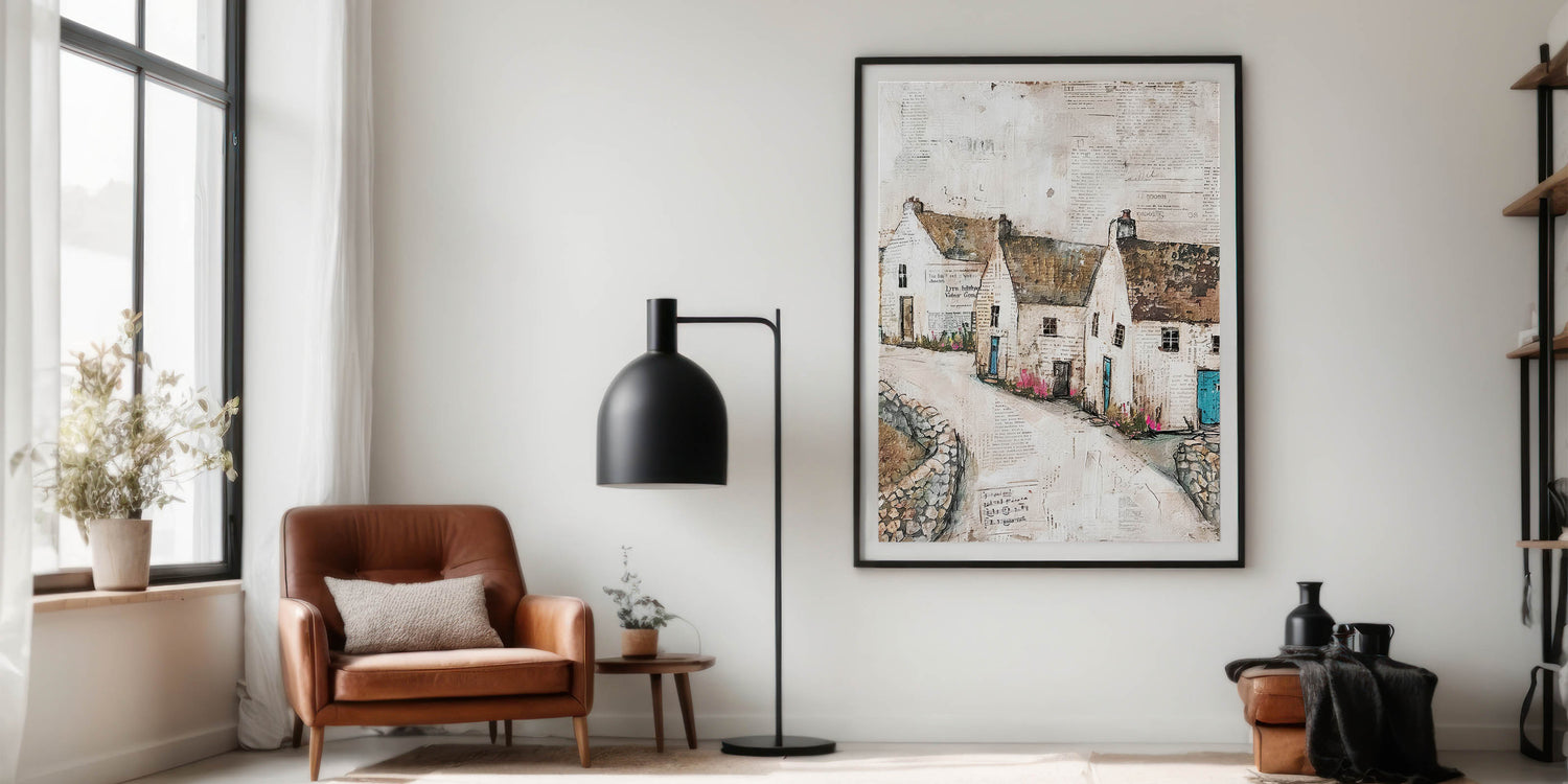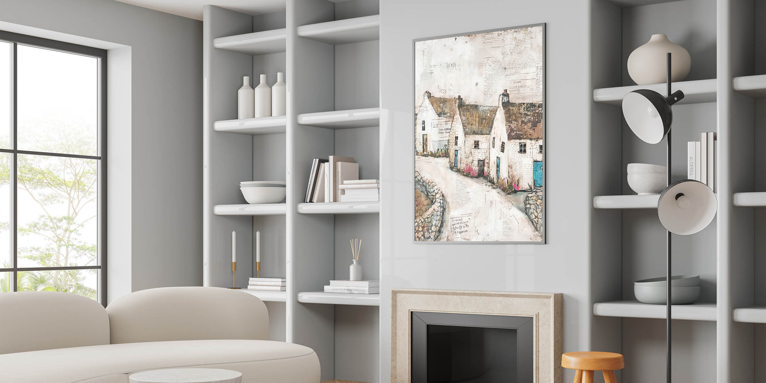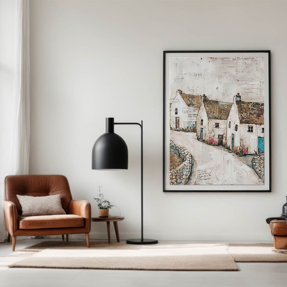 Capture the rustic charm of village architecture with this urban abstract canvas print. Featuring cozy, whitewashed cottages with textured stone pathways, this artwork highlights the simplicity and beauty of rural life. The earthy brown tones paired with subtle pops of color from the doors and flowers bring warmth and character, making this piece perfect for farmhouse and rustic decor themes.
