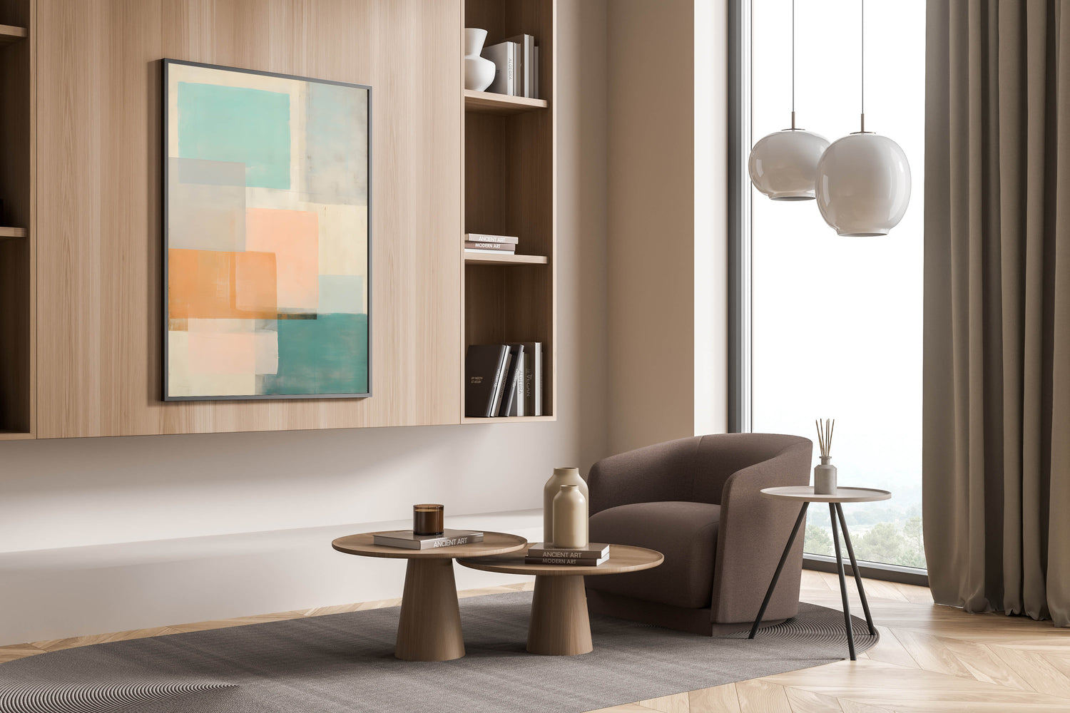 This pastel wall art adds a touch of elegance and calm to living rooms, bedrooms, or office spaces. Its soft colors and abstract forms make it a perfect choice for those who appreciate modern simplicity.