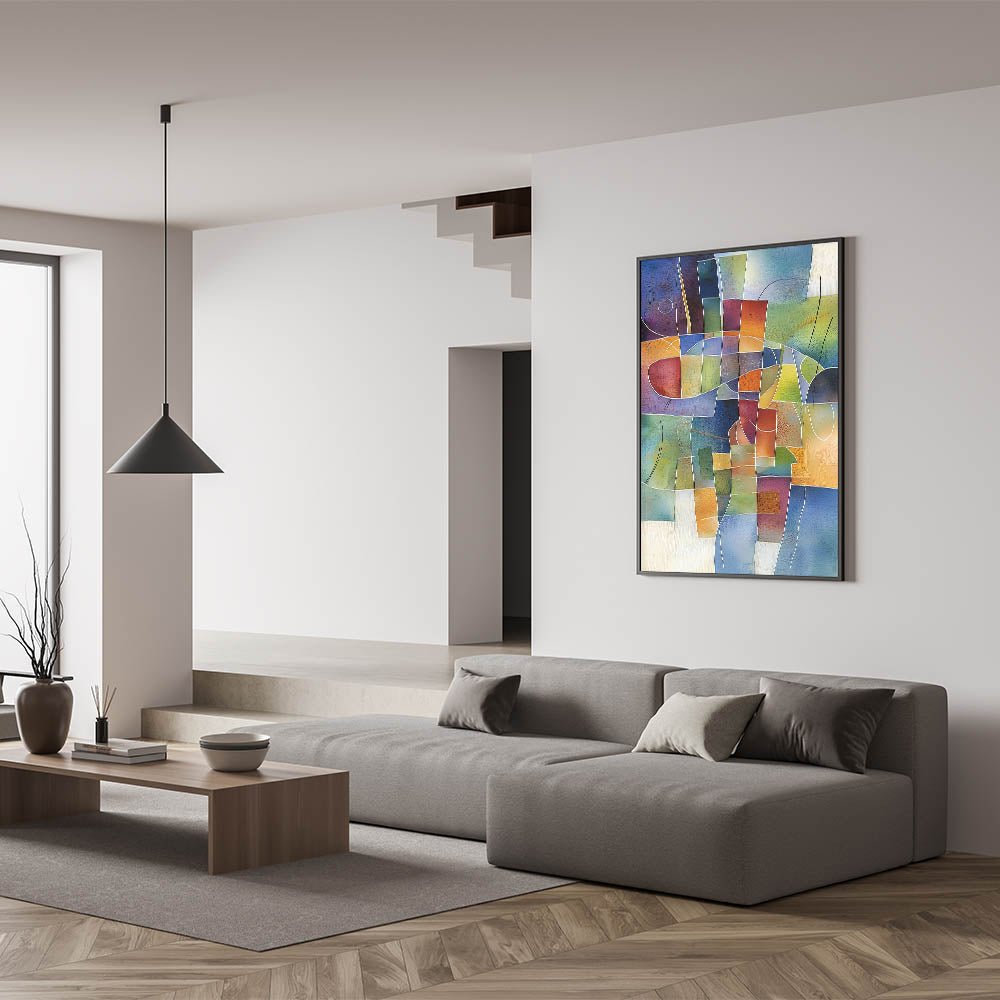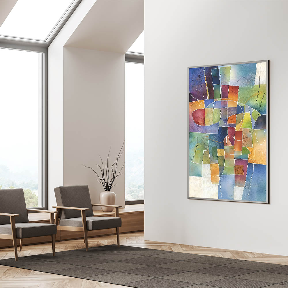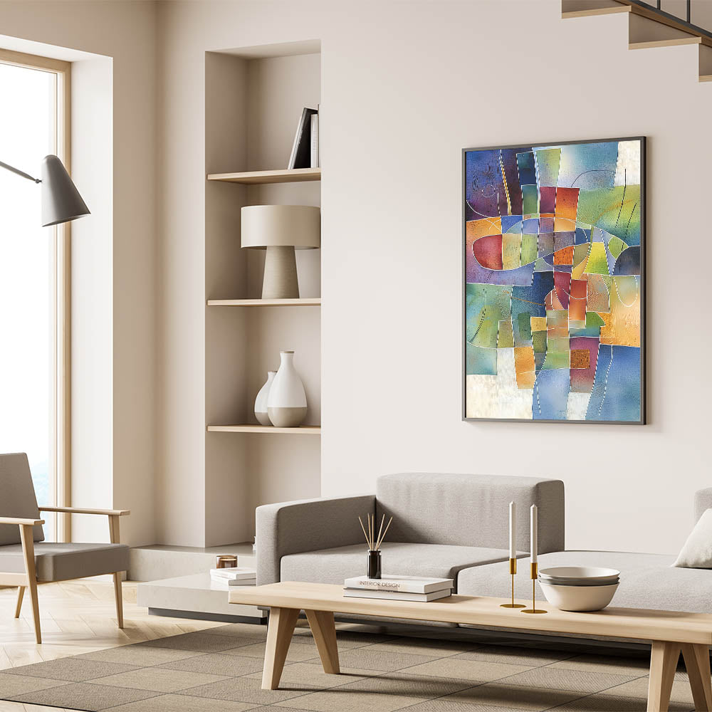 This piece is ideal for creating a focal point in contemporary spaces or adding vibrancy to neutral rooms. Its artistic balance of geometry and freeform elements makes it versatile for various decor styles, from bohemian to minimalist. Transform your walls with this captivating and colorful artwork.