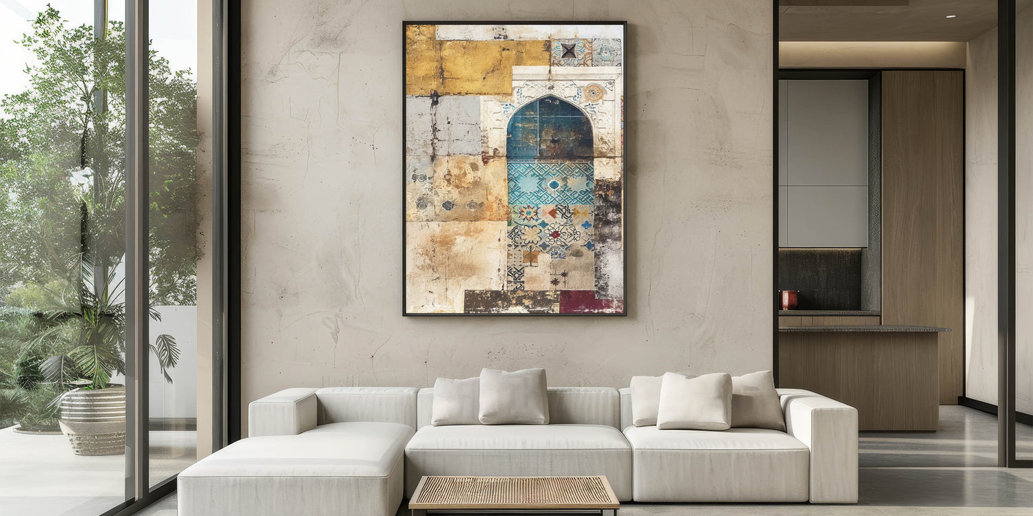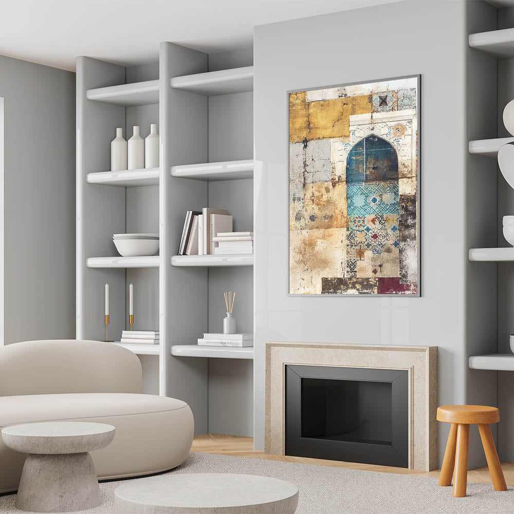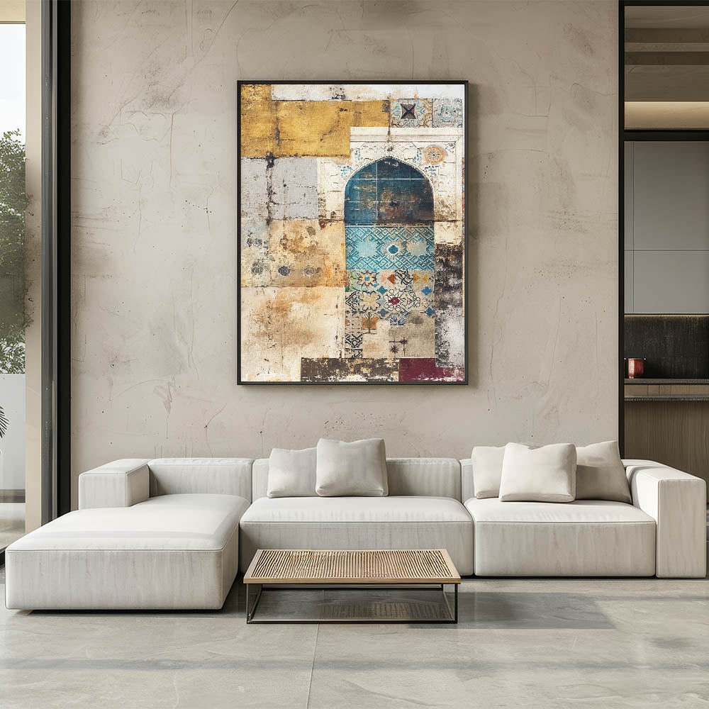Infuse your space with charm and heritage with this vintage mosaic abstract architecture canvas. Featuring intricate mosaic patterns in hues of beige, teal, and gold, this artwork embodies the timeless beauty of classical architecture. The fusion of textures and colors makes it an ideal piece for those who appreciate unique, artistic décor.