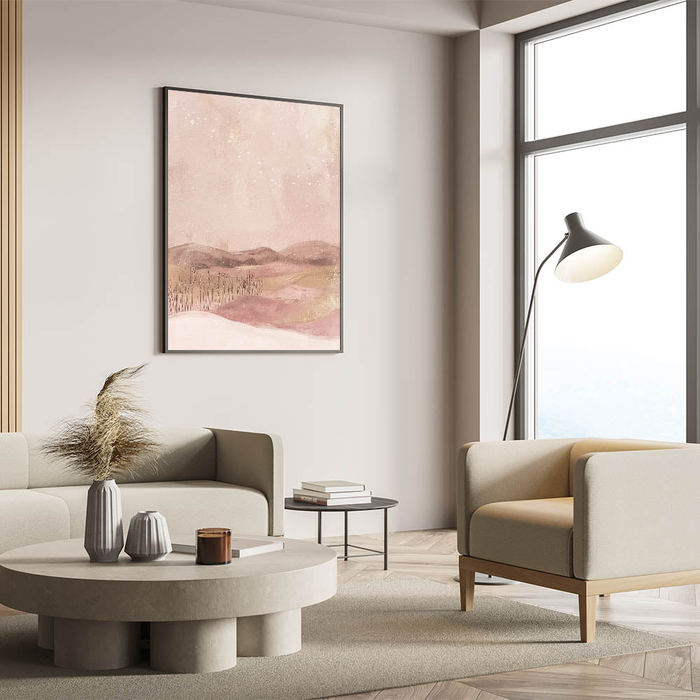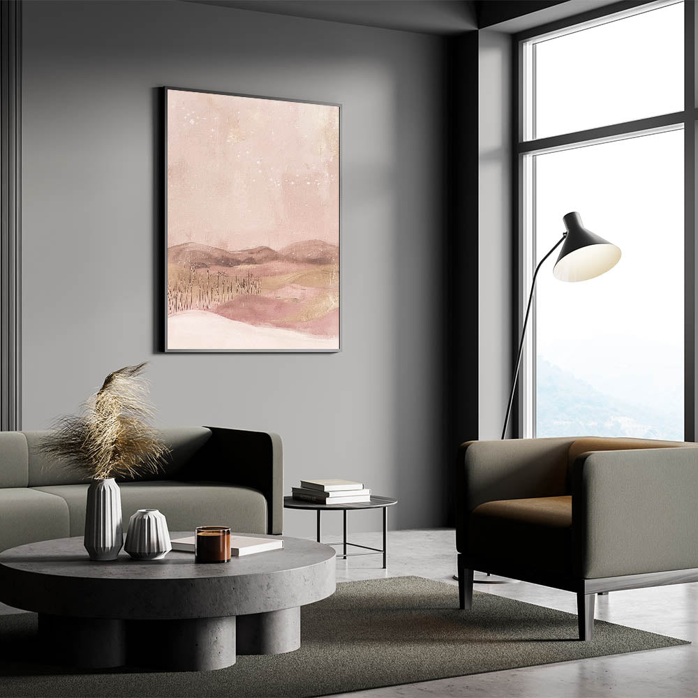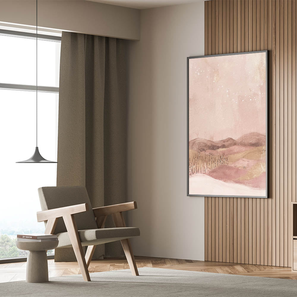 Create a dreamy ambiance in your space with this soft pink landscape abstract art. Featuring gentle shades of blush, beige, and pastel pinks, this artwork depicts a serene, starlit landscape that evokes peace and imagination. Ideal for those who enjoy unique, calming decor, this piece is a perfect fit for modern, minimalist, or whimsical decor themes.