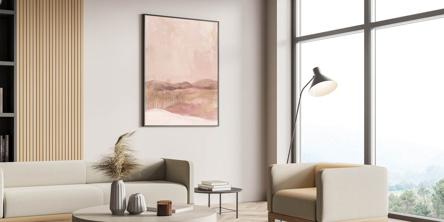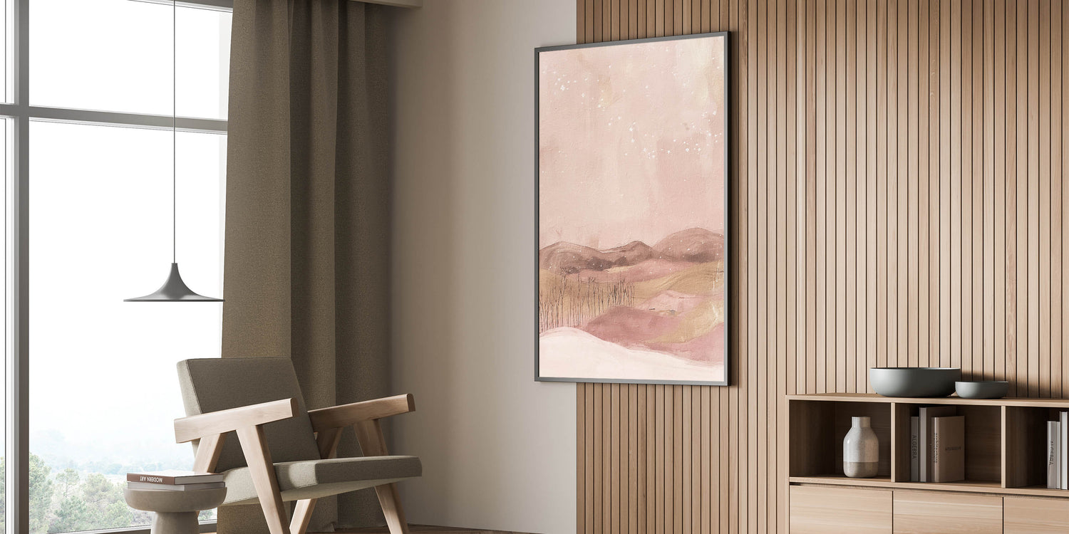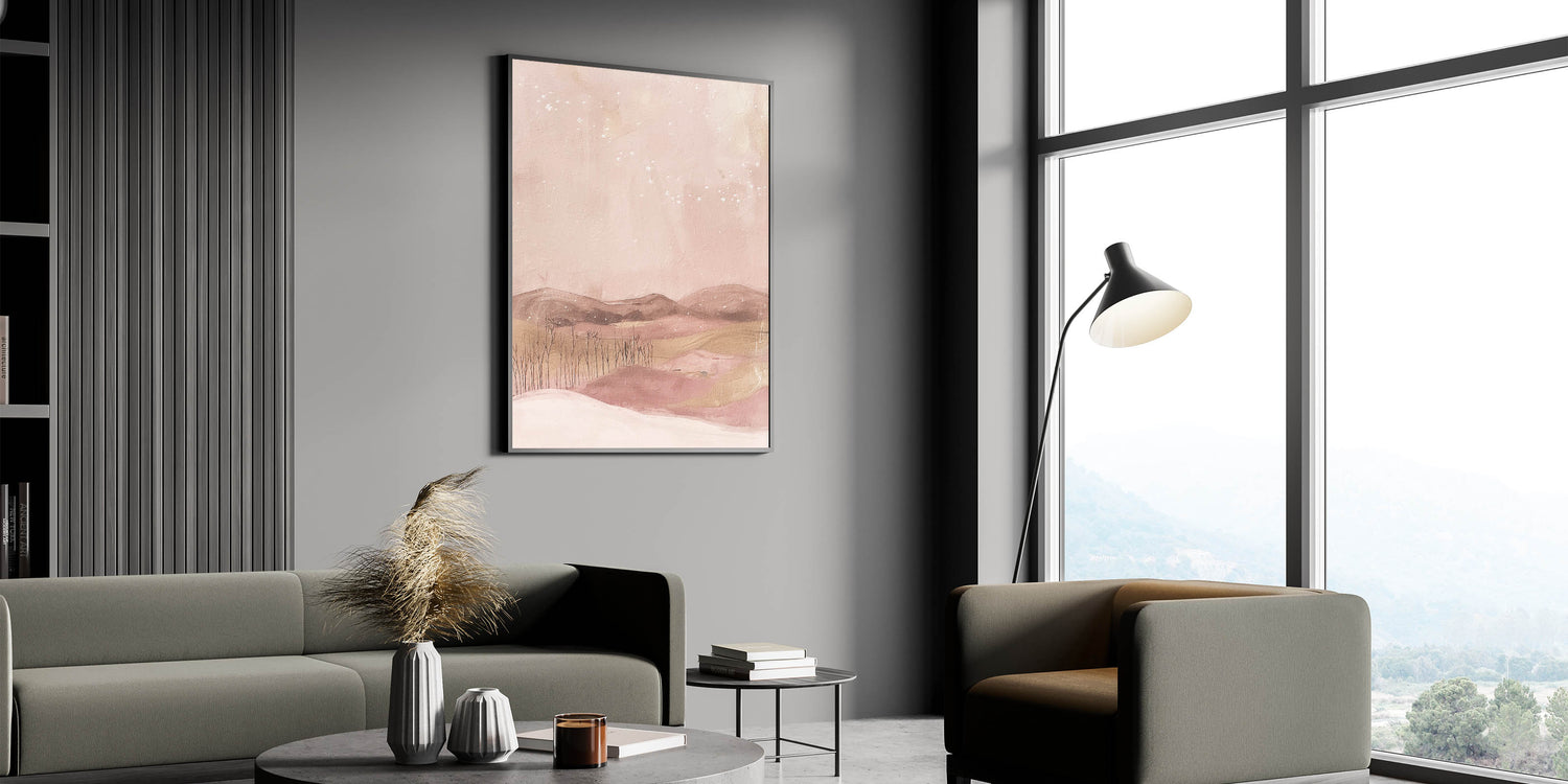 Create a dreamy ambiance in your space with this soft pink landscape abstract art. Featuring gentle shades of blush, beige, and pastel pinks, this artwork depicts a serene, starlit landscape that evokes peace and imagination. Ideal for those who enjoy unique, calming decor, this piece is a perfect fit for modern, minimalist, or whimsical decor themes.