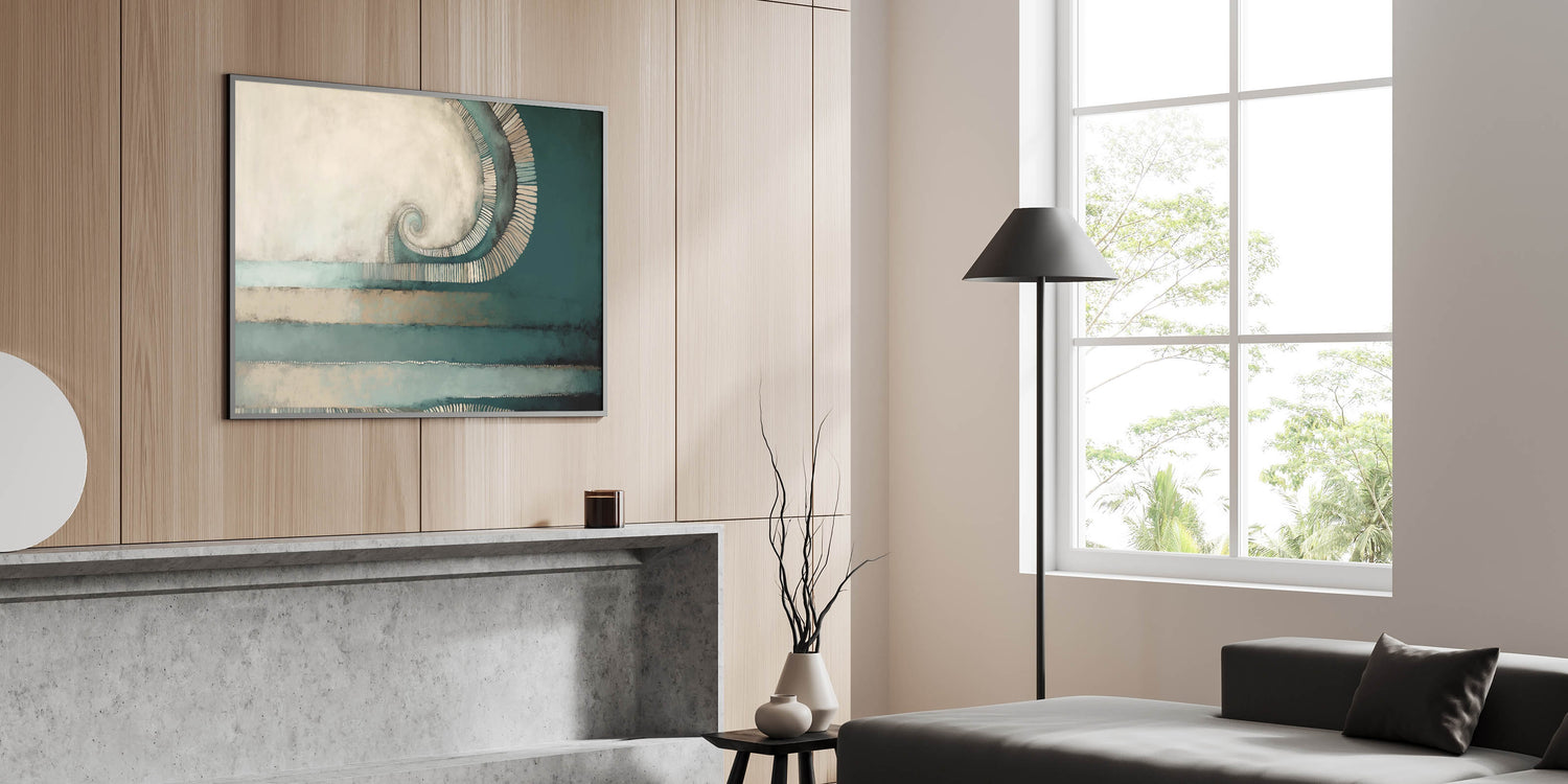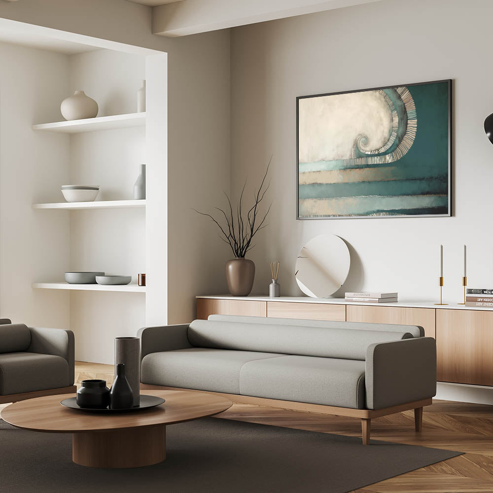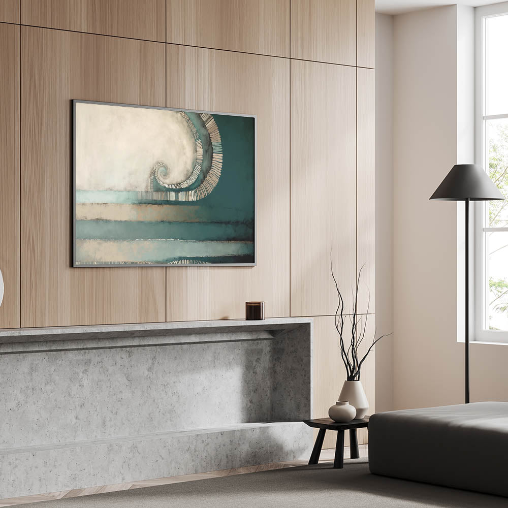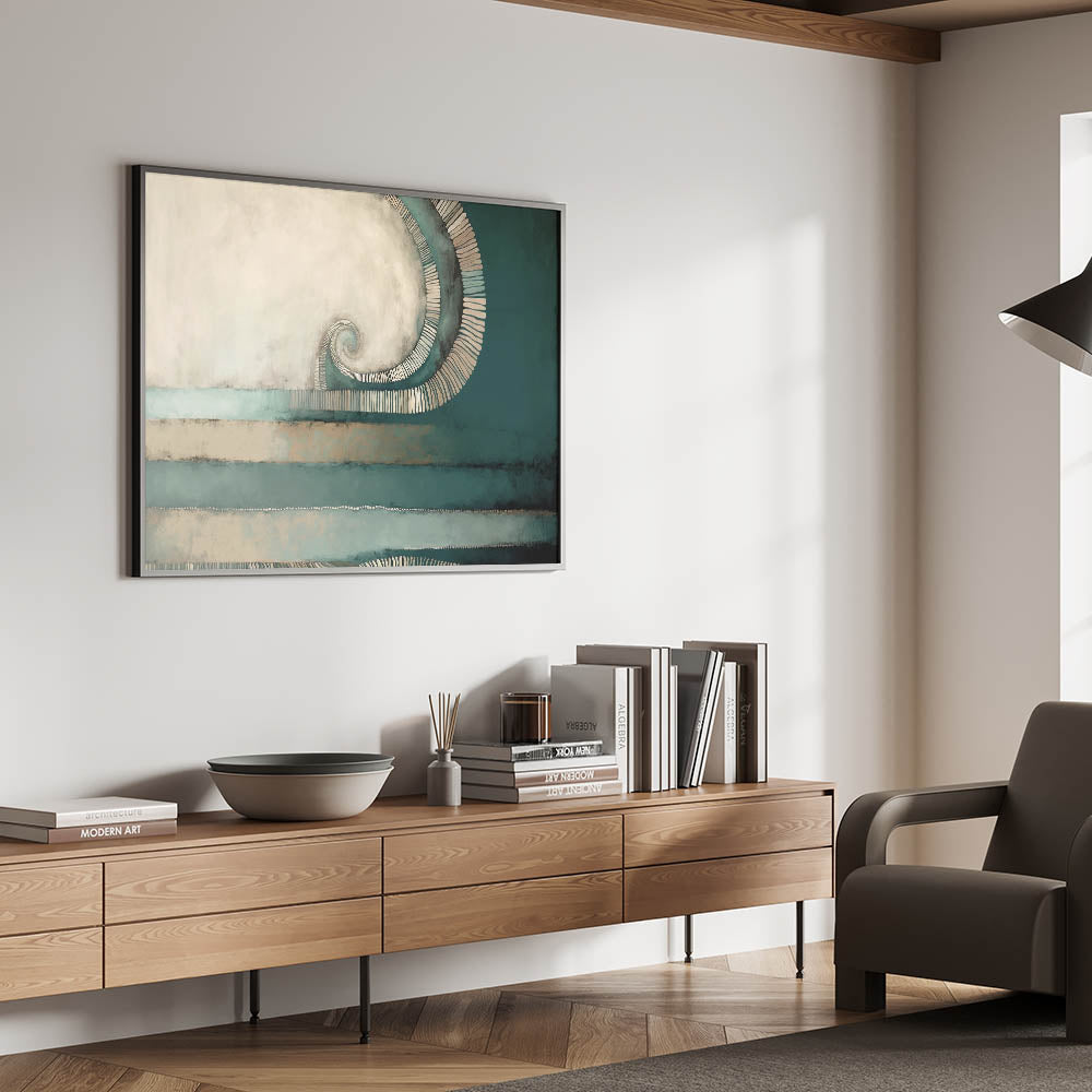 Introduce a sense of elegance and movement to your décor with this beautiful spiral abstract artwork. The piece features a mesmerizing spiral element, surrounded by soothing shades of deep teal and warm beige. The textured layers and flowing lines add a dynamic, yet calming effect, making it a perfect choice for contemporary and minimalist interiors.
