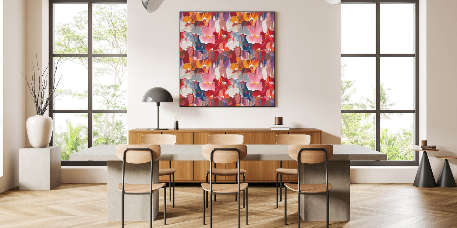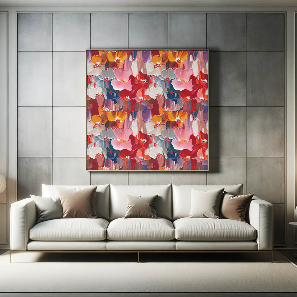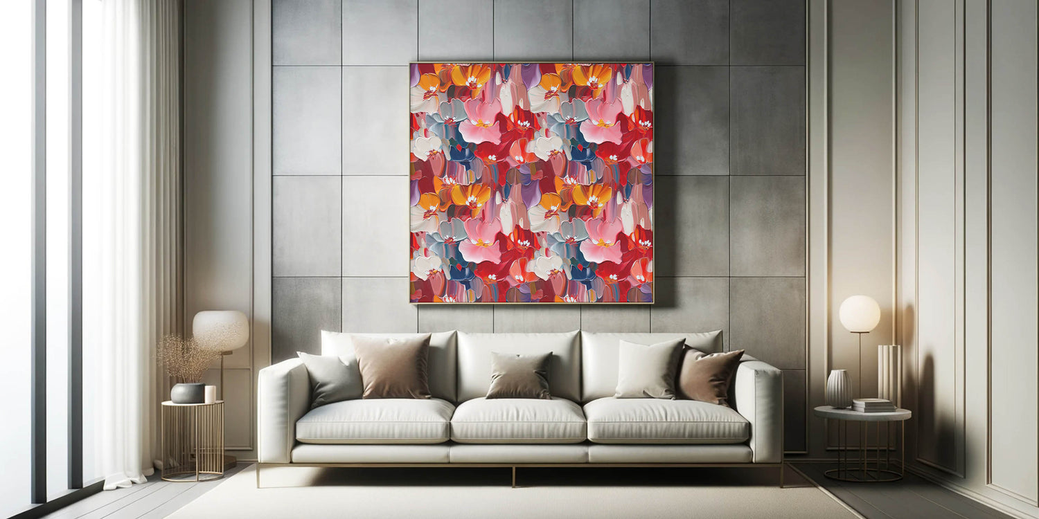 Transform your space with this unique abstract floral art that combines vibrant colors with dynamic flower patterns. This piece is perfect for art lovers who appreciate contemporary art and want to make a joyful statement with their wall decor.