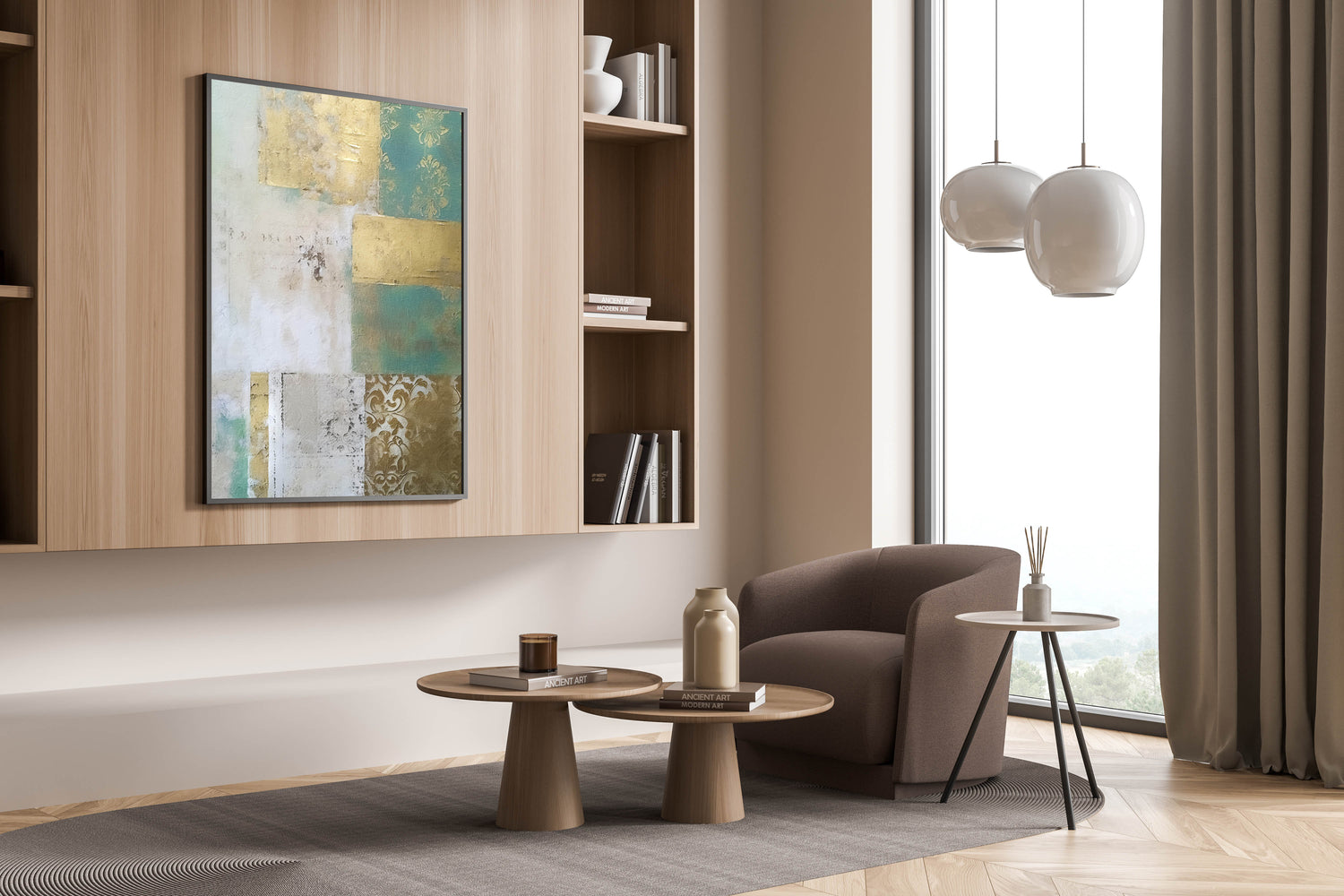Bring a touch of elegance and luxury to your space with this Vintage Charm Abstract Line Art. Featuring a beautiful blend of teal, gold, and white, this piece showcases intricate patterns and layered textures that evoke a sense of timeless sophistication. The delicate gold leaf accents add a touch of opulence, making it an ideal choice for those who appreciate refined and classic design elements.