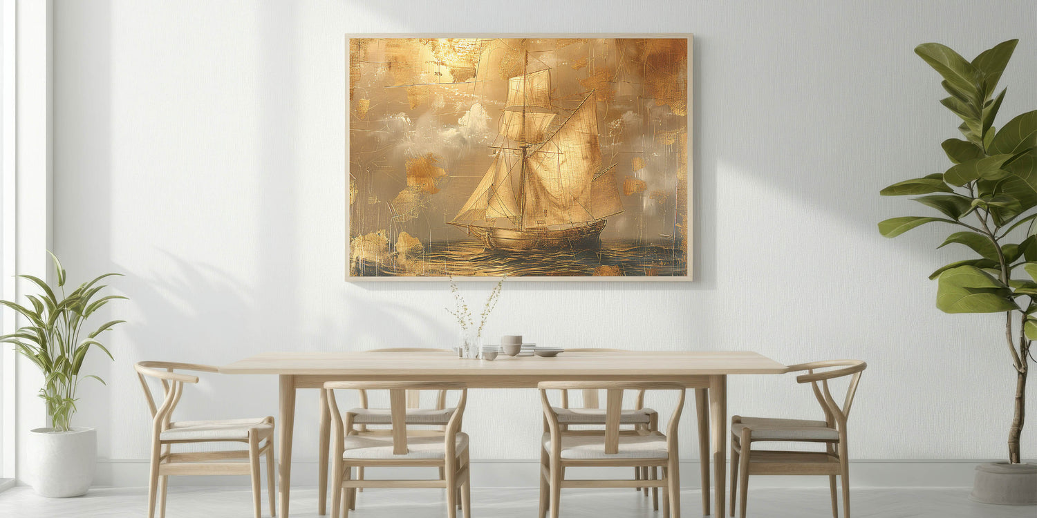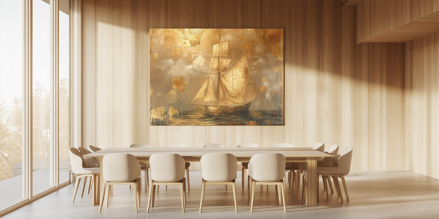 This sailboat canvas art is perfect for those who appreciate the classic beauty of maritime scenes. Its golden hues and textured effect make it a statement piece that enhances any interior with sophistication and charm.