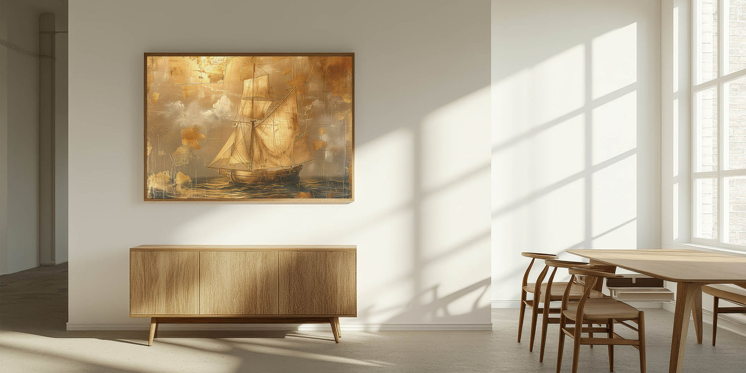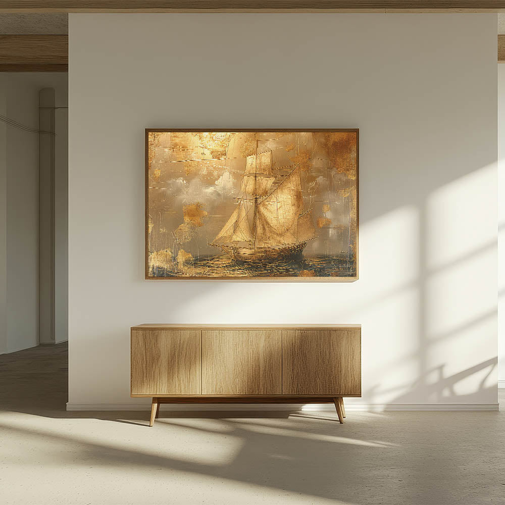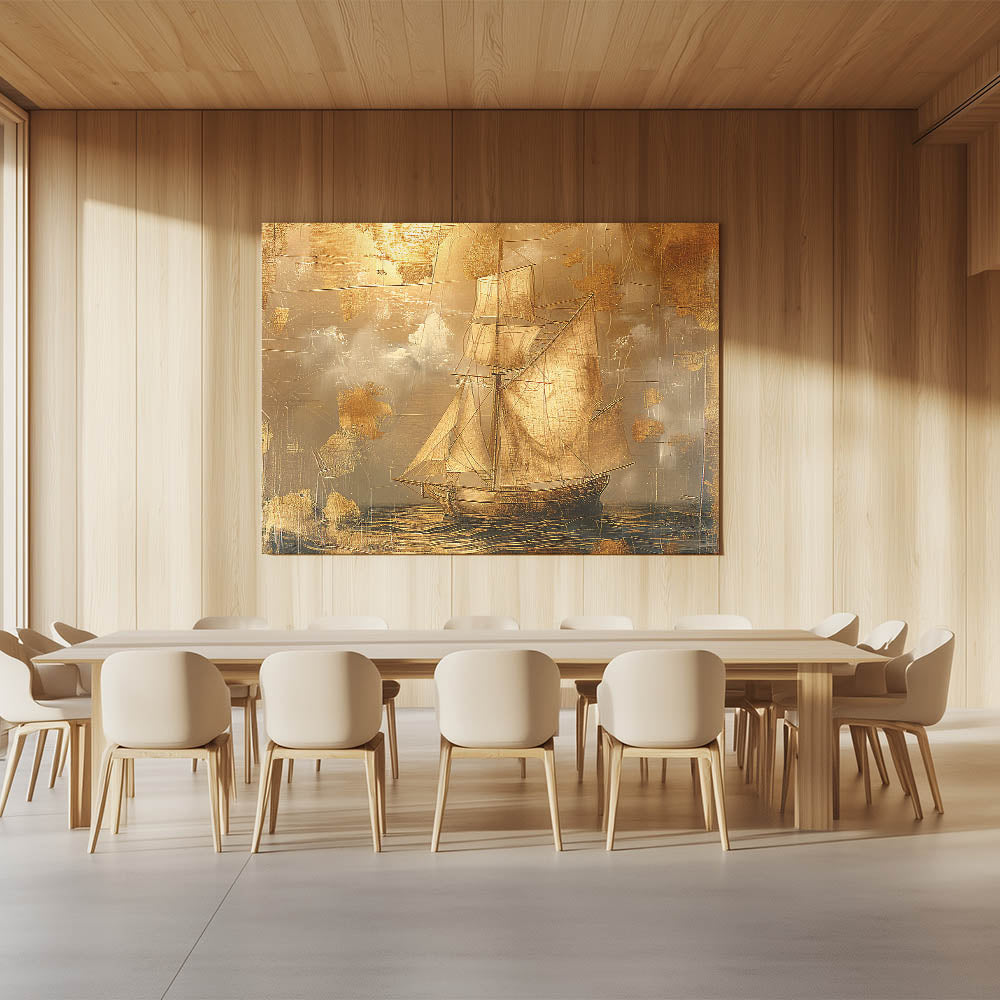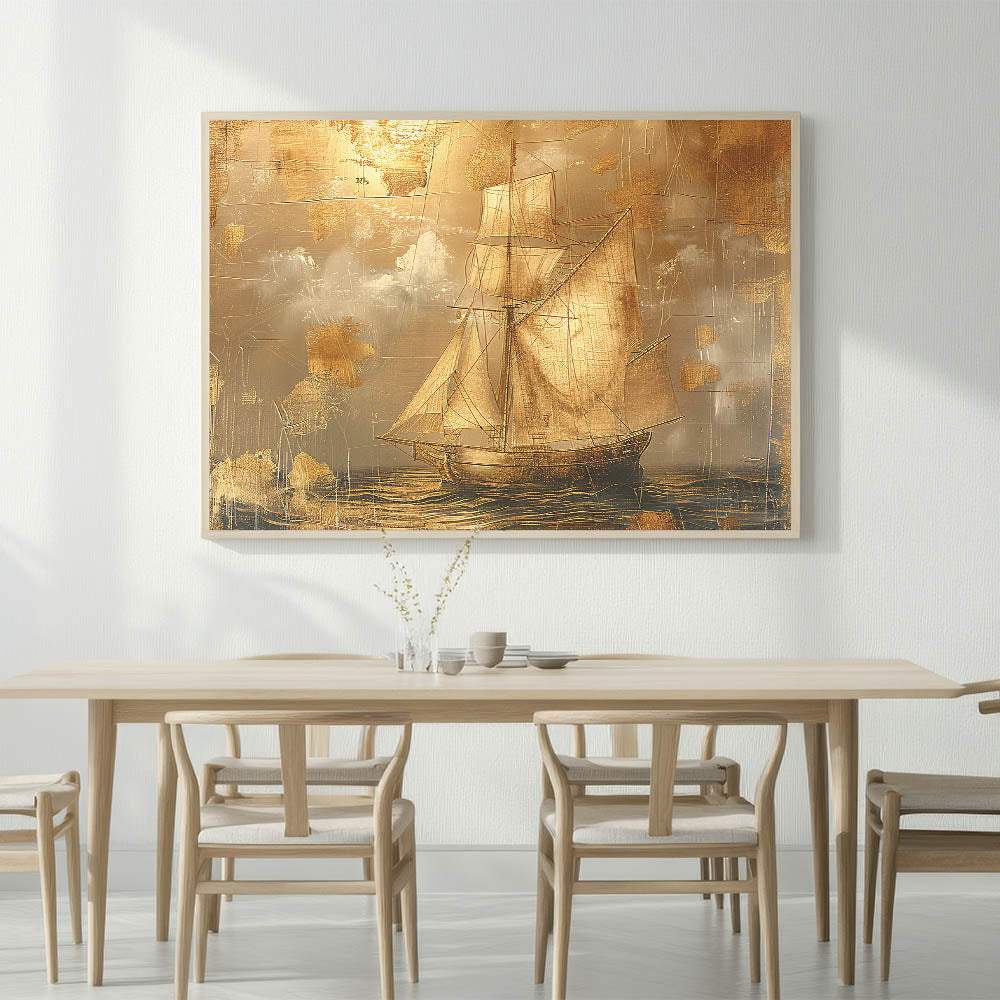 Bring a touch of vintage elegance to your decor with this stunning canvas artwork, featuring a golden sailboat against a textured, metallic-inspired background. This piece combines intricate detailing with a rich gold and beige palette, creating a sophisticated look that captures the essence of timeless maritime adventures. Perfect for classic, nautical, or luxury-themed spaces, this artwork brings warmth and style to any room.