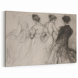 This vintage figurative sketch art portrays a group of women in elegant, flowing attire, delicately drawn with soft, expressive strokes. The intricate details and fluid lines capture the essence of timeless grace and femininity. Perfect for lovers of classic and vintage designs, this stunning figurative canvas print adds sophistication and charm to any space.