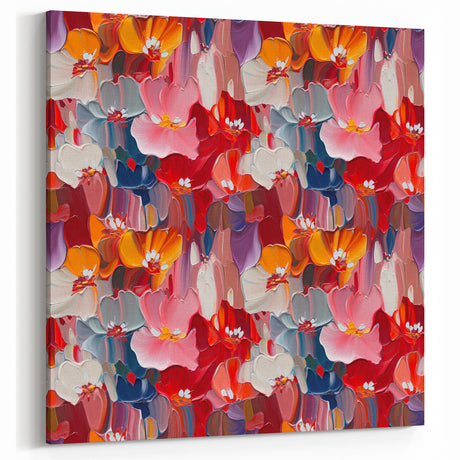 • Abstract floral canvas artwork showcasing vibrant colors and intricate patterns, displayed in a side view to highlight its stretched design, perfect for modern decor.