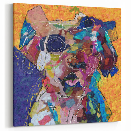 • Abstract figurative stretched canvas artwork showcasing vibrant colors and dynamic shapes, viewed from the side, ideal for modern home decor and artistic expression.