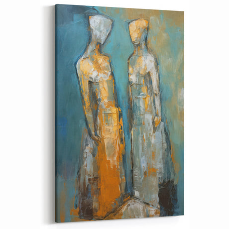 • Abstract figurative stretched canvas artwork showcasing vibrant colors and dynamic shapes, ideal for modern home decor, viewed from the side to highlight its depth and texture.