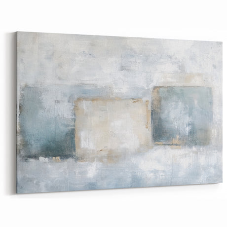 • Abstract minimalist wall art on stretched canvas showcasing soft pastel colors, featuring geometric shapes and smooth lines, ideal for contemporary decor.